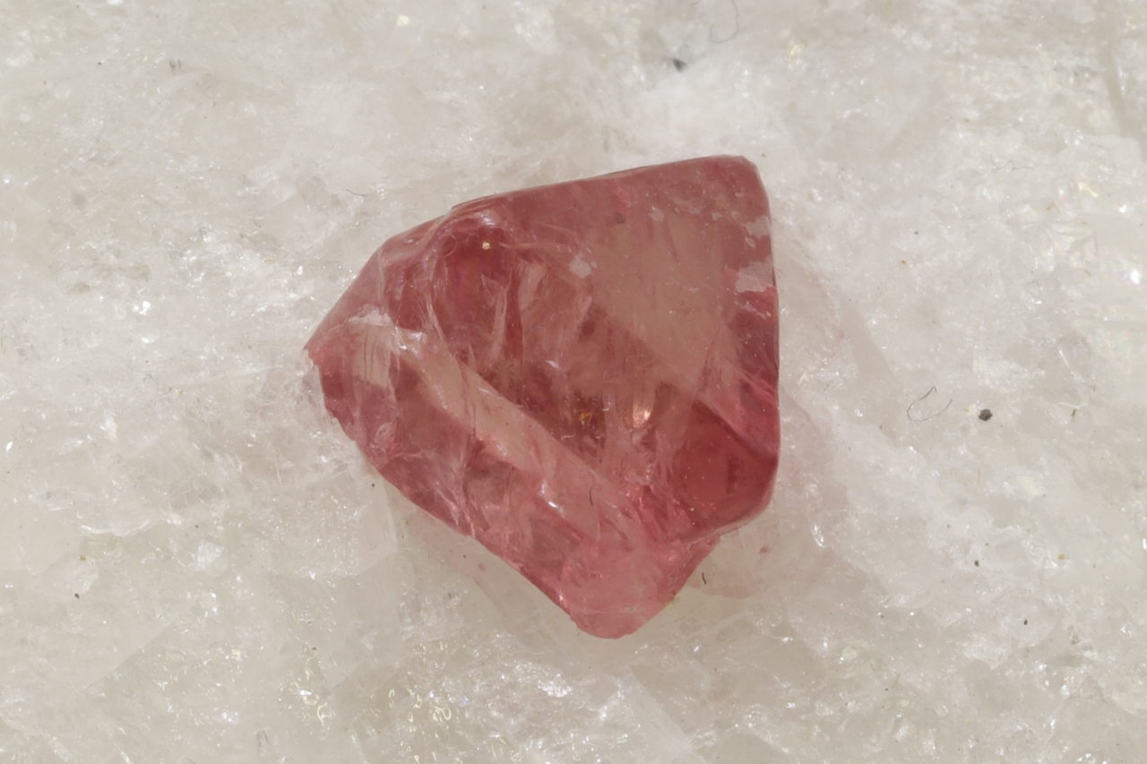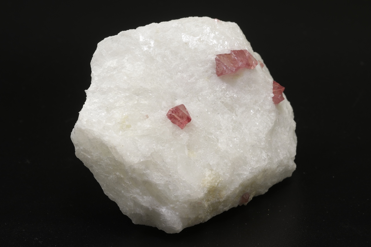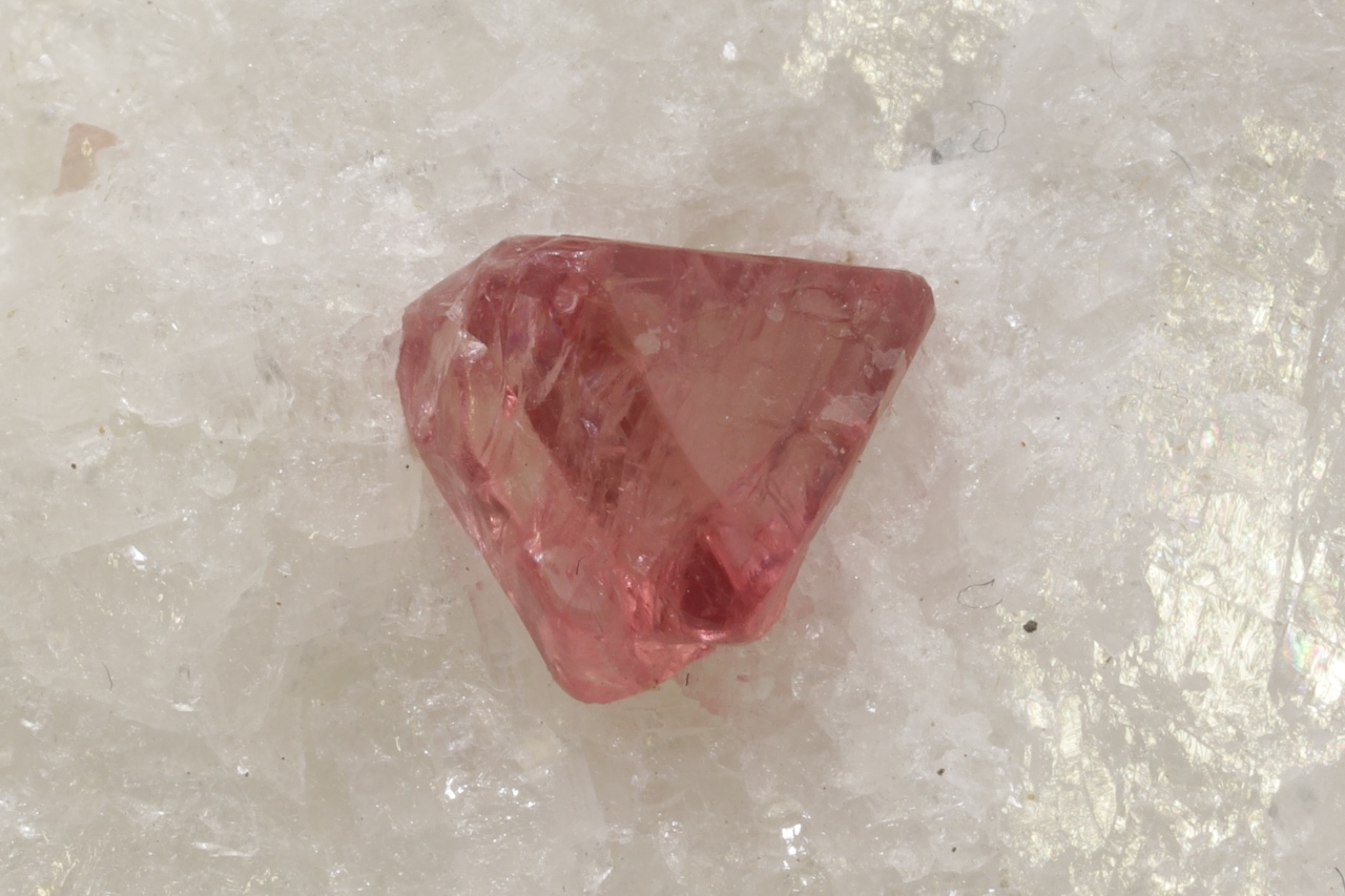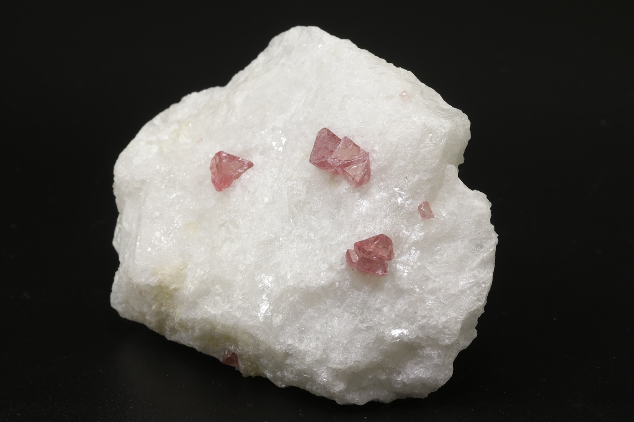 Beautiful crystals and clusters of light red, transparent Spinel crystals grown in contrasting white Calcite. The largest crystal is 7 mm in size.