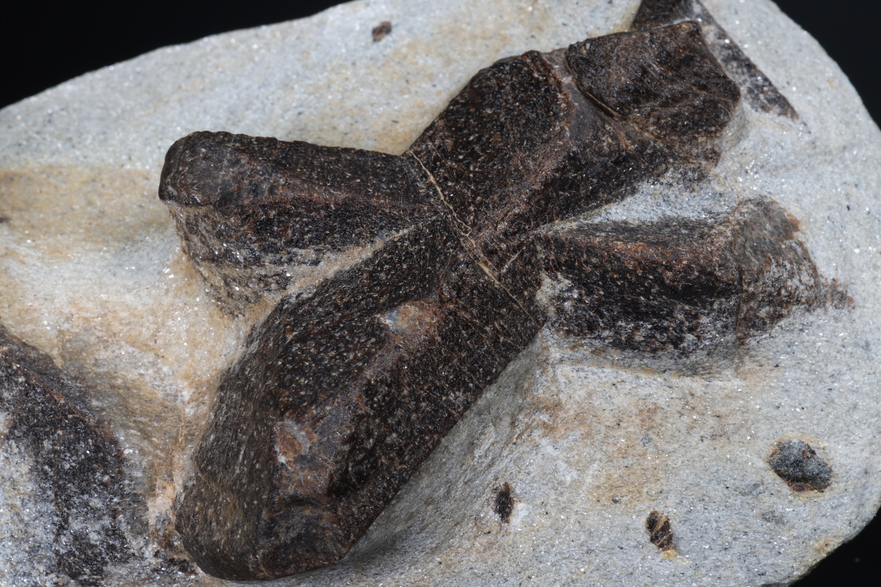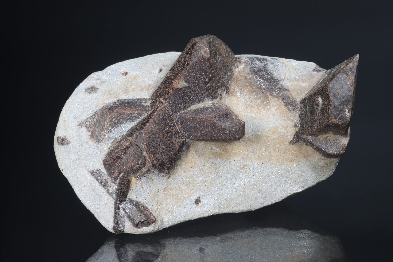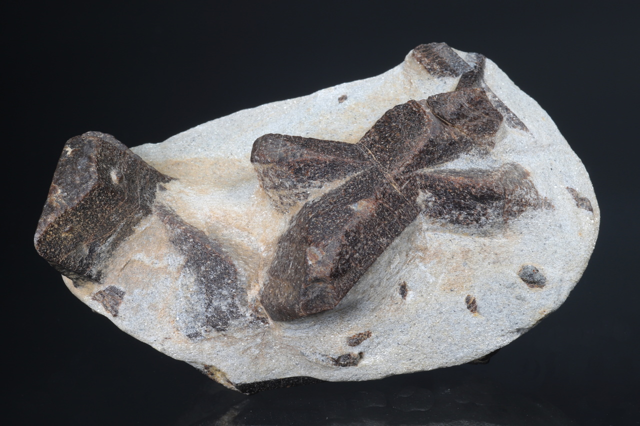 Beautiful cross-shaped staurolite twins of up to 68 mm in light mica. Very aesthetic contrast sample of staurolite from a classic Russian locality.