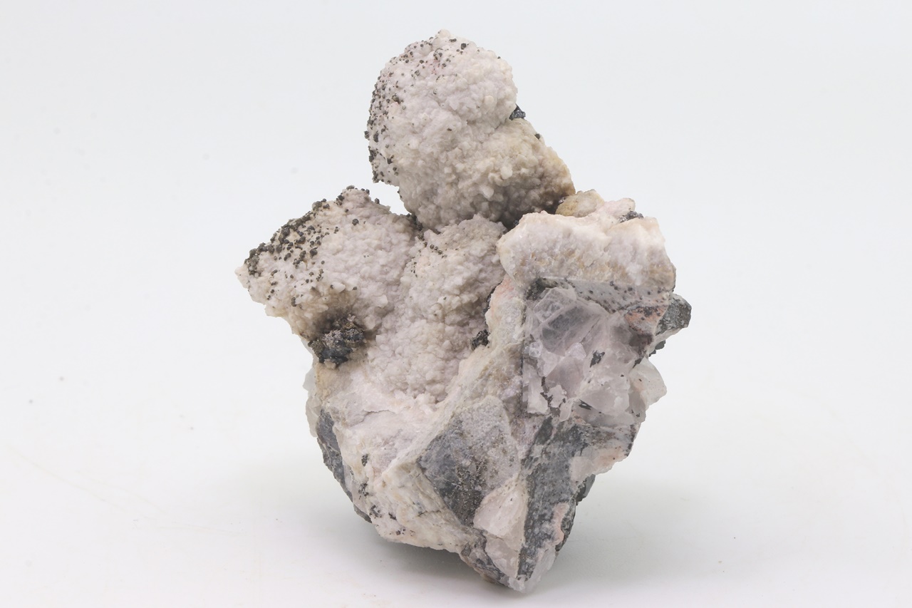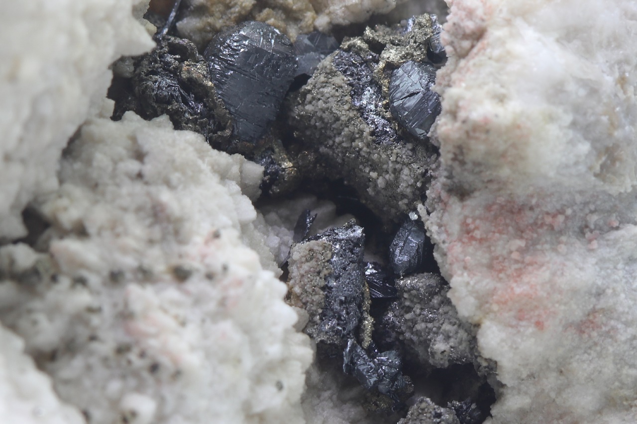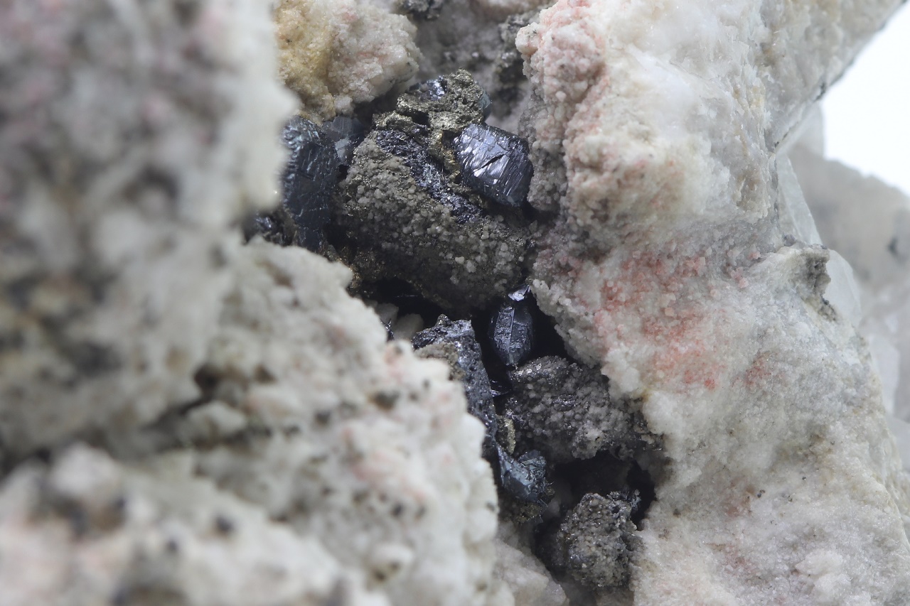A very high-quality and aesthetic specimen of silver ores from the central Březohorské deposit. Several centimeter-sized tabular crystals of white baryte are covered with bluish-white sugary dolomite. Glossy grooved crystals of stefanite in the central cavity reach sizes of up to 5 mm. Quite atypically for the Březohorské deposit, some stefanite crystals on the outside are being pushed by native silver, best seen on the stefanite crystal in the left part of the specimen, outside the main cavity. Next to the stefanite crystals, a hexagonal tabular crystal of polybasite is present in the main cavity, with typical triangular growths on the basal plane.