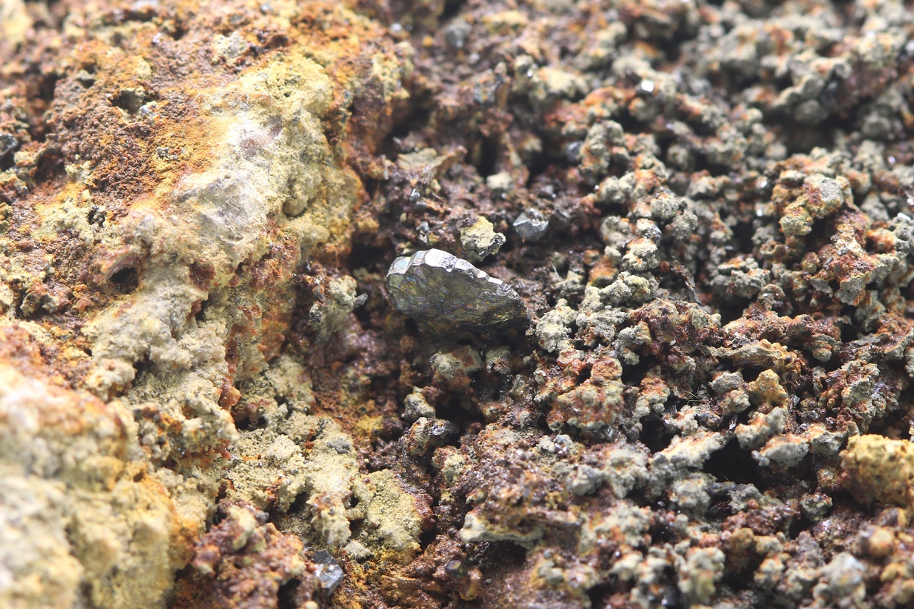 Specimen covered with metallic lustrous crystals of stefanite, among which stands out a 5 mm large stefanite in the center of the specimen.