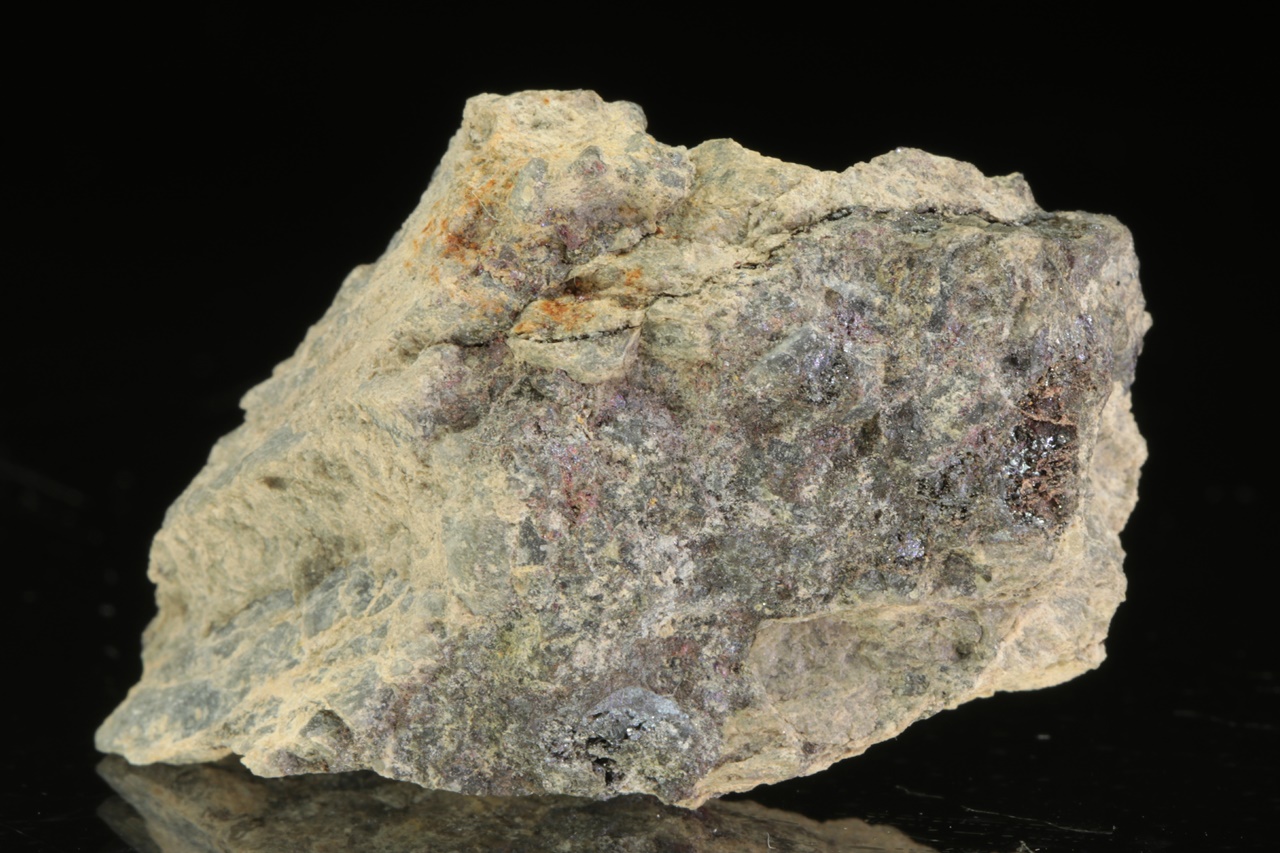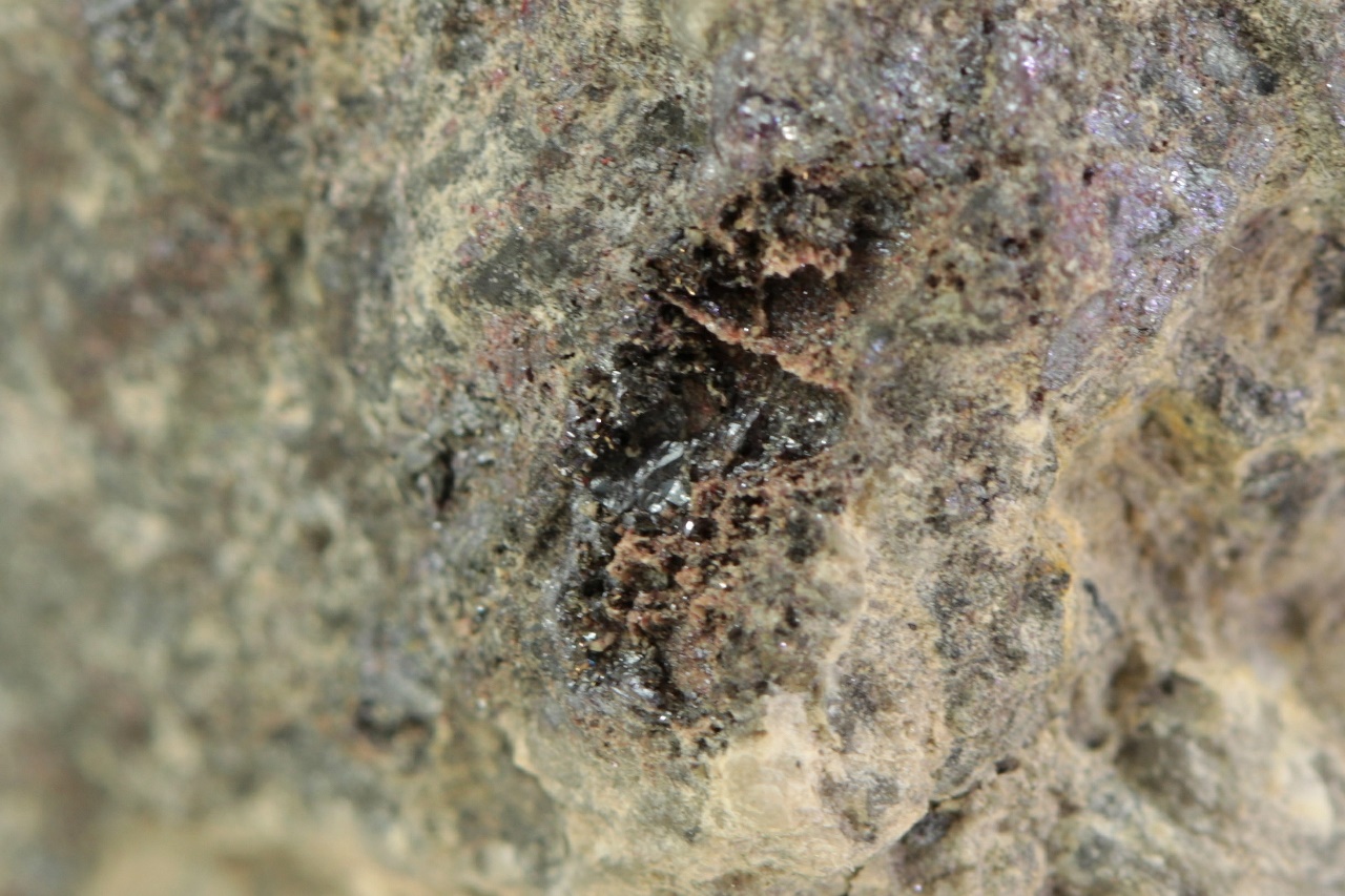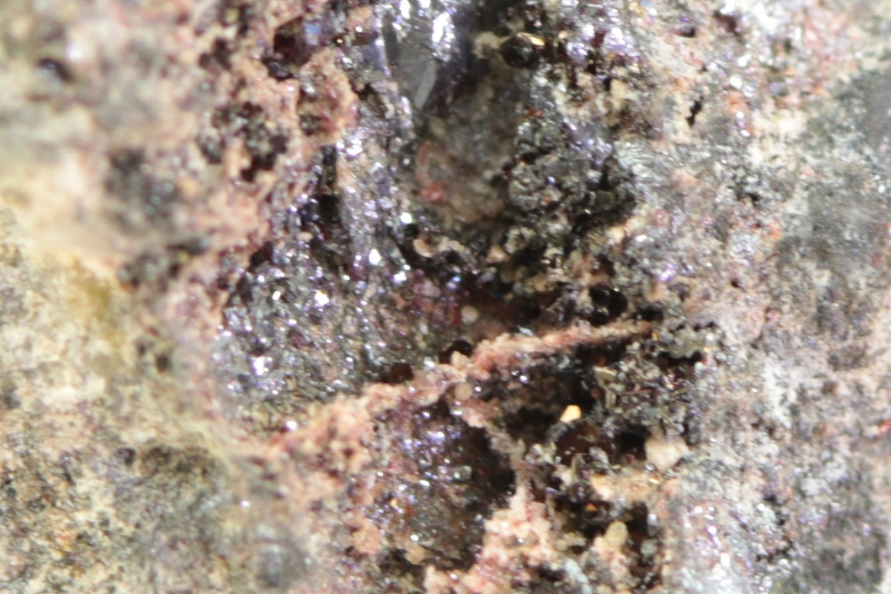 Glossy, black sternbergite plates with red proustite grown in a cavity measuring 5 × 3 mm.