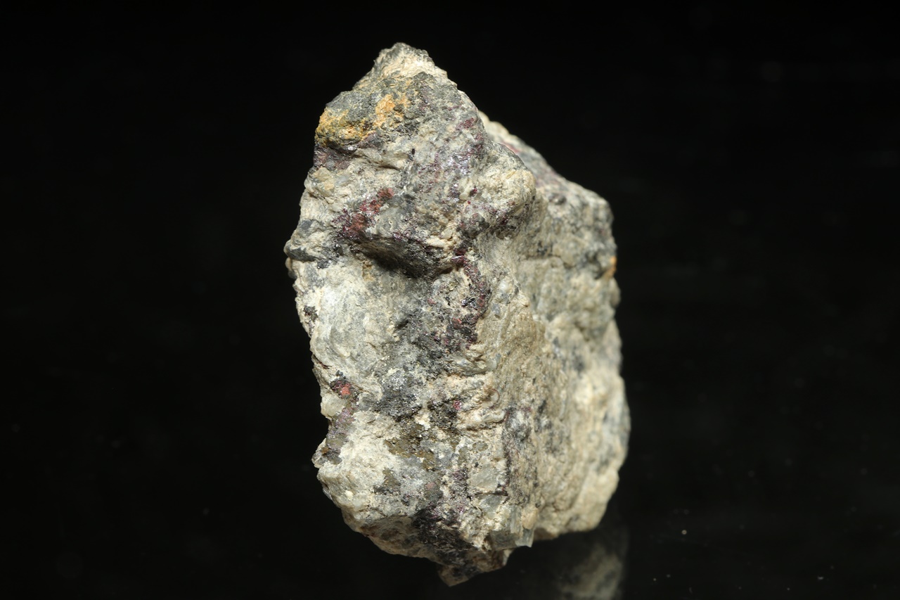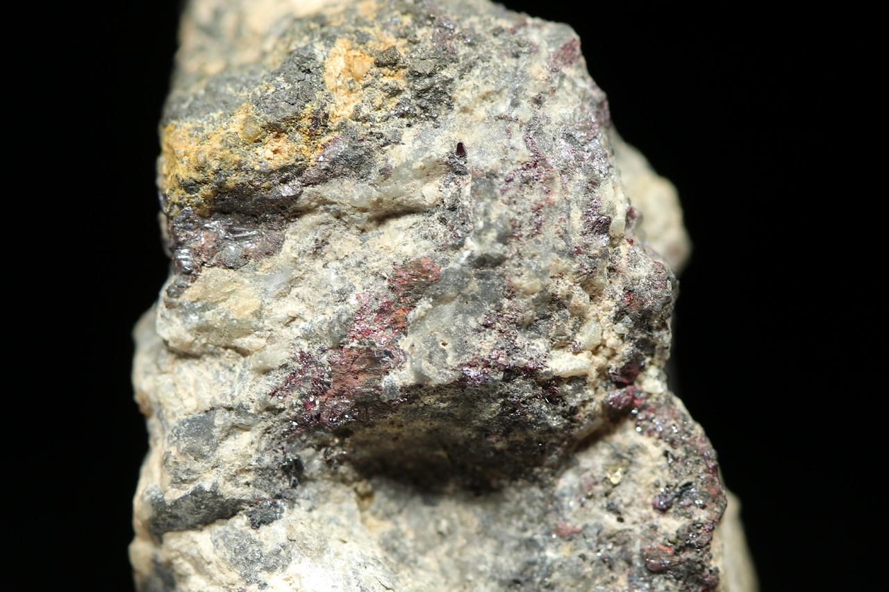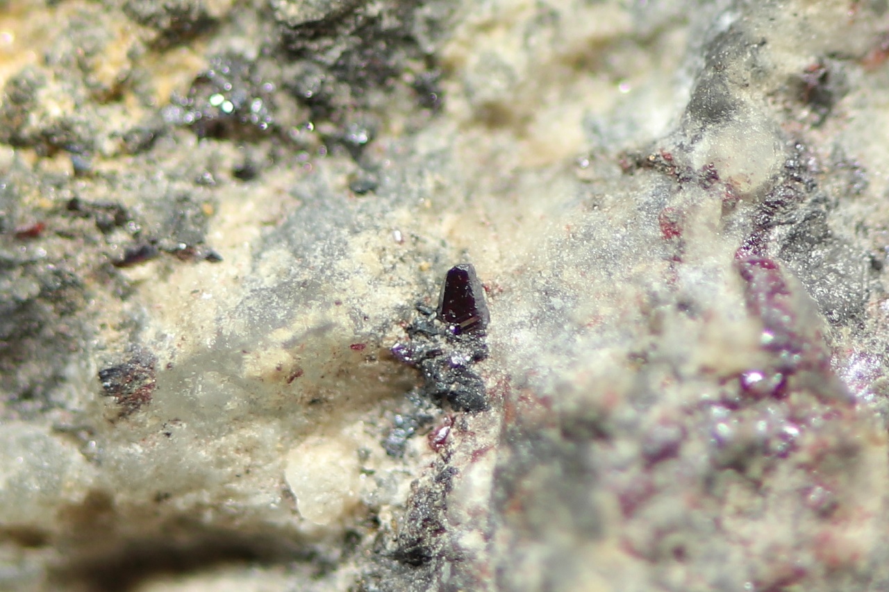 Specimen of Jachymov vein matter overgrown with red Proustit and with small black hexagonal tablets of Sternbergit in several places. Jachymov is its type locality .