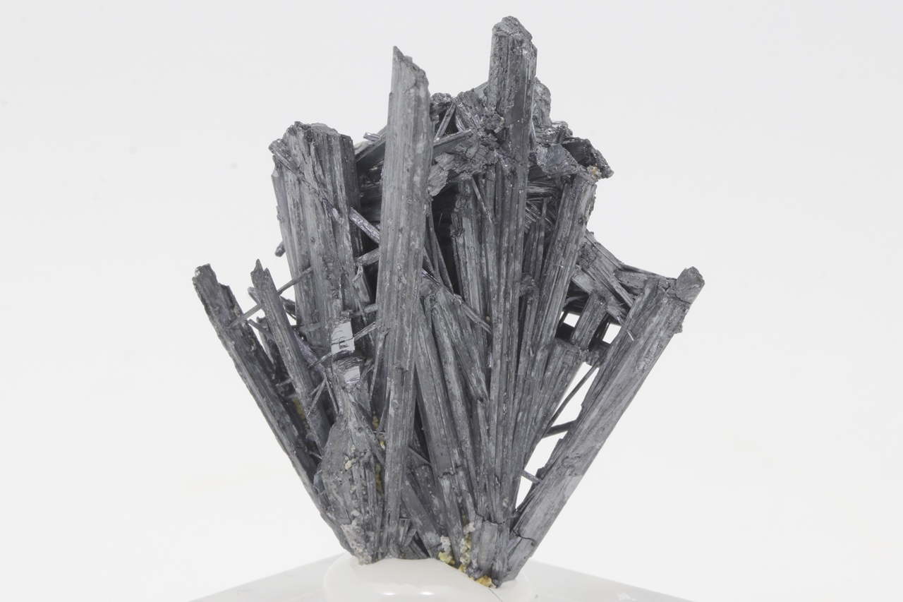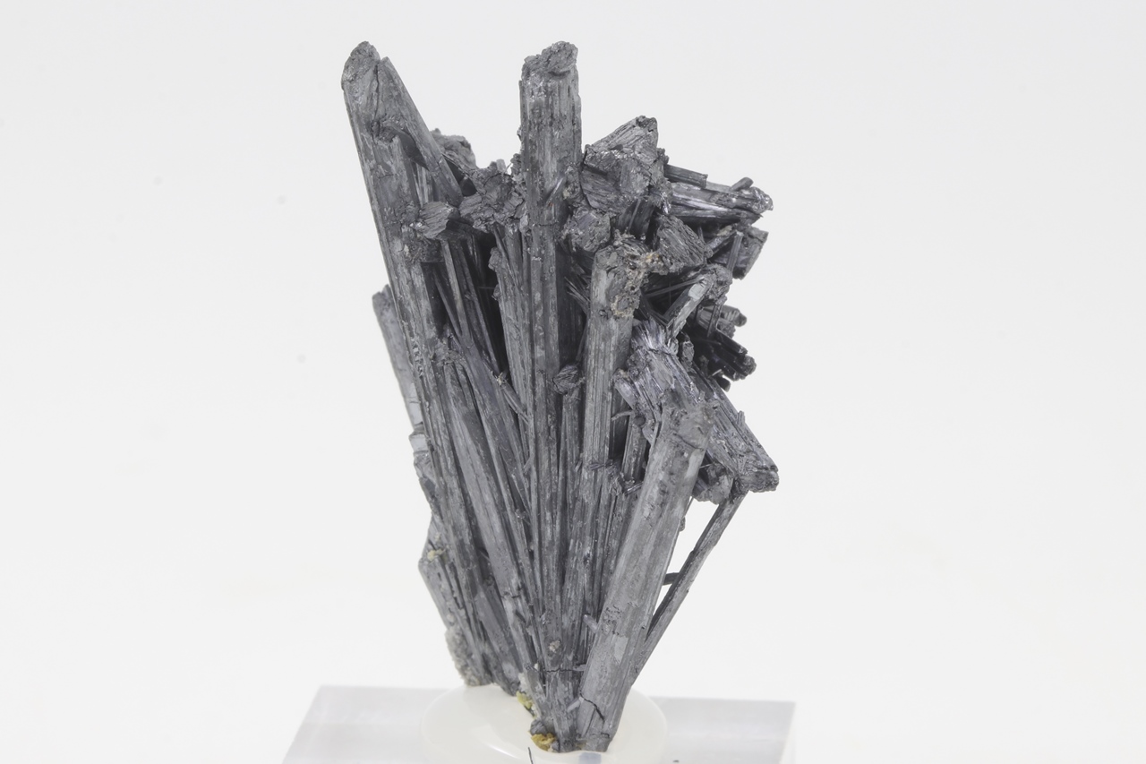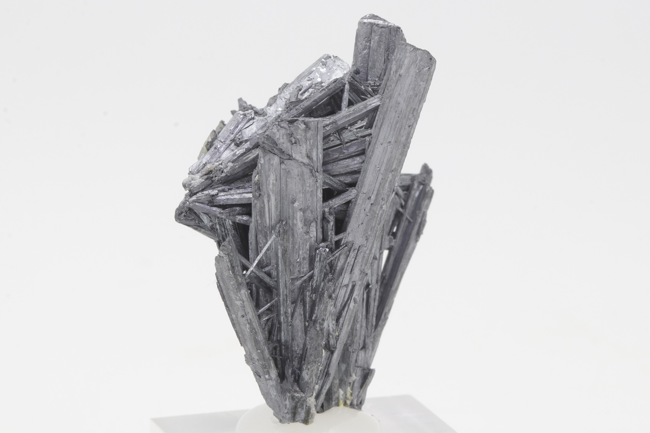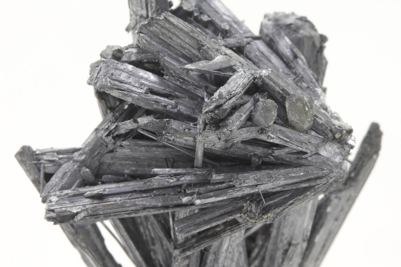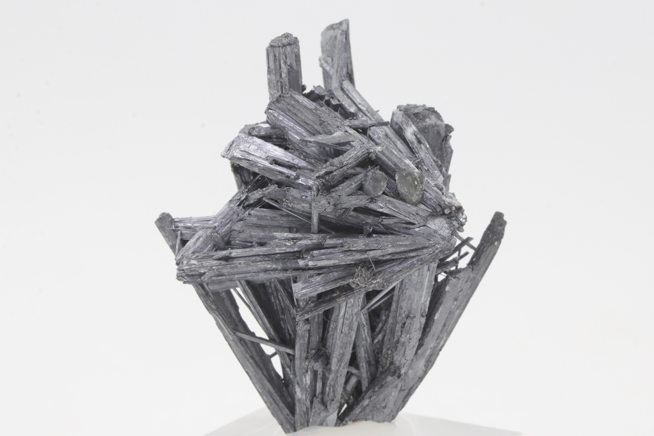 Two perpendicularly intergrown clusters of Stibnite crystals. The largest crystal is 4 cm in size.【4:1†cz_to_en.json】
