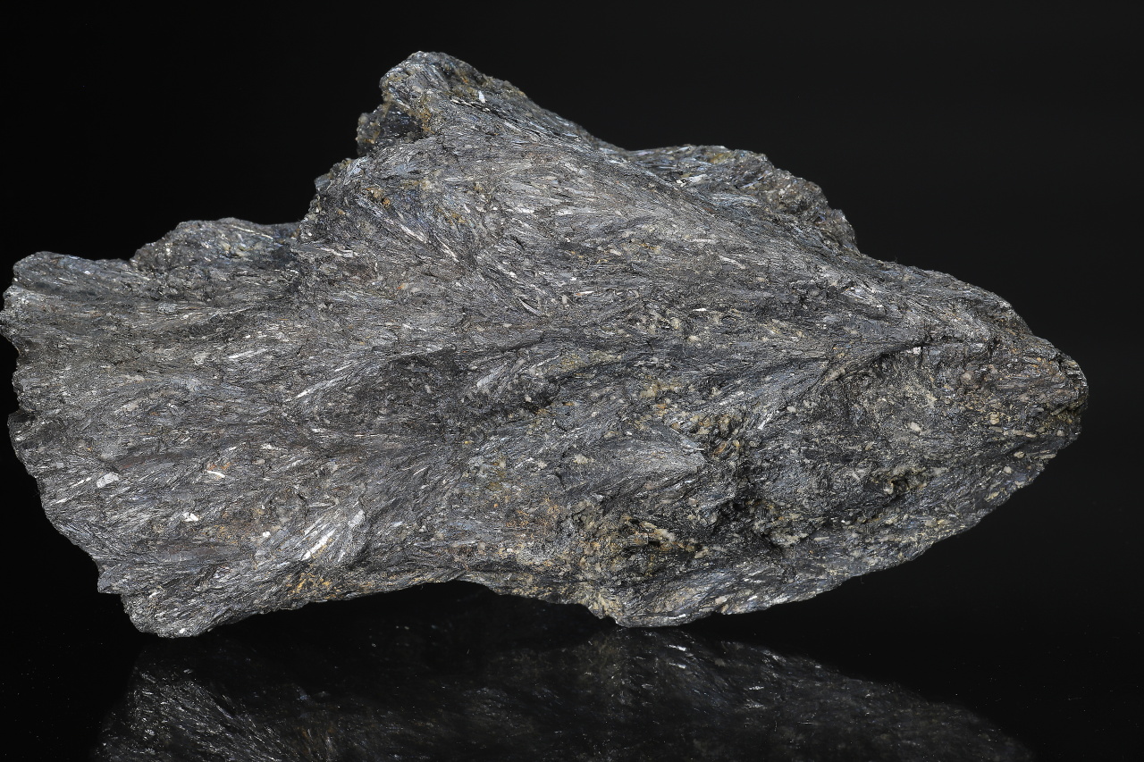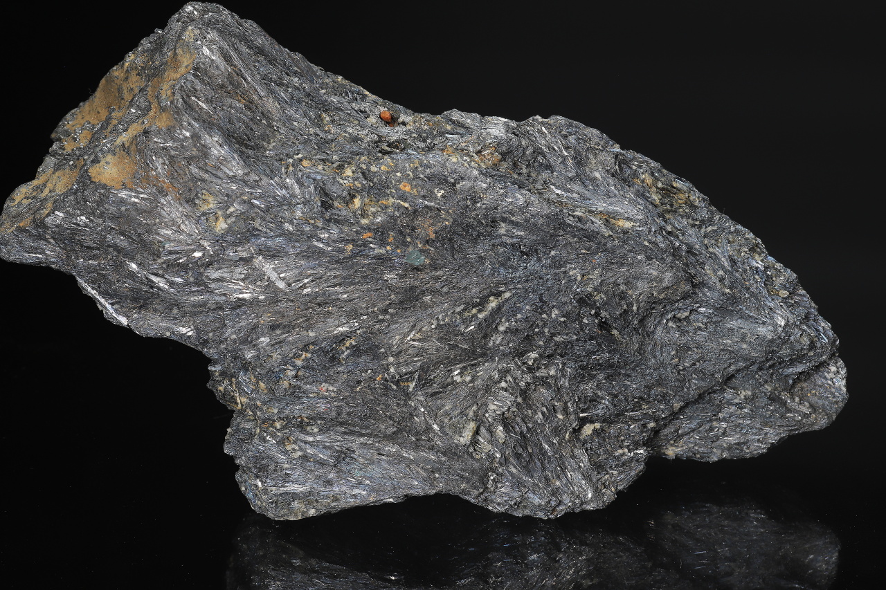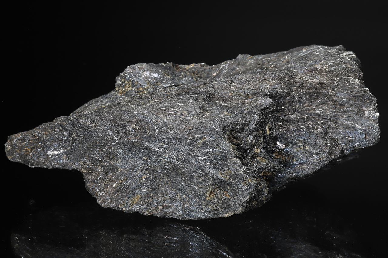 Massive sample composed largely of columnar crystals of metallic gray antimonite, which in places transitions into short crystals growing into cavities. Large specimen of antimony ore from the mines in Bohutín near Příbram.