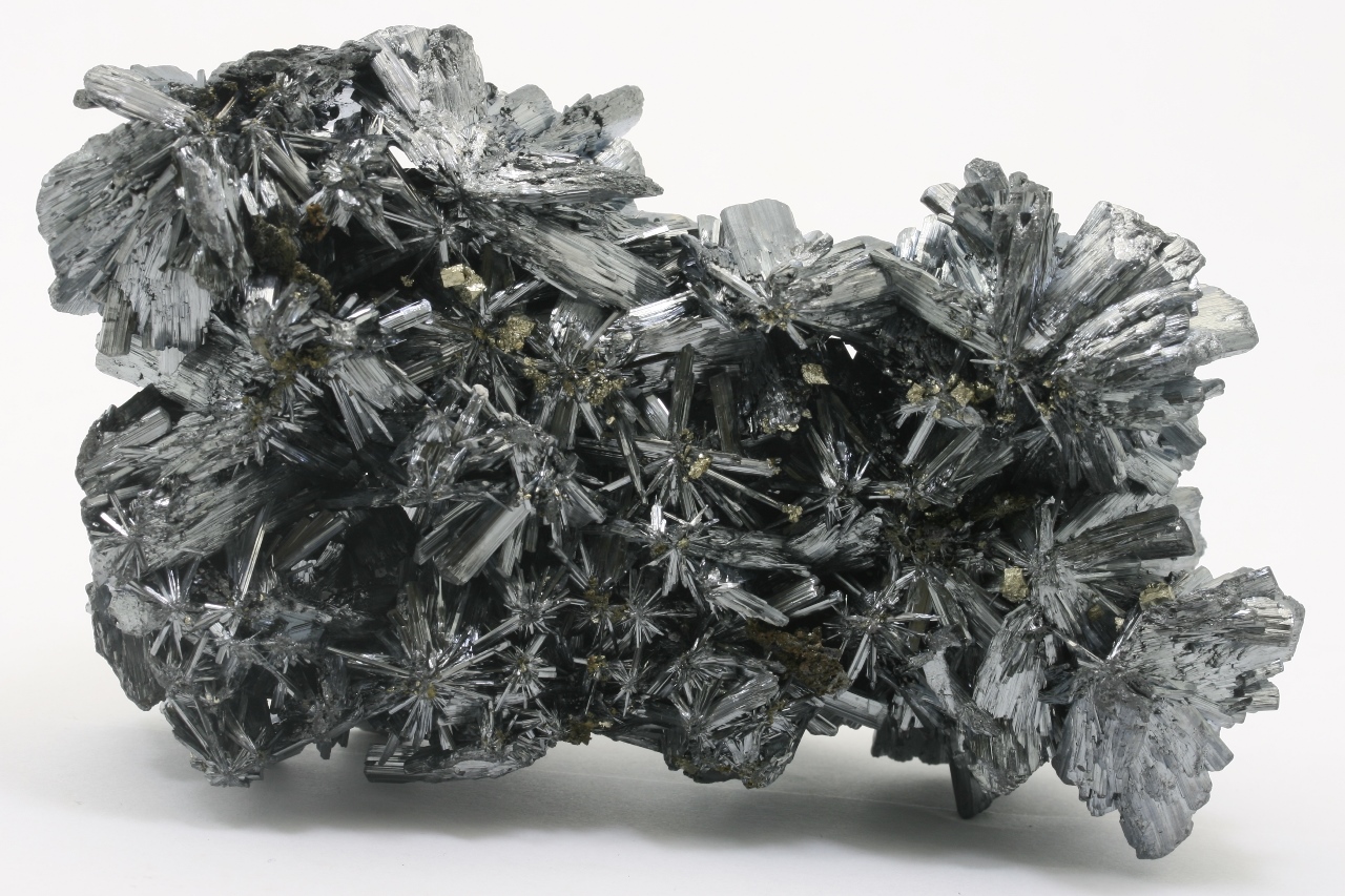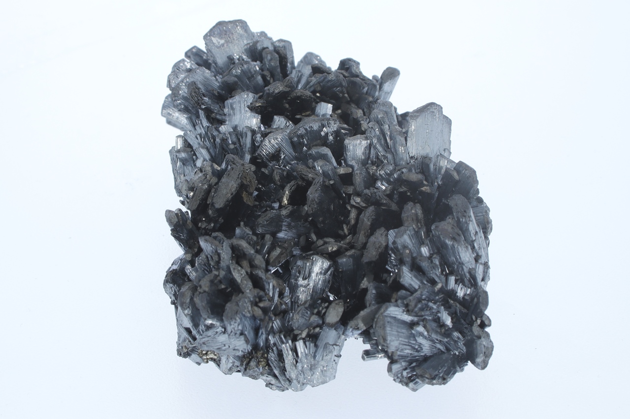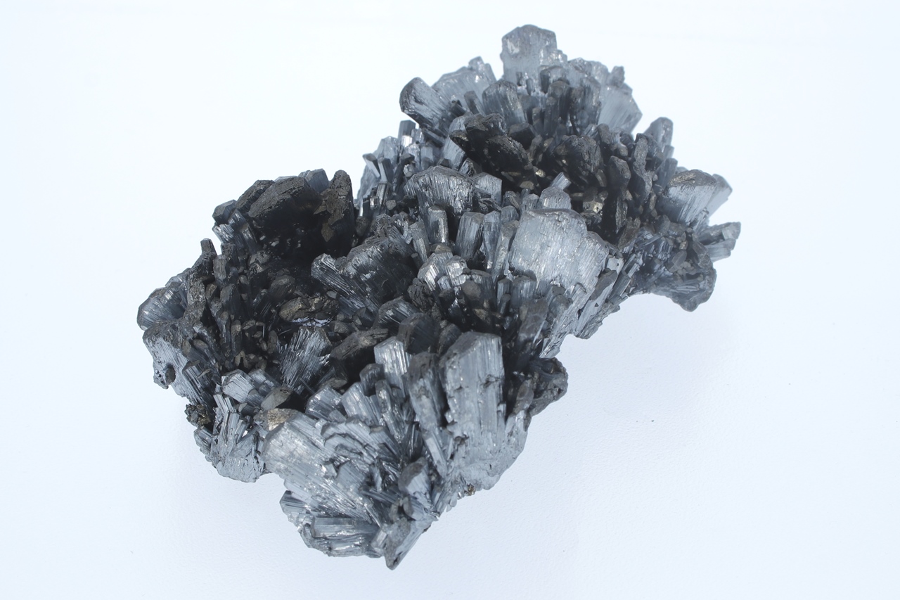 A magnificent specimen of very shiny antimony crystals intergrown from a classic Romanian location. The largest crystals are 2 cm in size.