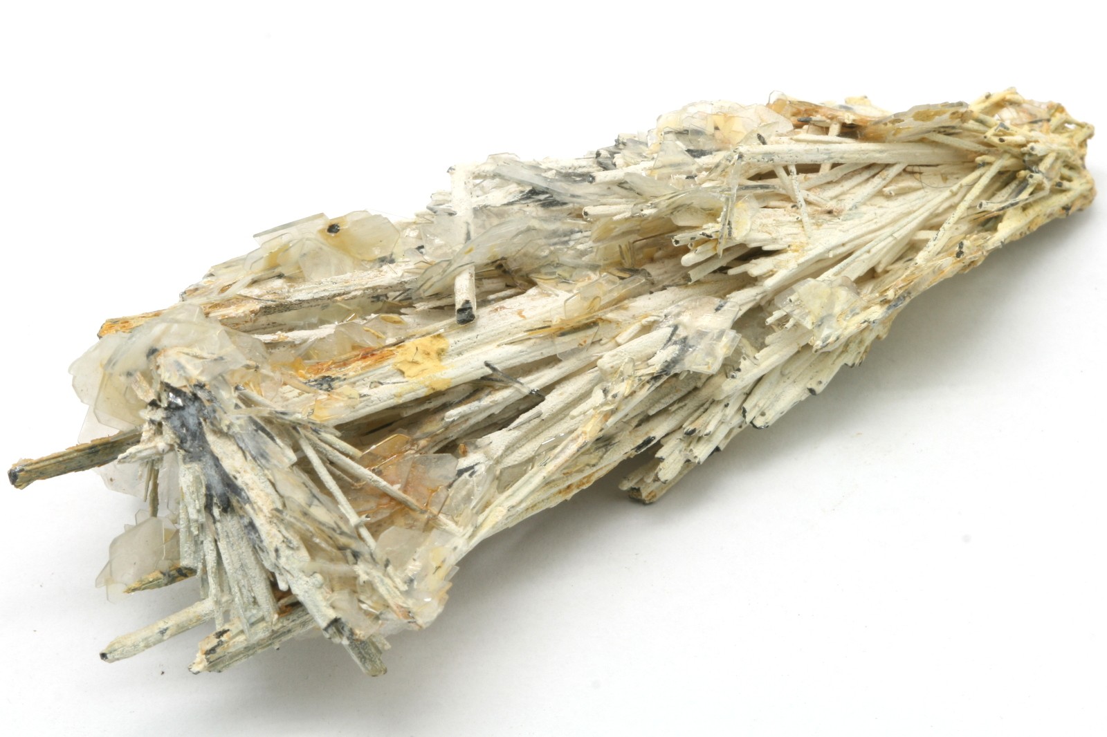 Specimen of stibnite with crystals up to 60 mm in size accompanied by small barytes and yellow stibiconite.