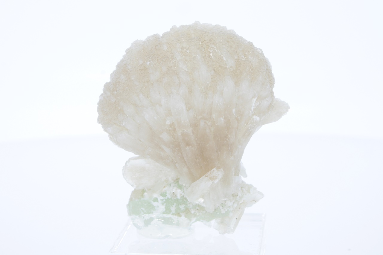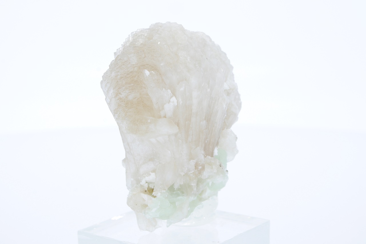 A beautiful, historical sample of a fan-shaped white stilbite (crystals about 3.5 cm large) typically grown on a light green prehnite for this locality. This location was mined at the turn of the 19th and 20th centuries.
