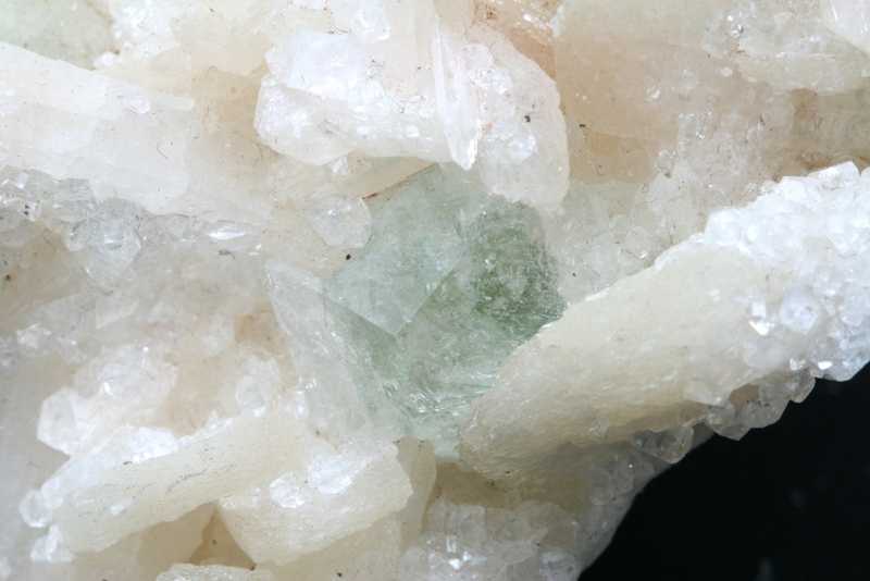Very aesthetic sample of stilbite with apophyllite from India. High-quality sample of stilbite druse crystals and clear to green zonal crystals of apophyllite.