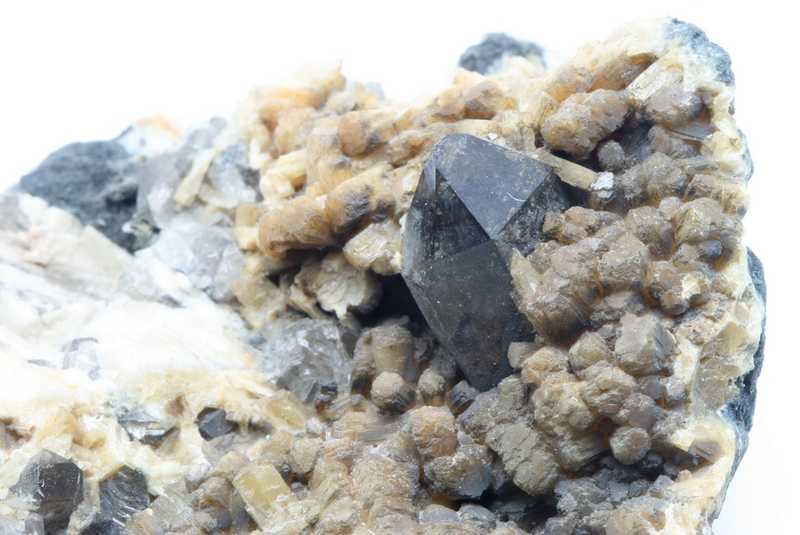 Stilbite sample from Poland. Sample of stilbite aggregates up to 4 mm in size along with a 15 mm goethite crystal.