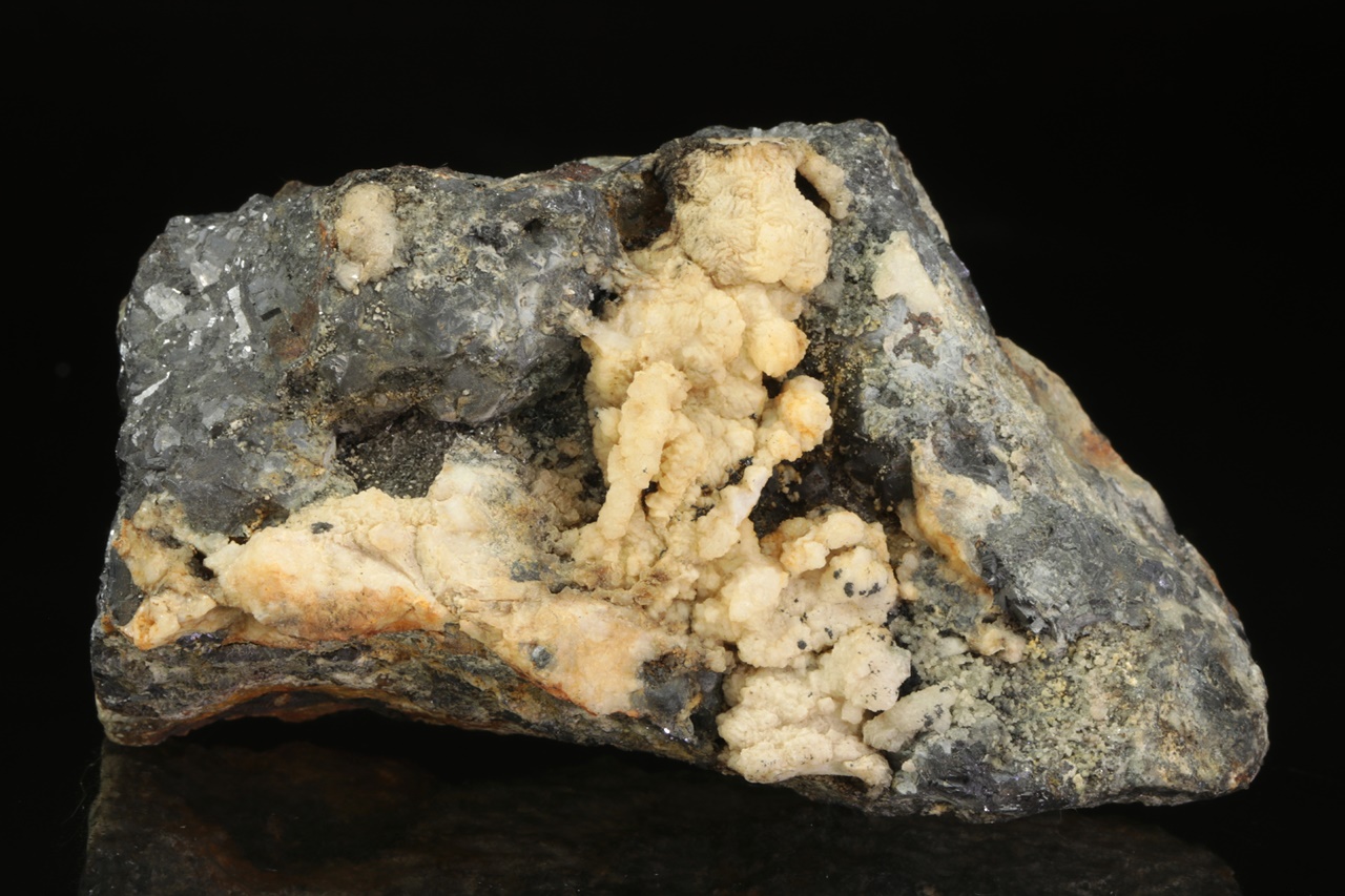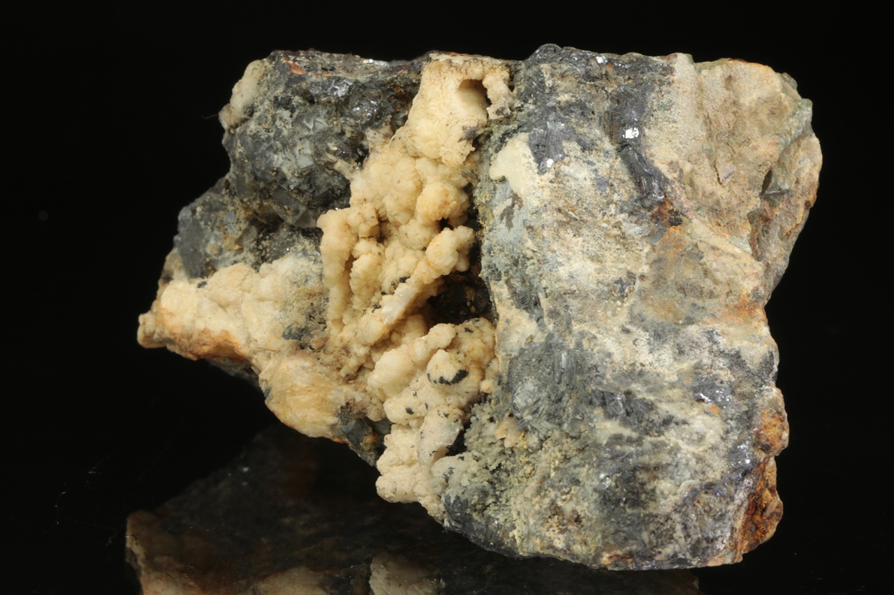 Aggregates of white dolomite grown on gray galena covered with silver wires, on which small needle-like crystals of acanthite are attached. The pecimen comes from the Vojtěch mine.