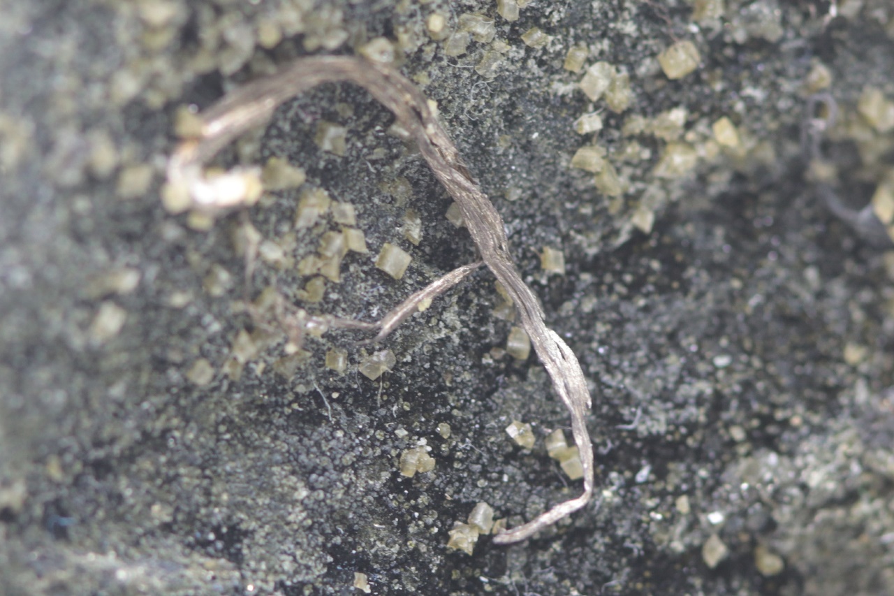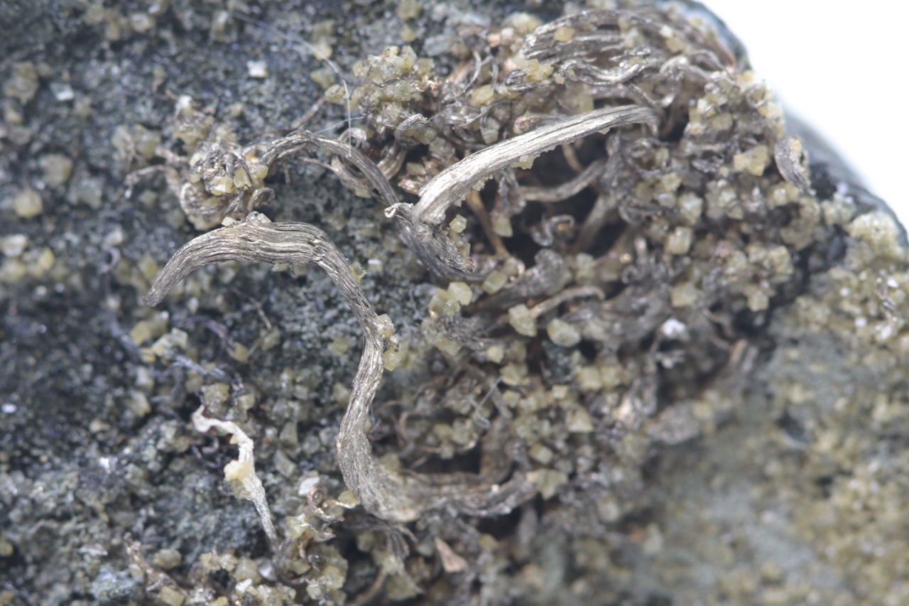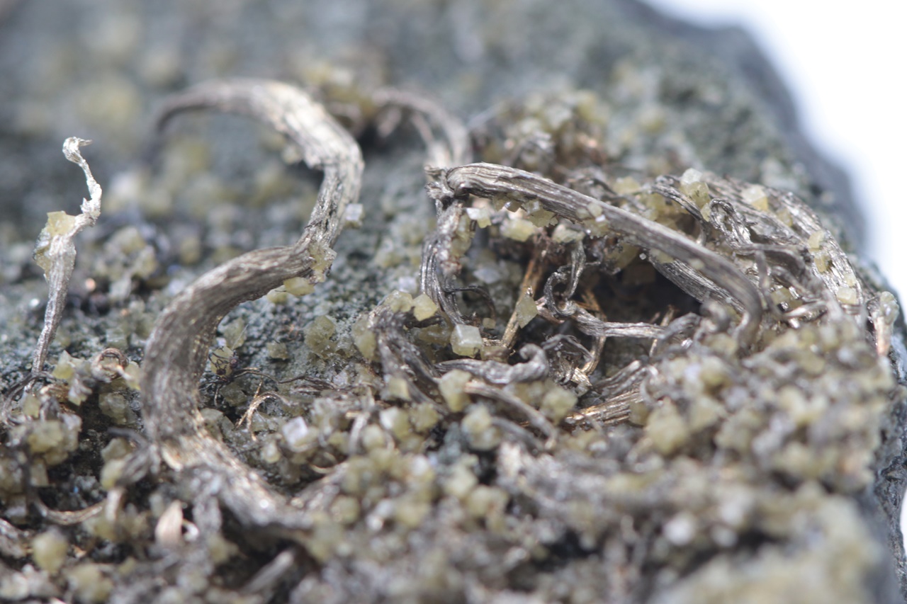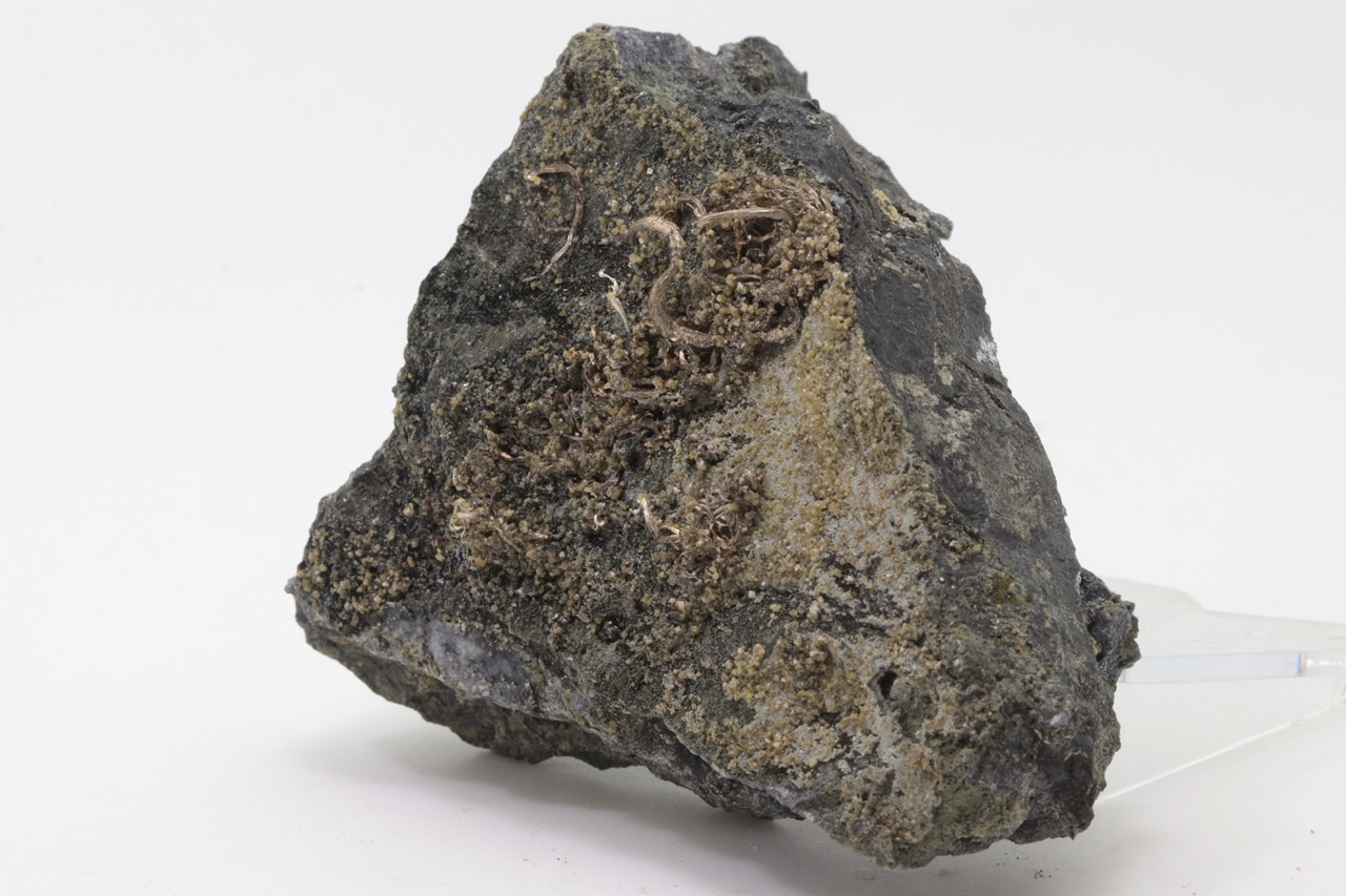 A rich sample of natural silver forming wires and bushes up to 1.5 mm thick. The silver wire on the left side of the sample, resembling the letter E, measures 11 × 6 mm.