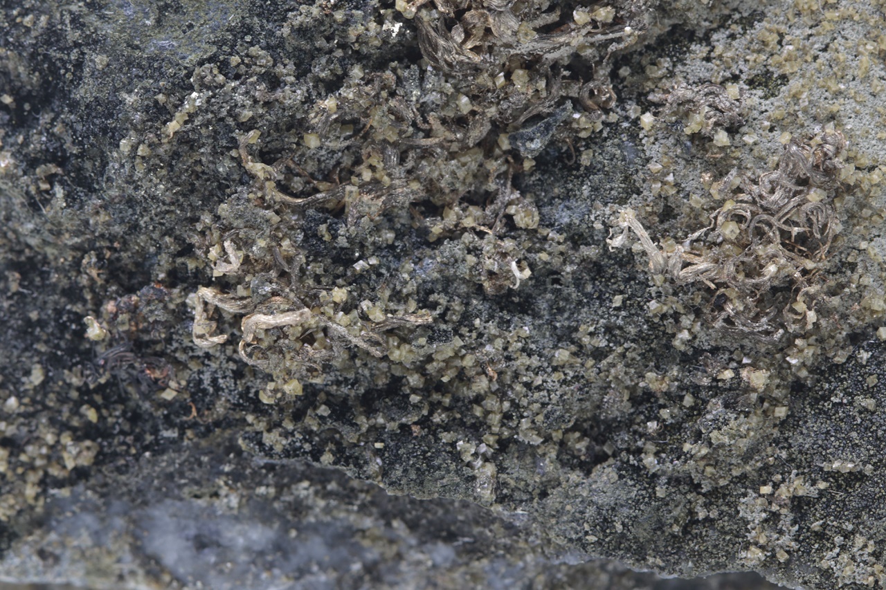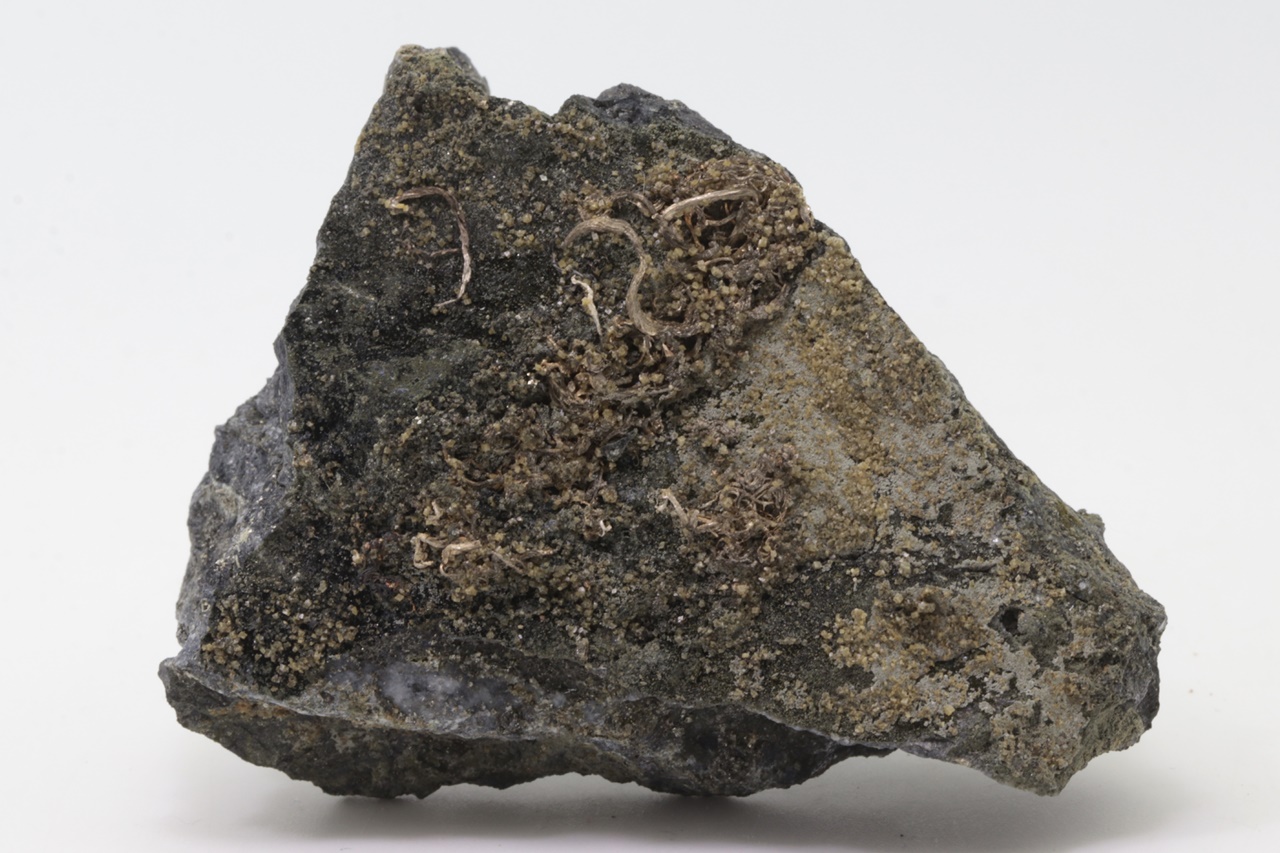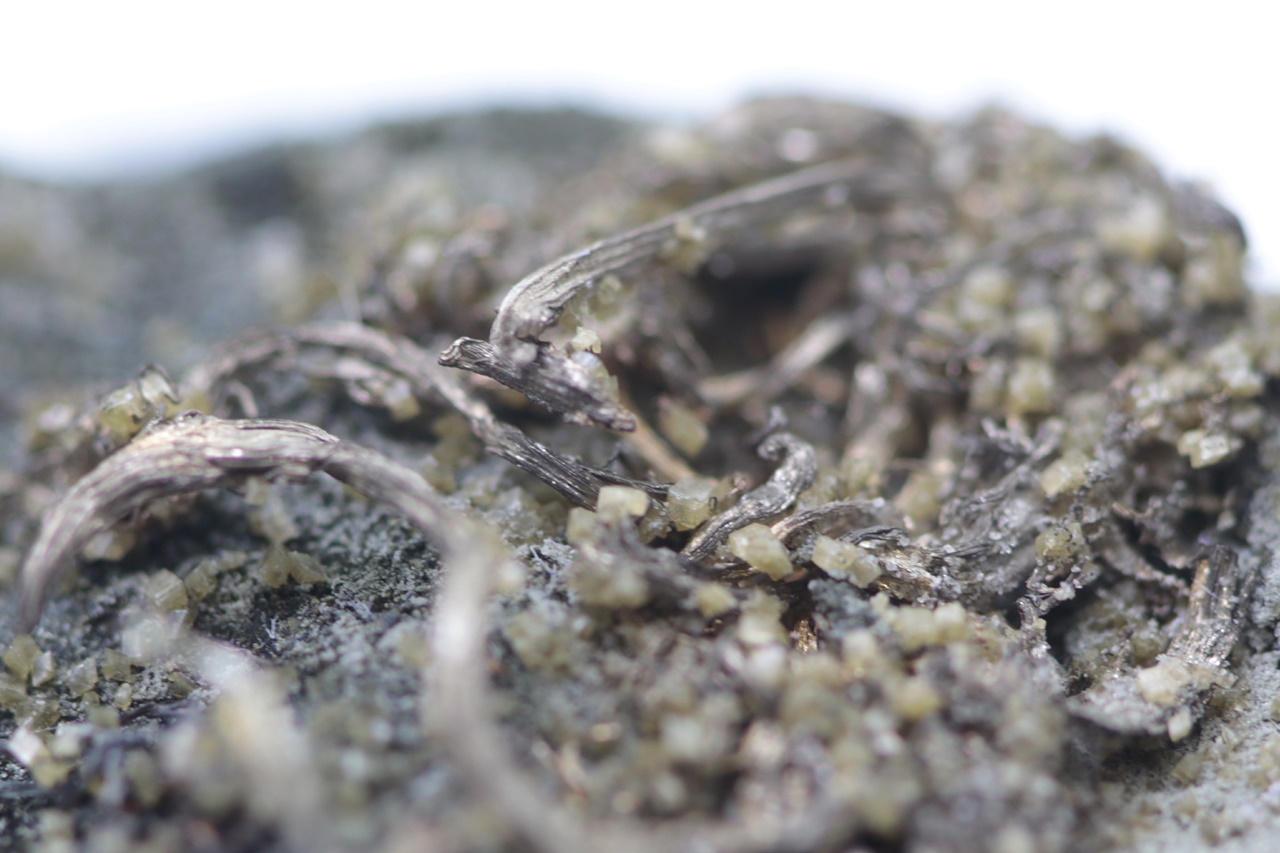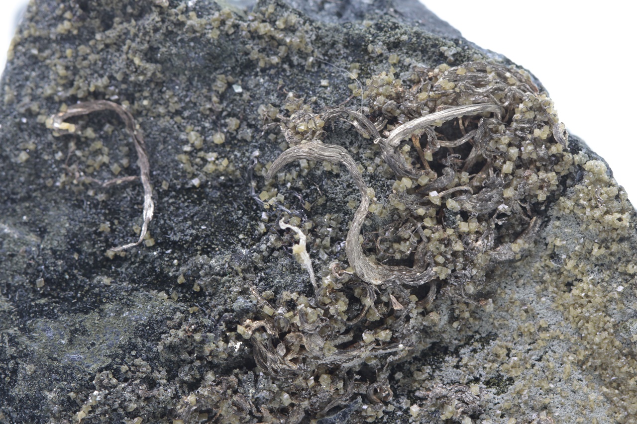A rich sample of natural silver forming wires and bushes up to 1.5 mm thick. The silver wire on the left side of the sample, resembling the letter E, measures 11 × 6 mm.