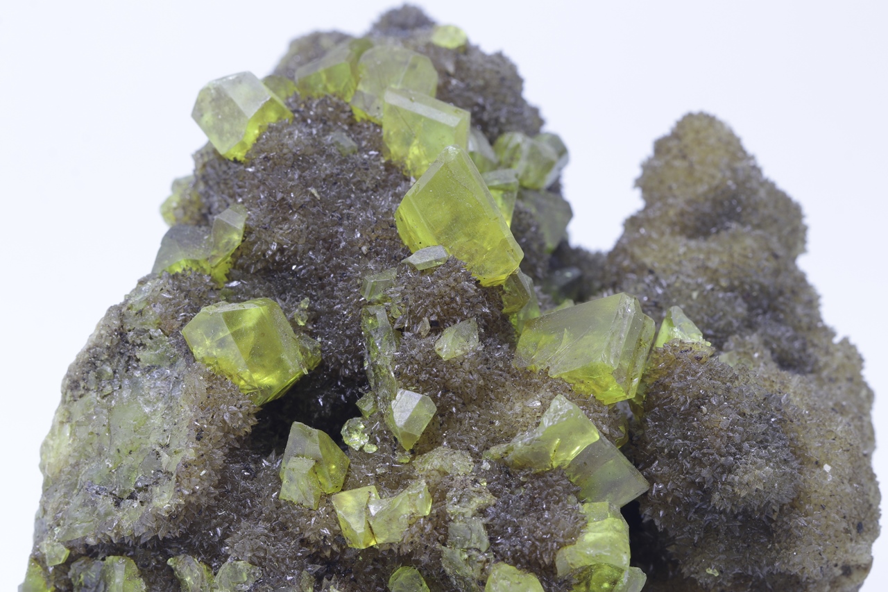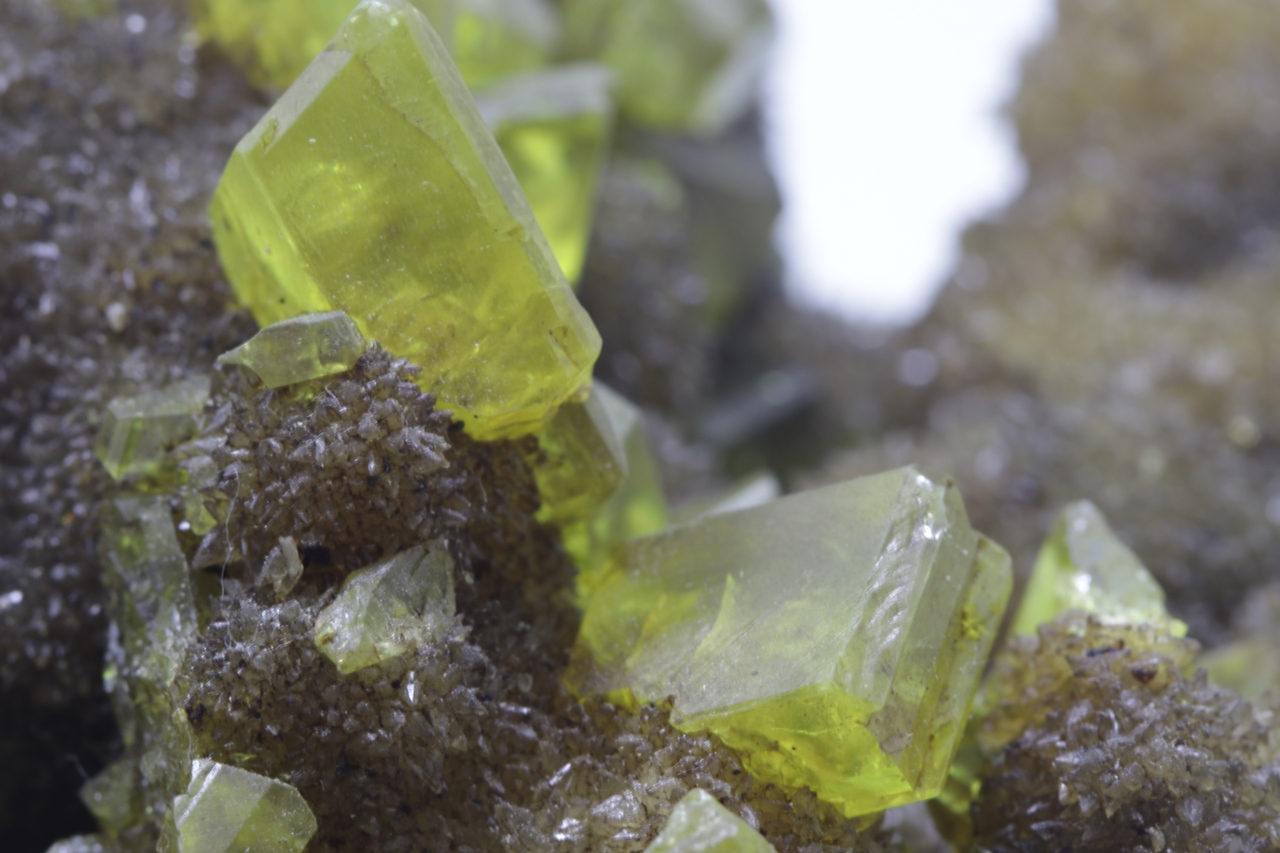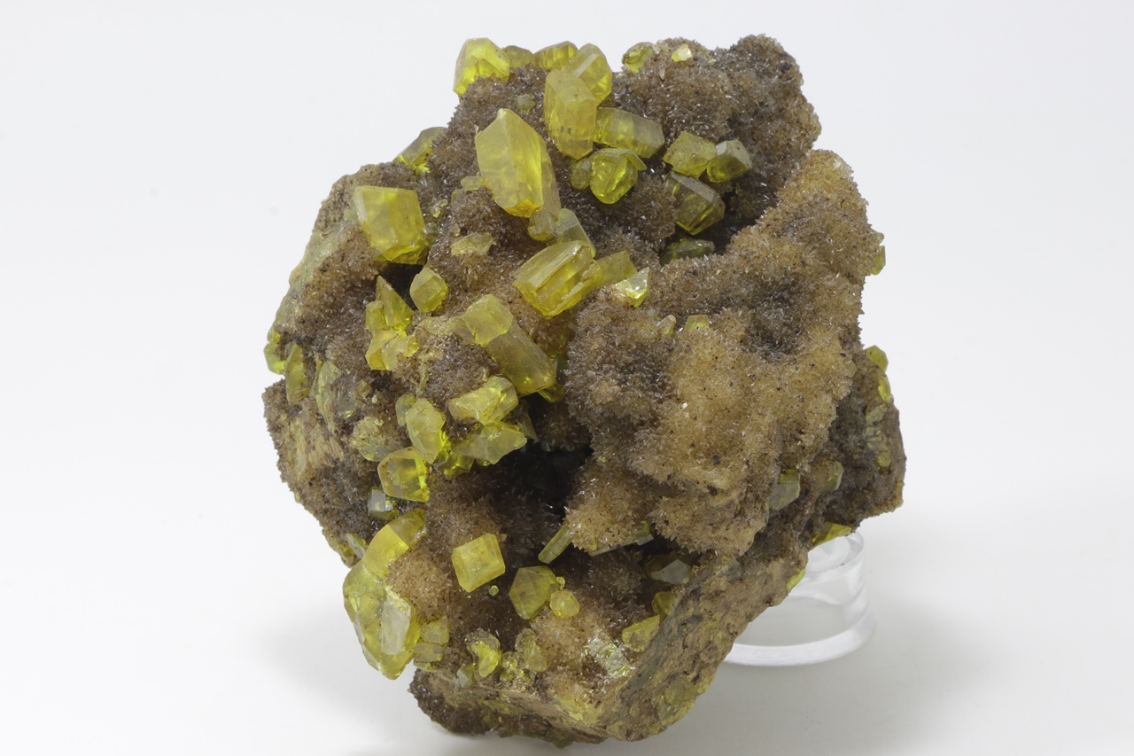 Magnificent, translucent crystals of intense yellow sulfur grown on brown calcite. The largest crystal is 16 mm in size. A very successful collector’s specimen from a classic European location.
