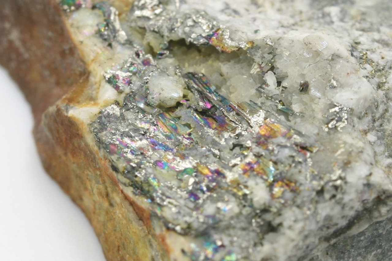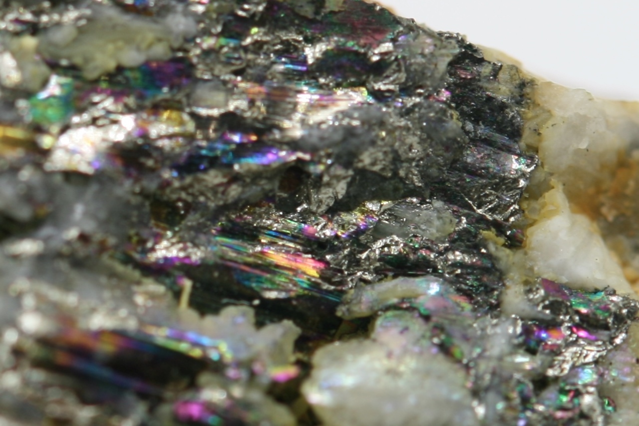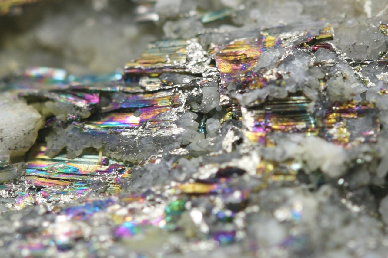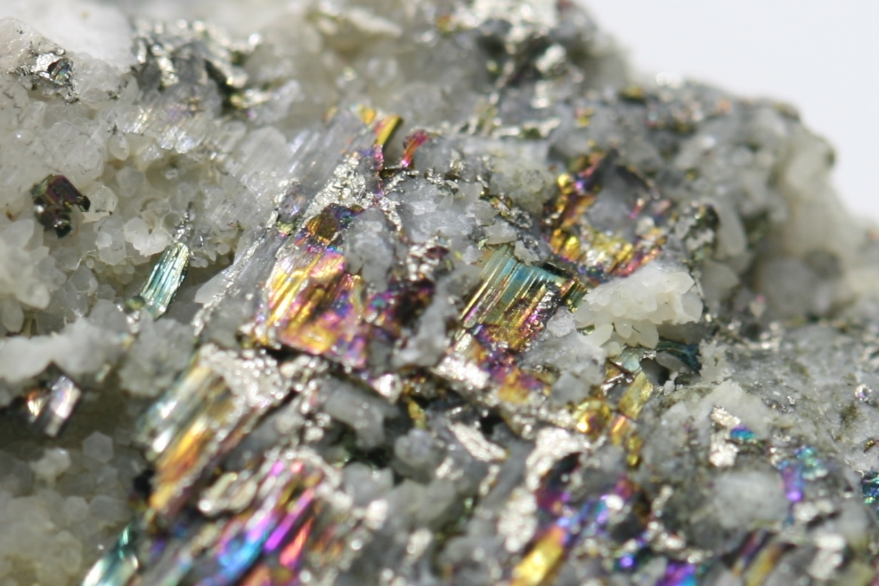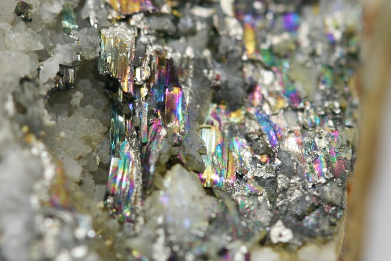 Elongated, iridescent, corrugated crystals of silver and gold telluride – sylvanite – grown in a quartz vein.