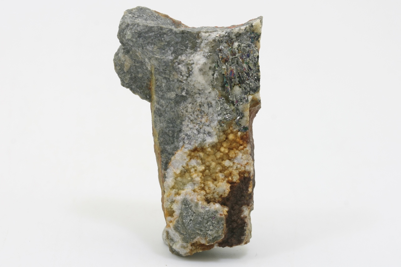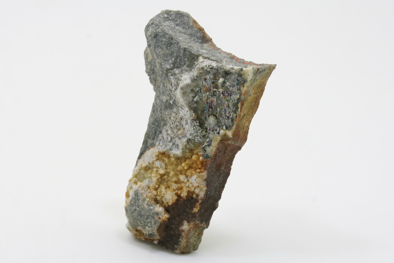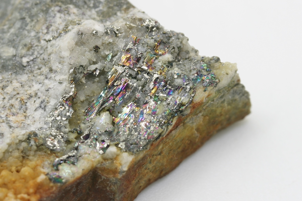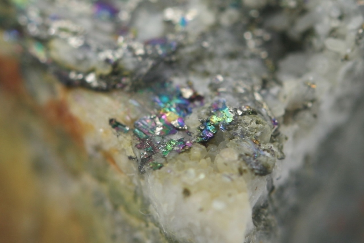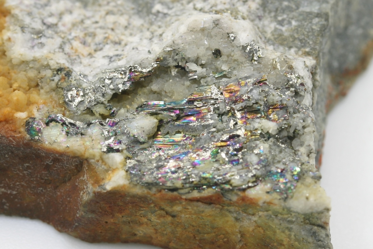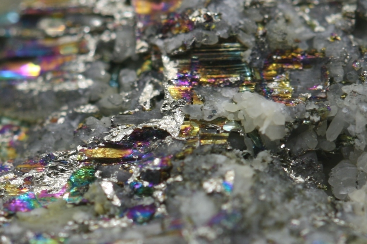 Elongated, iridescent, corrugated crystals of silver and gold telluride – sylvanite – grown in a quartz vein.