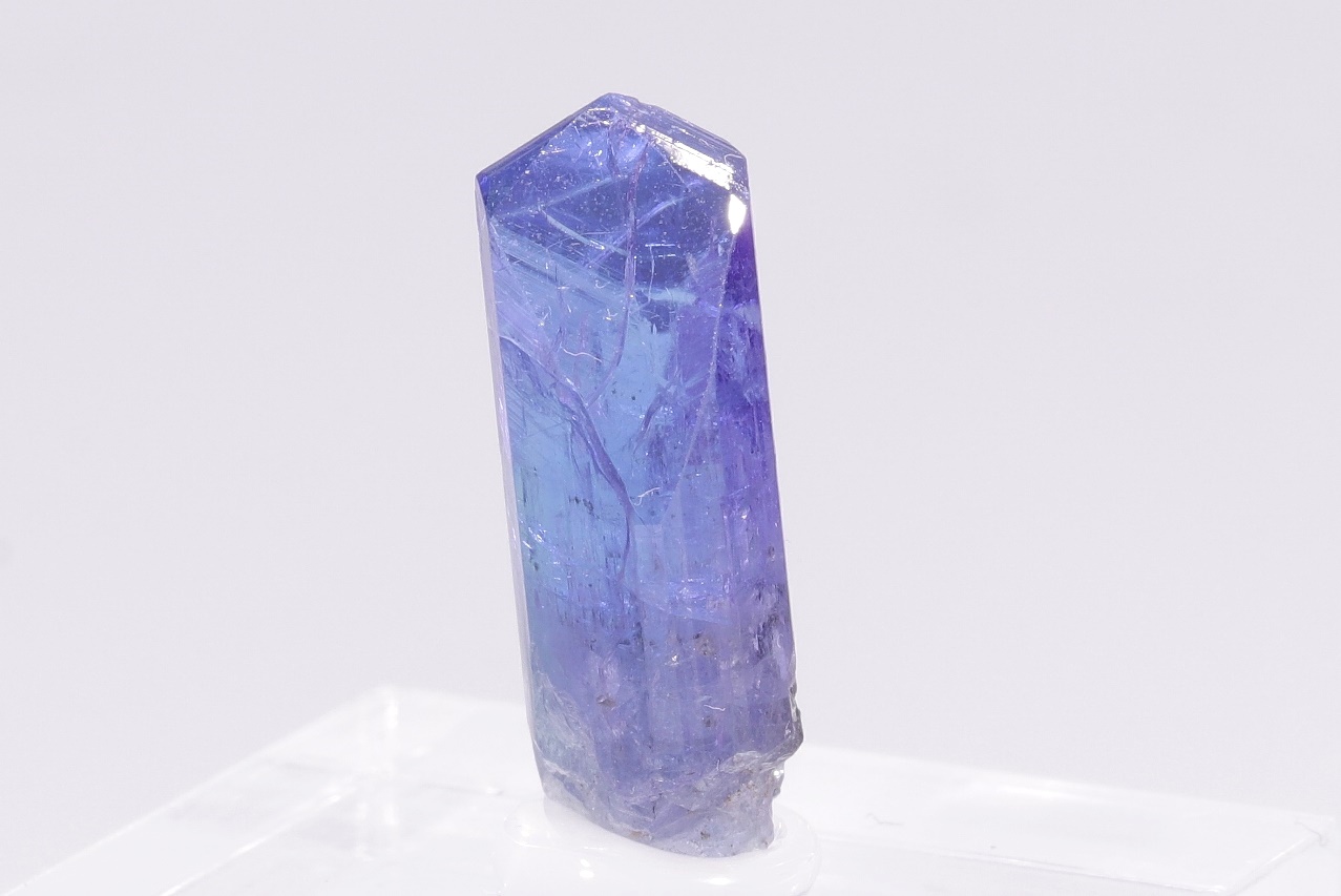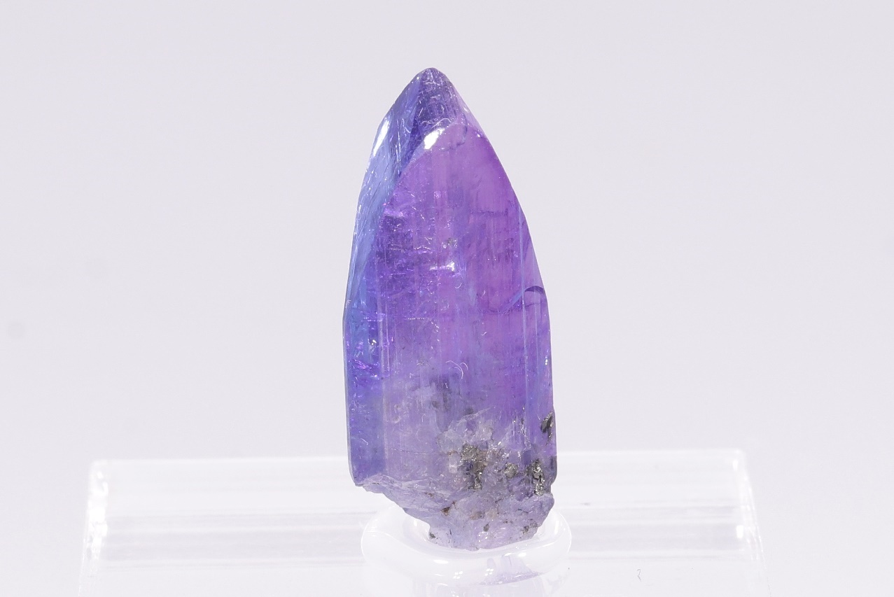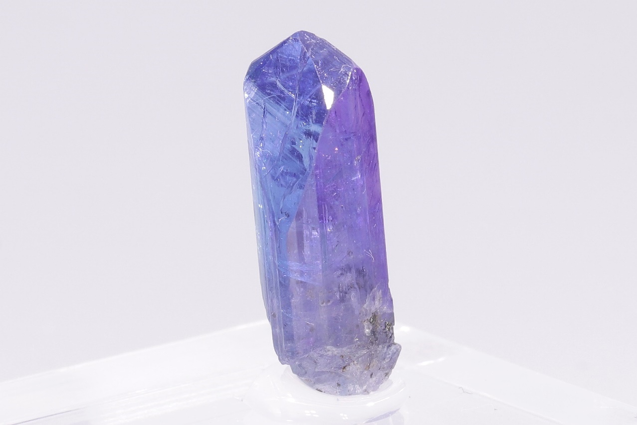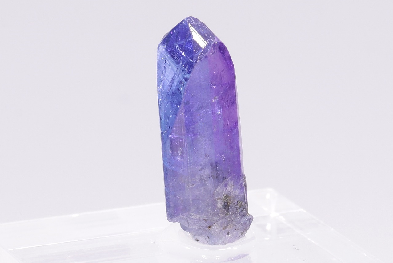 A beautiful specimen of a highly lustrous, well-defined tanzanite crystal weighing 2.9 g. This gem-quality crystal stands out for its striking color change from blue to purple.