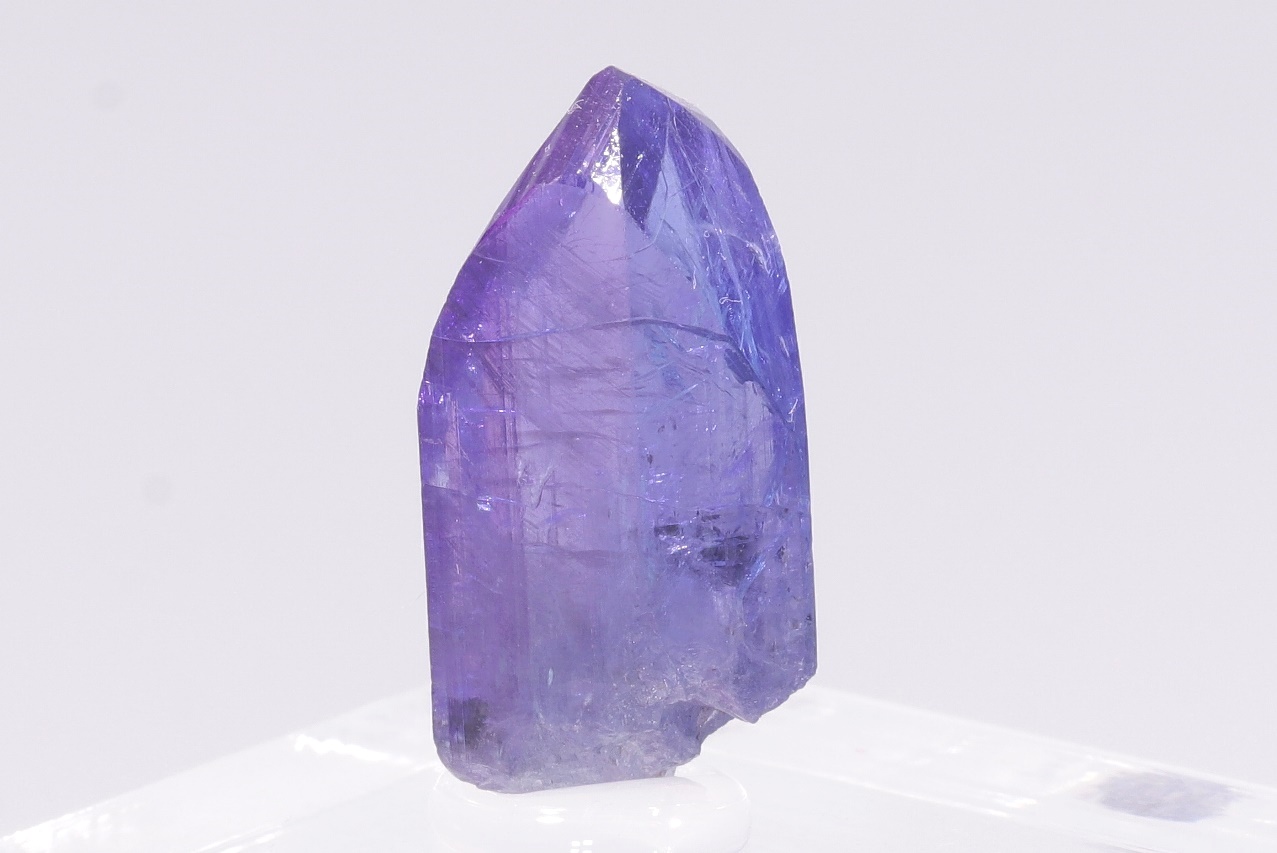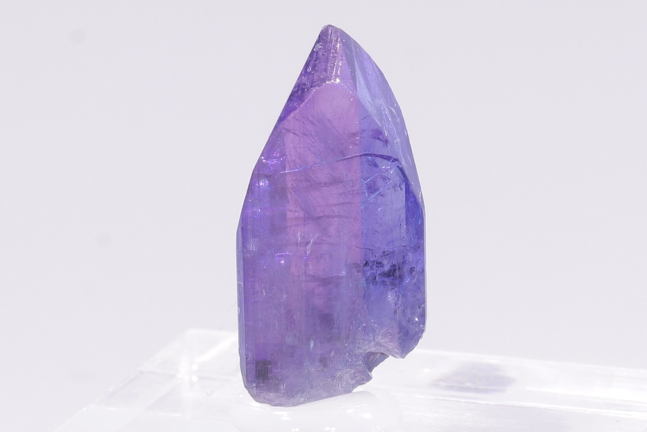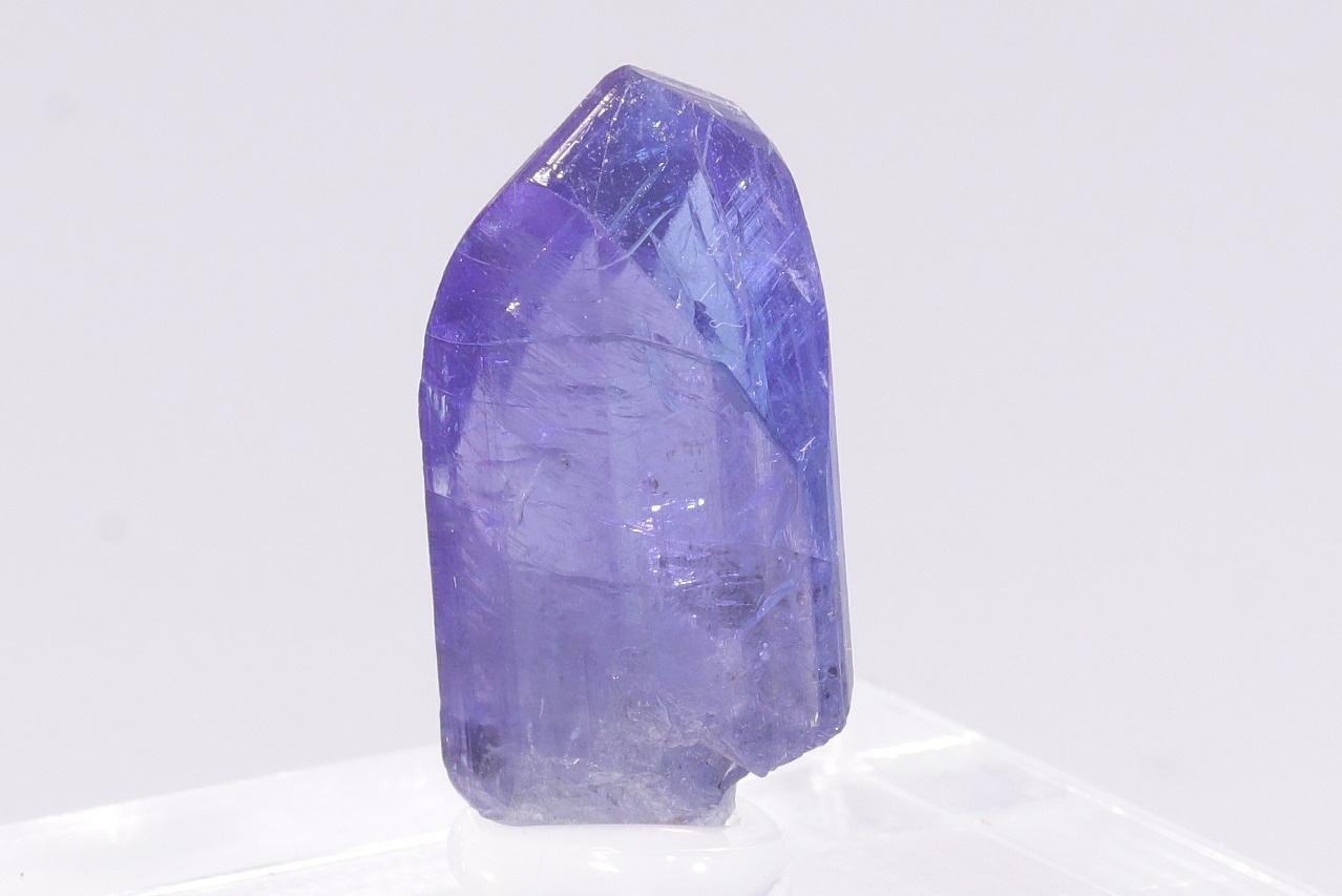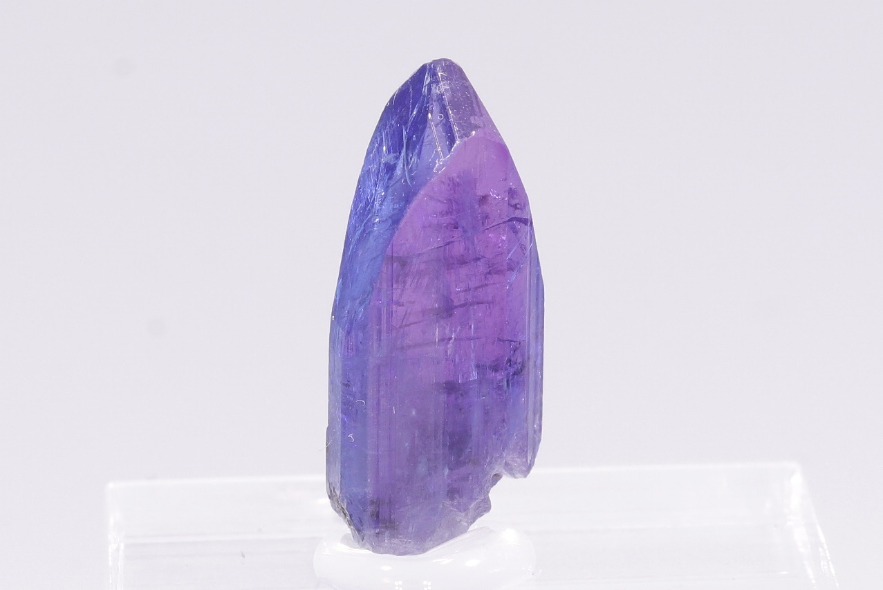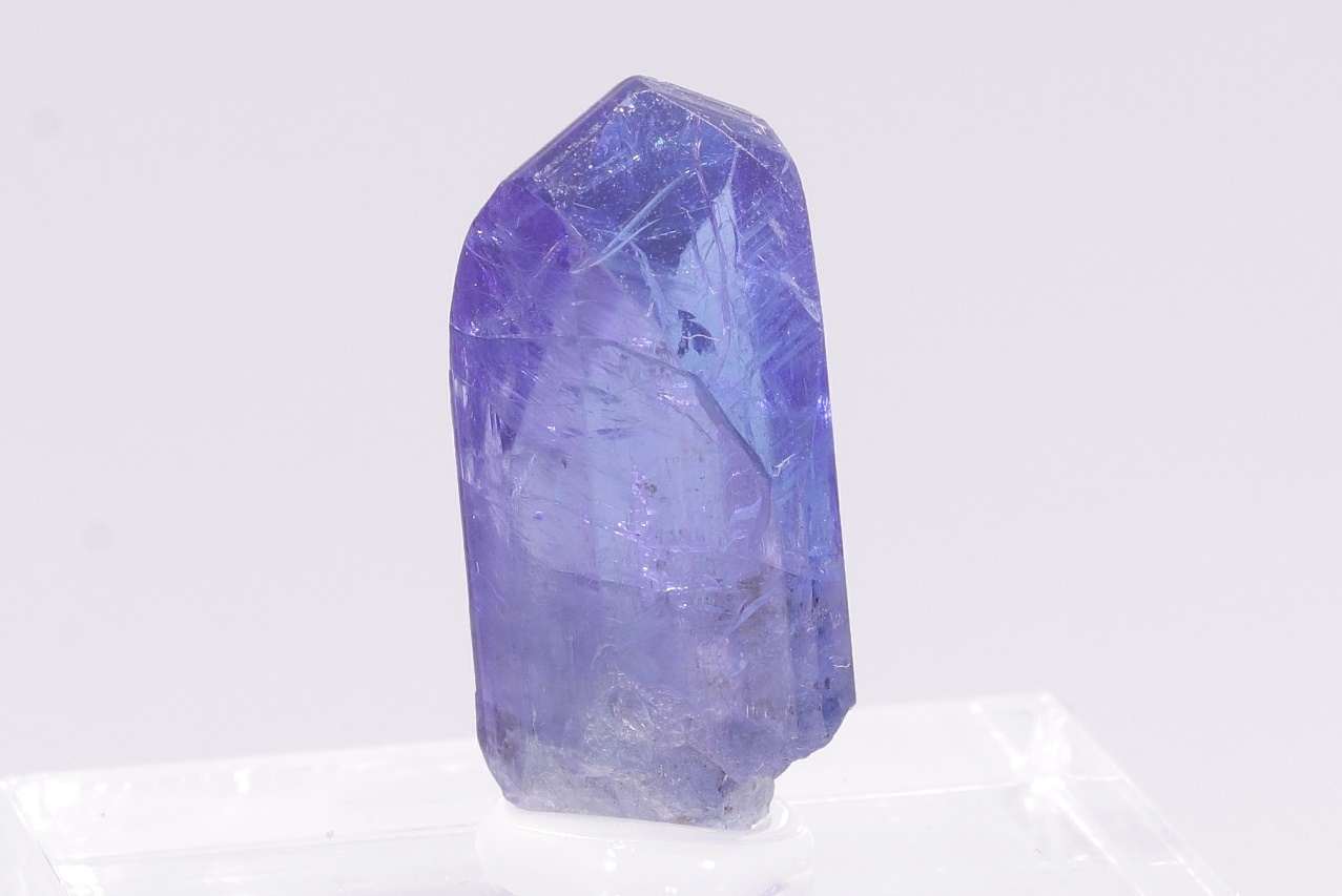 A beautiful specimen of a highly lustrous, well-defined tanzanite crystal weighing 2.9 g. This gem-quality crystal stands out for its striking color change from blue to purple.