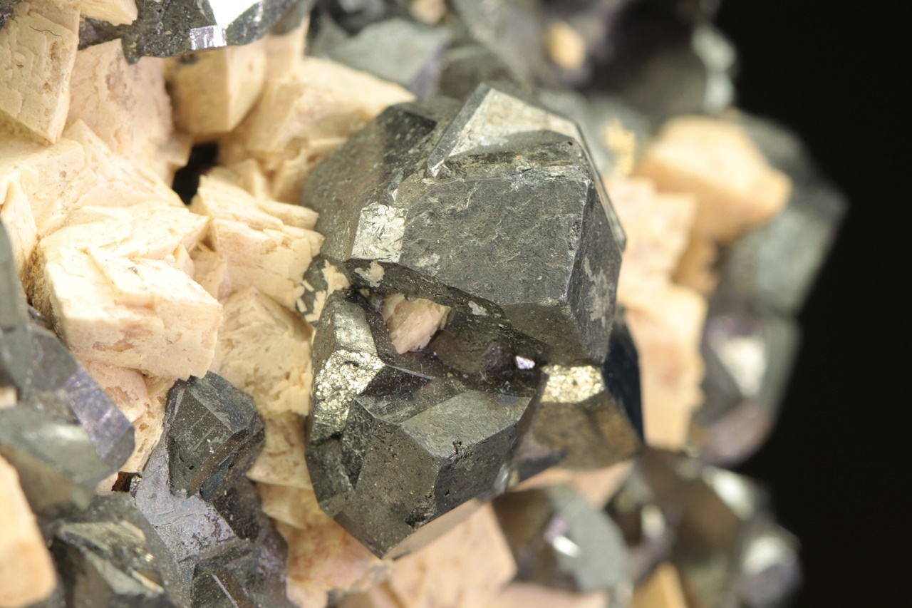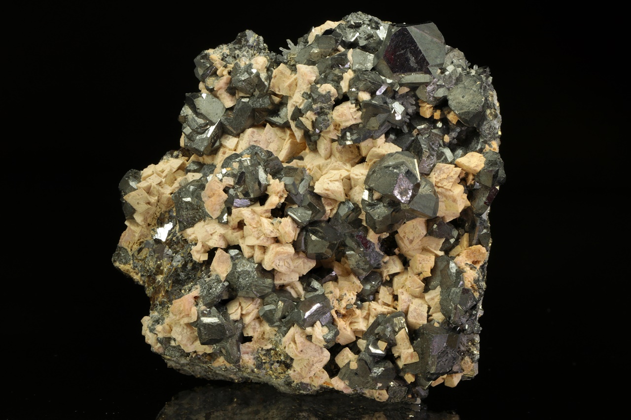 A beautiful specimen featuring perfect crystals of tetrahedrite and rhodochrosite from Peru. An aesthetic specimen combining up to 20 mm large, lustrous tetrahedrite crystals with pinkish rhodochrosite crystals.