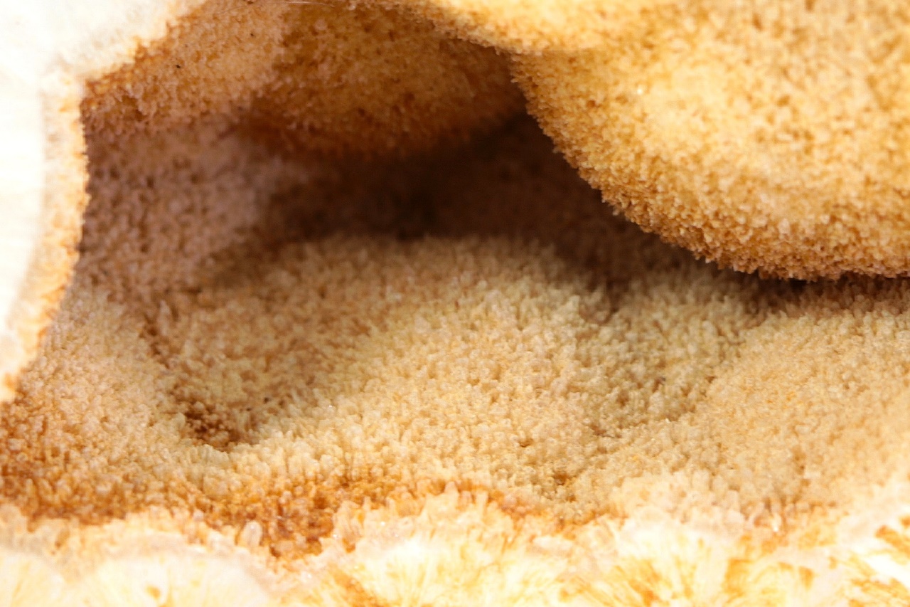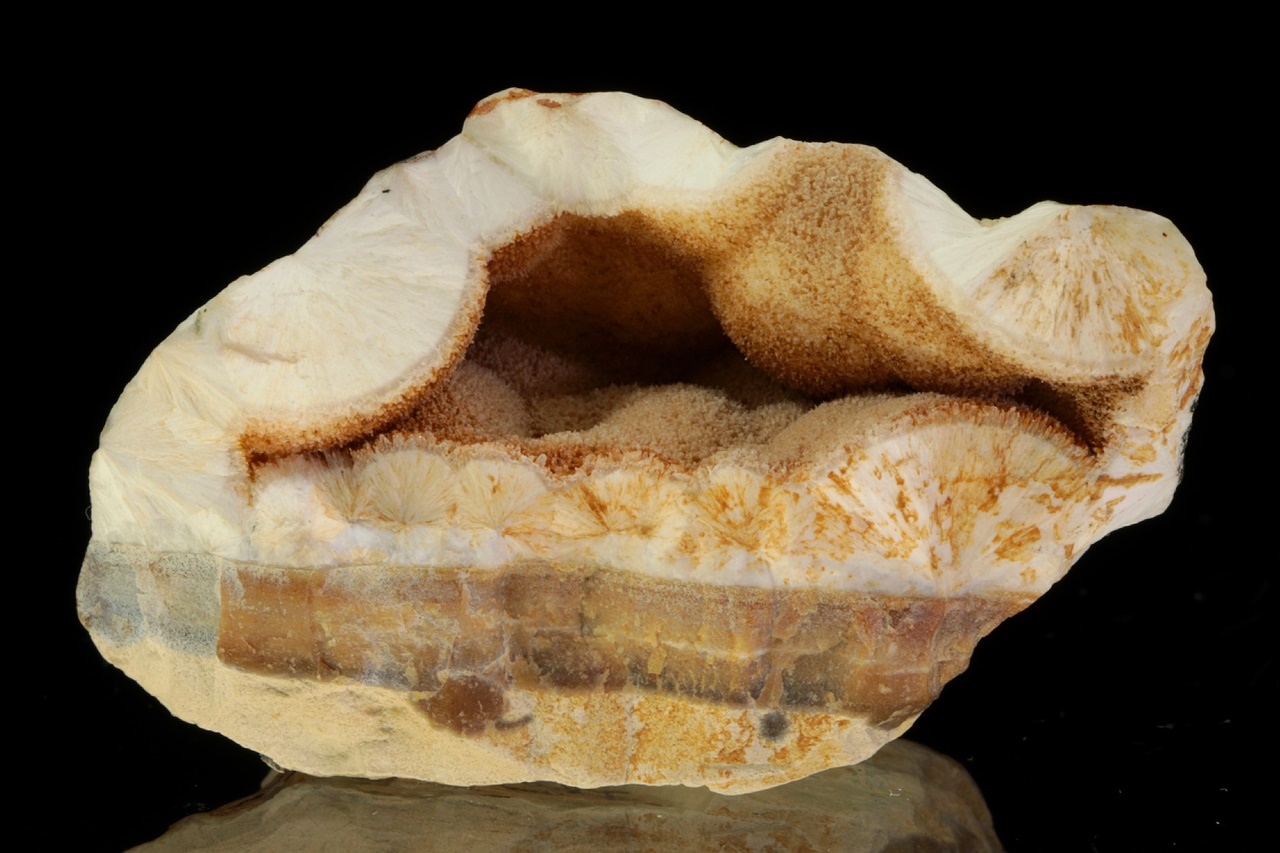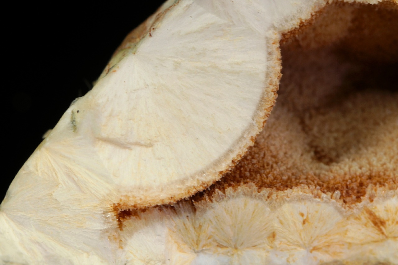 Radial aggregates of white thomsonite zeolite grown into a cavity.