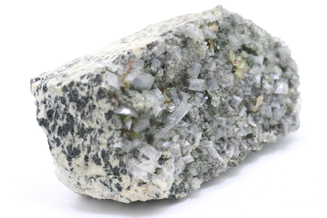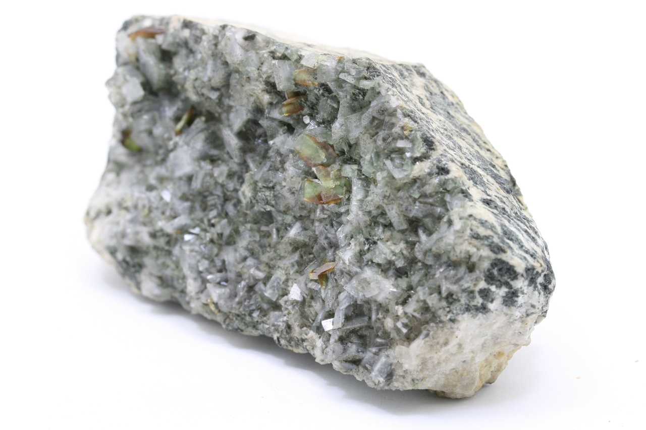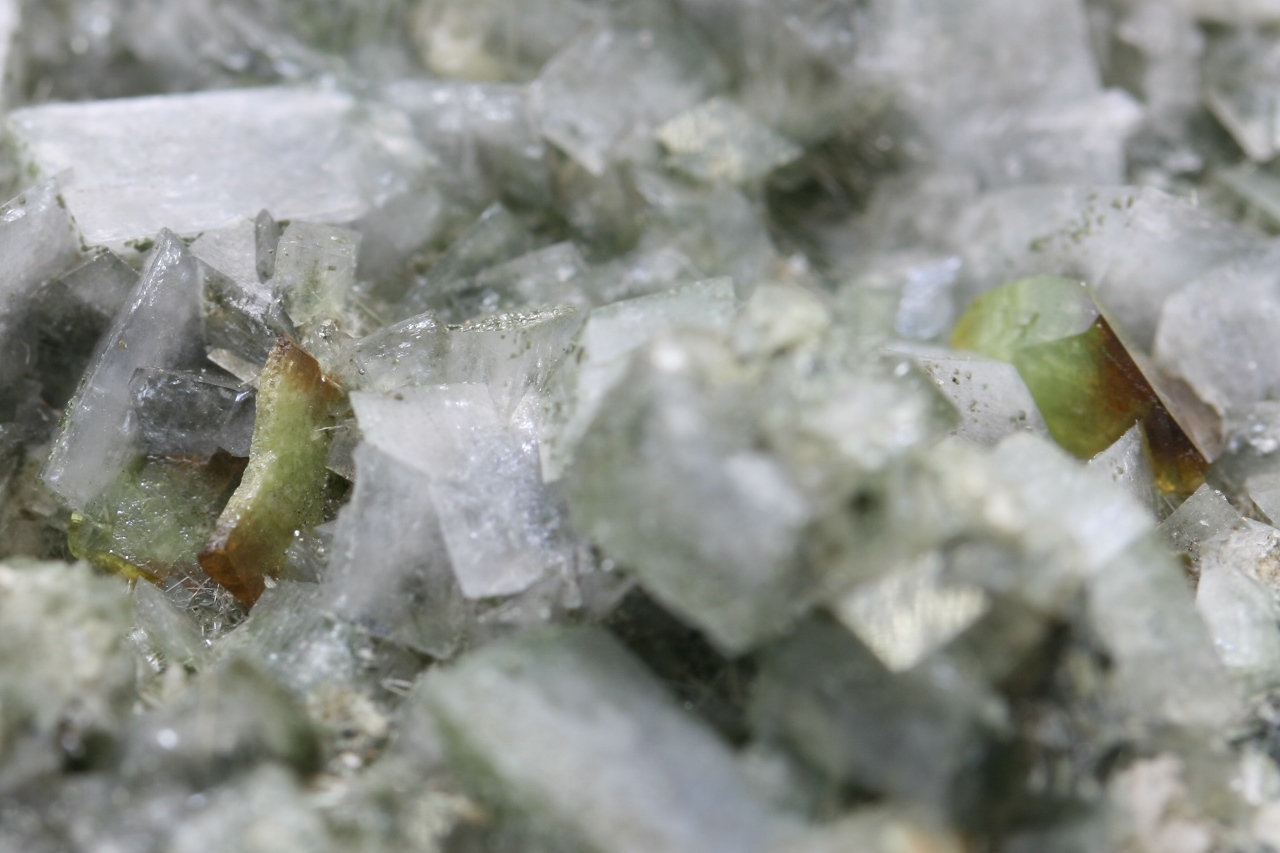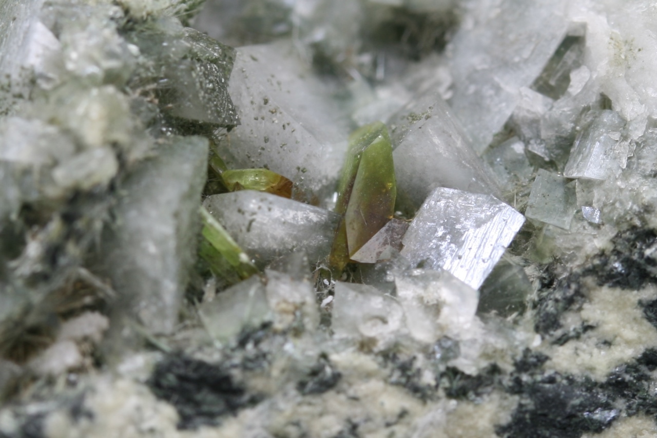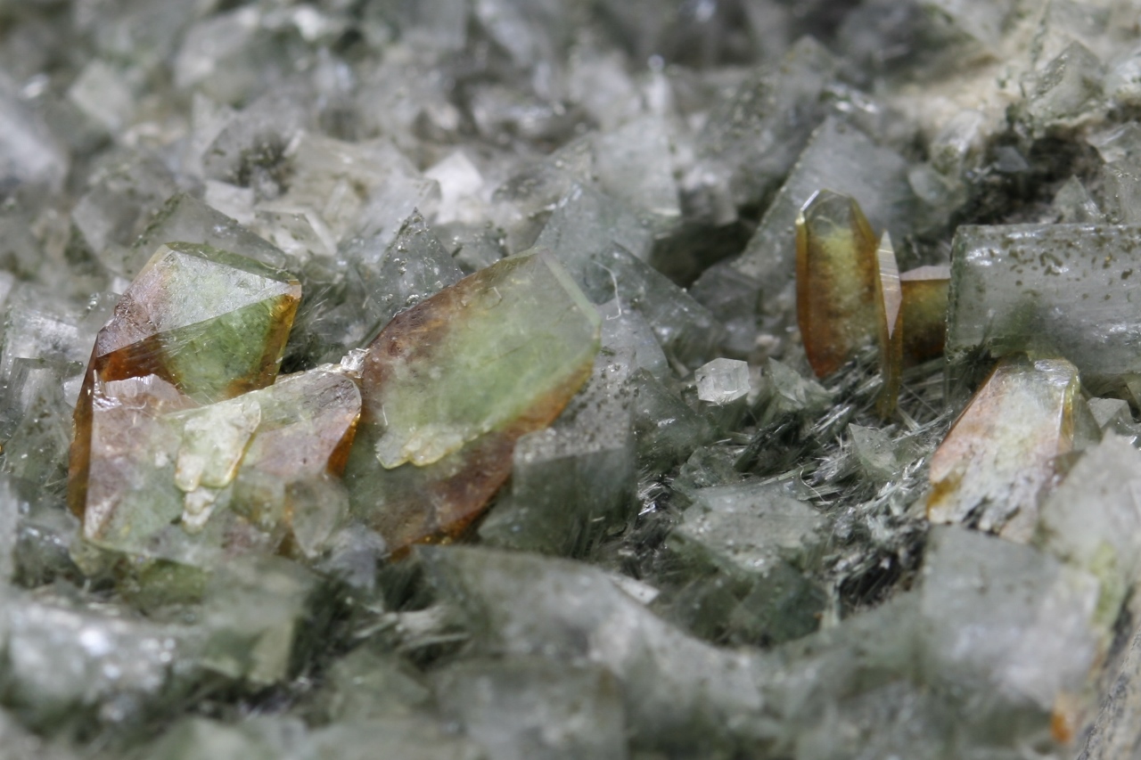 Several crystals of green titanite with margins transitioning to brown. The largest crystal is 6 mm.
