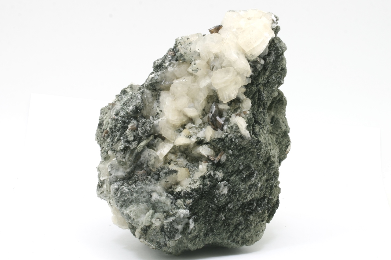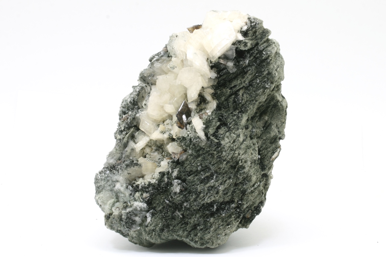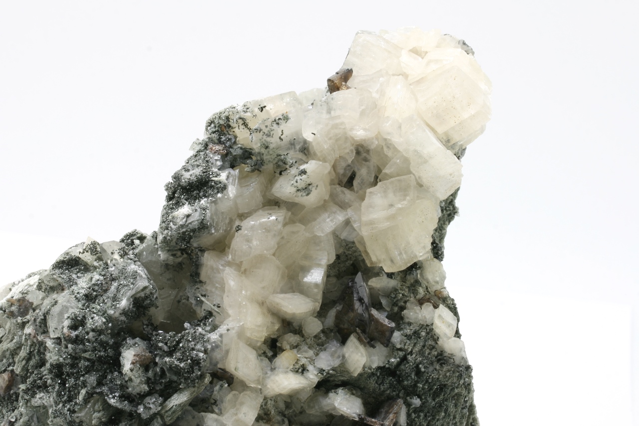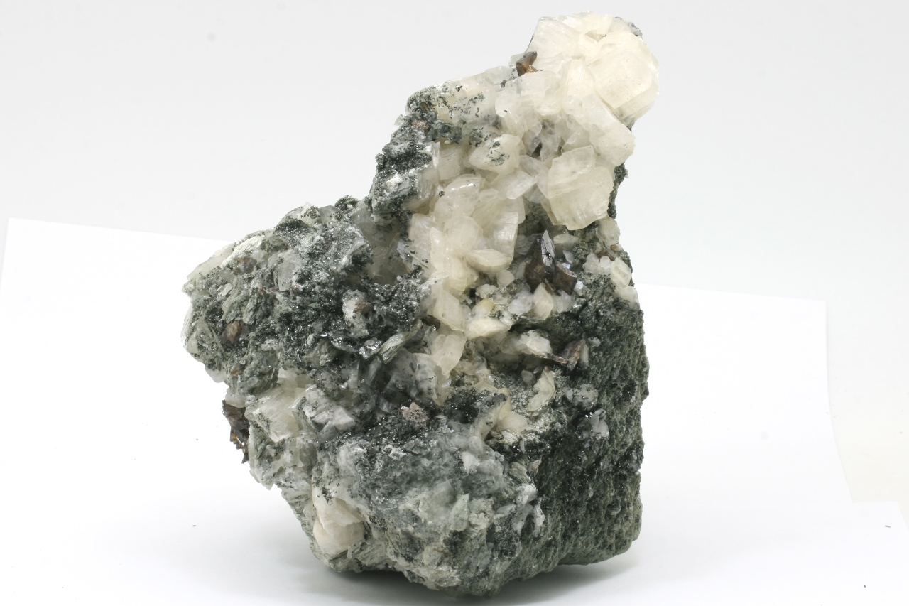 White vaults of calcite with brown crystals of Titanite up to 15 mm large grown on chloritic schist.