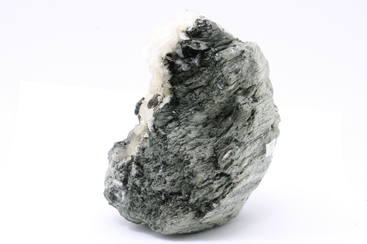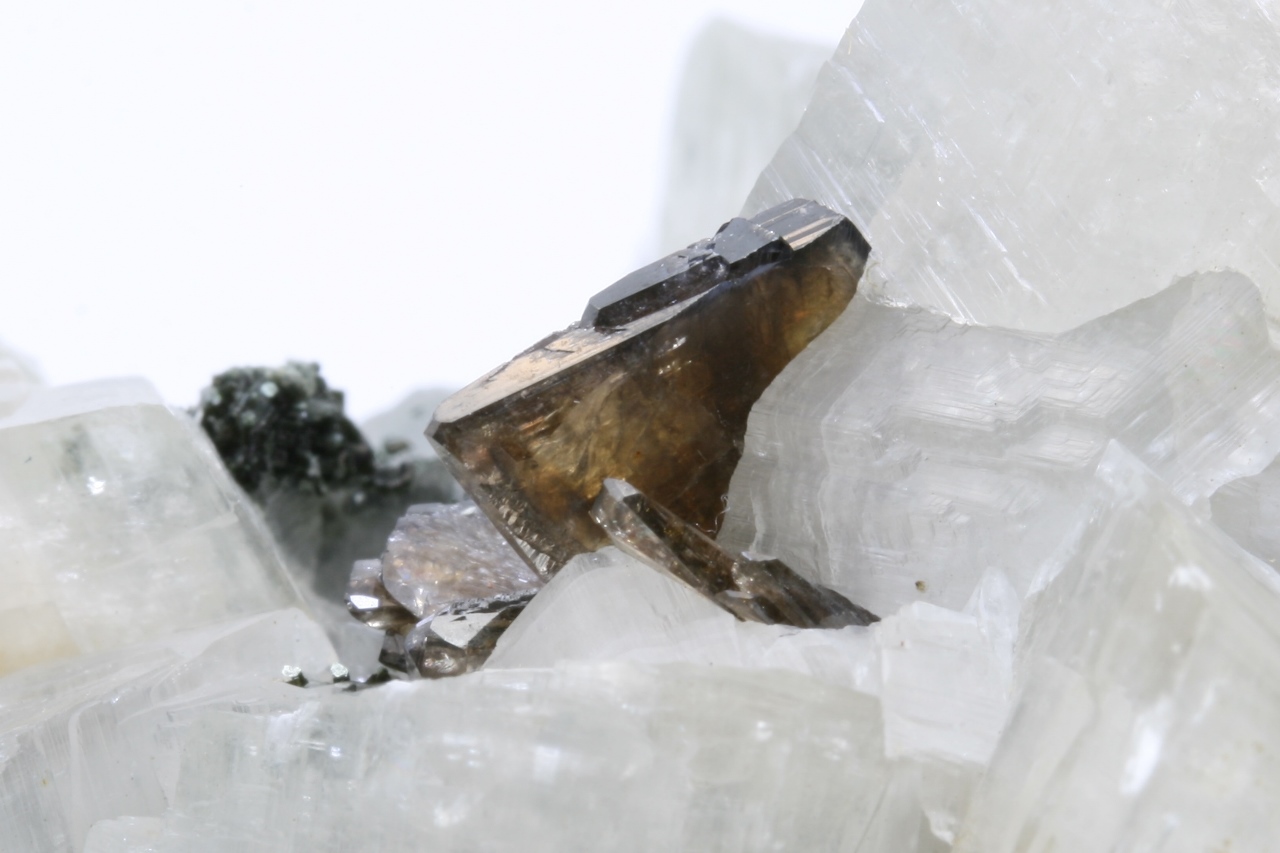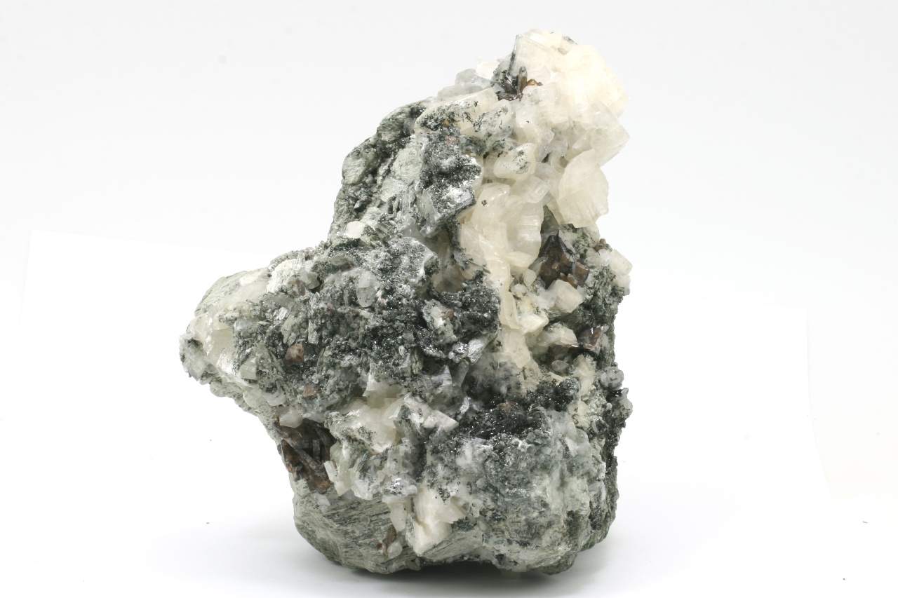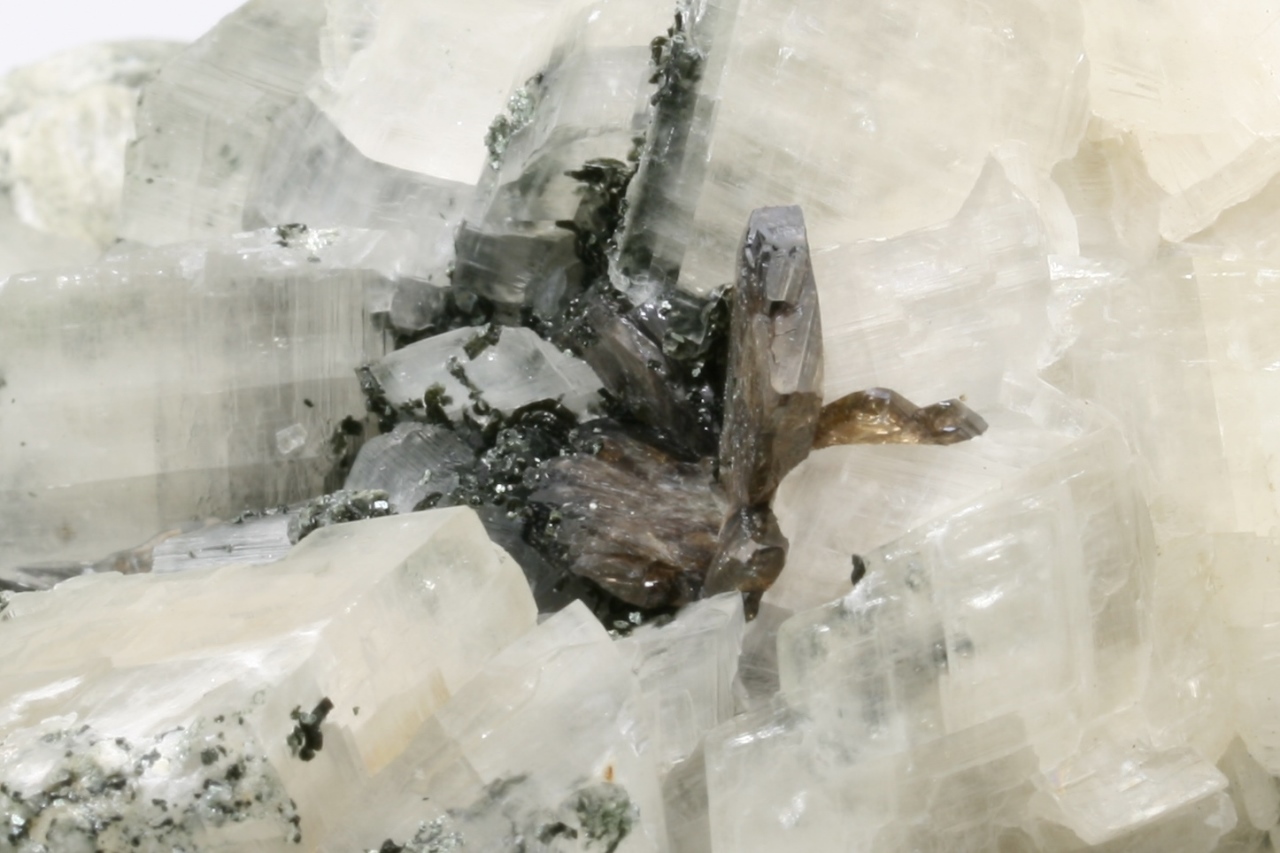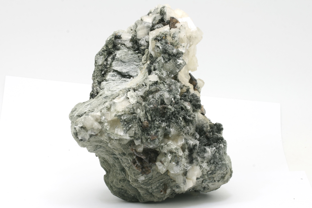 White vaults of calcite with brown crystals of Titanite up to 15 mm large grown on chloritic schist.