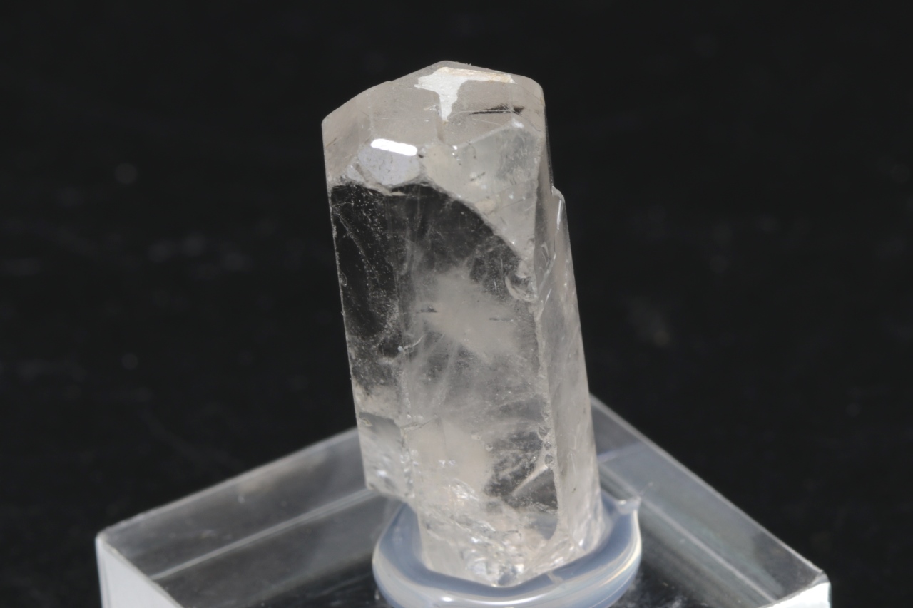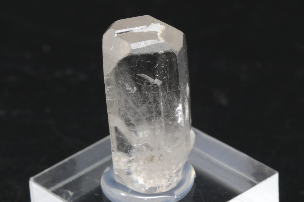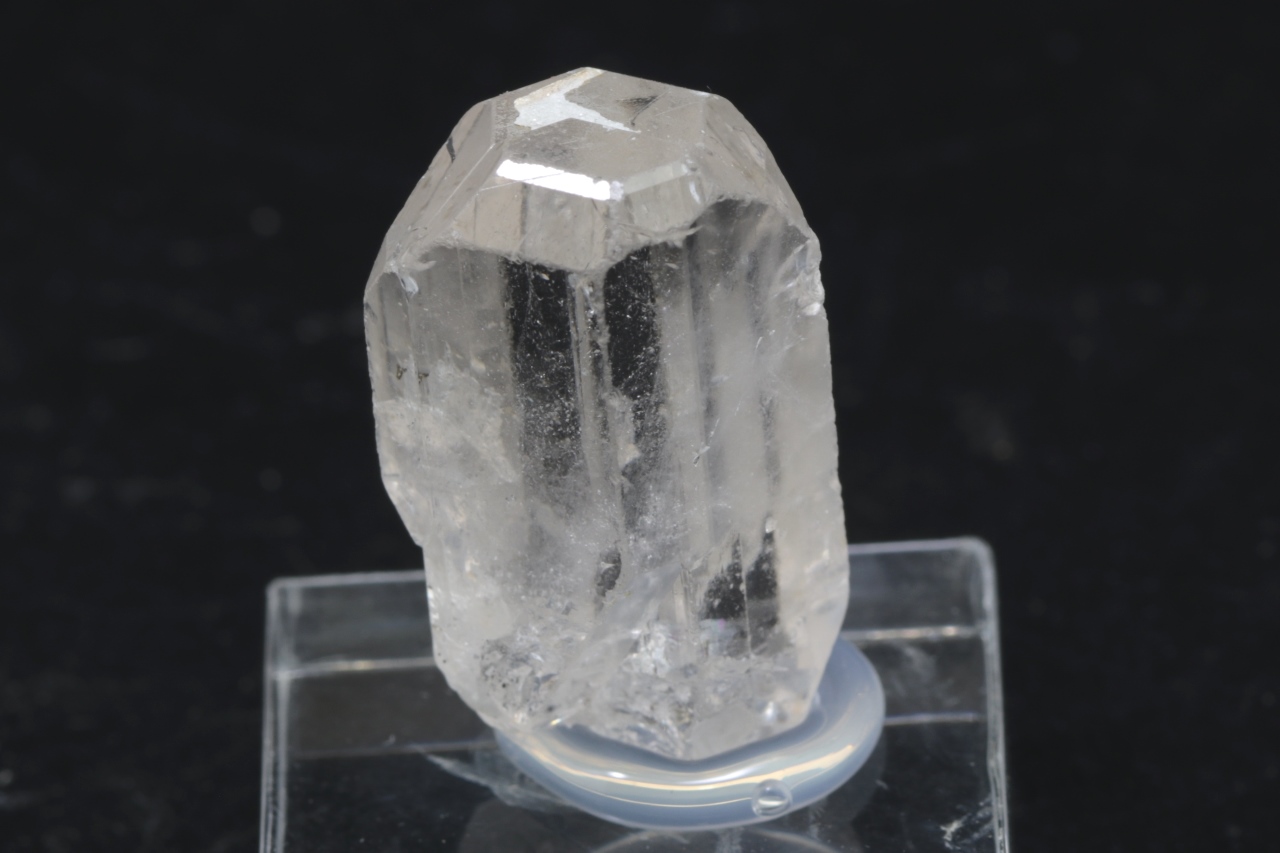 A transparent crystal of slightly yellowish topaz with well-defined, shiny crystal faces.