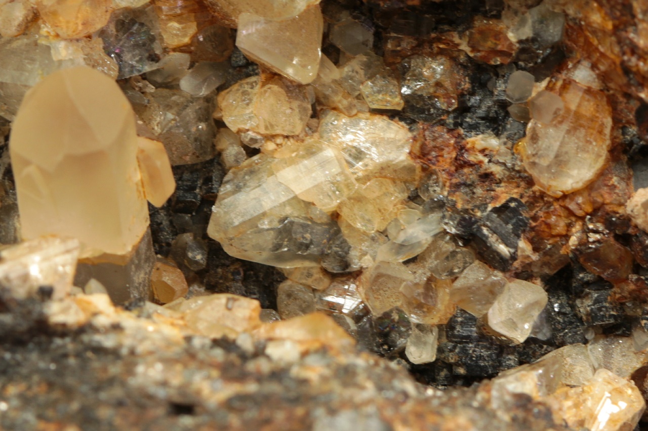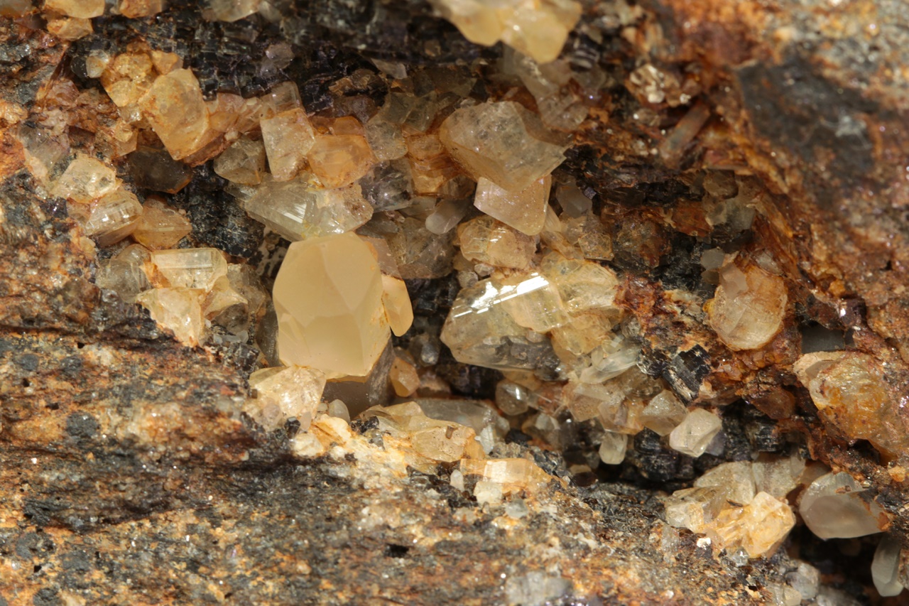 Světle žluté krystaly topazu až 9 mm velké narostlé do dutiny s krystalem křemene.