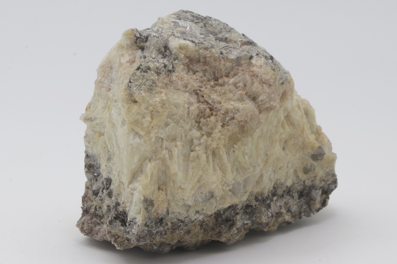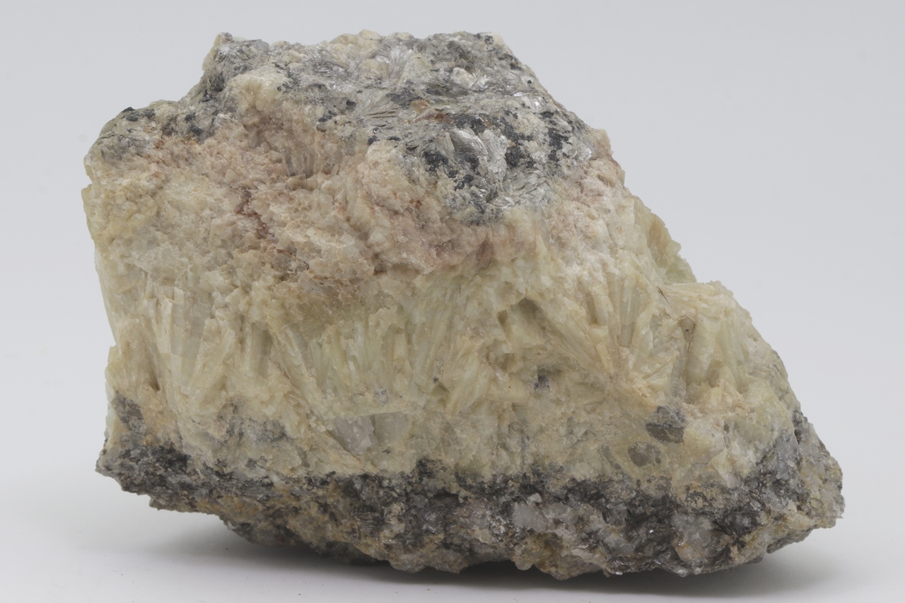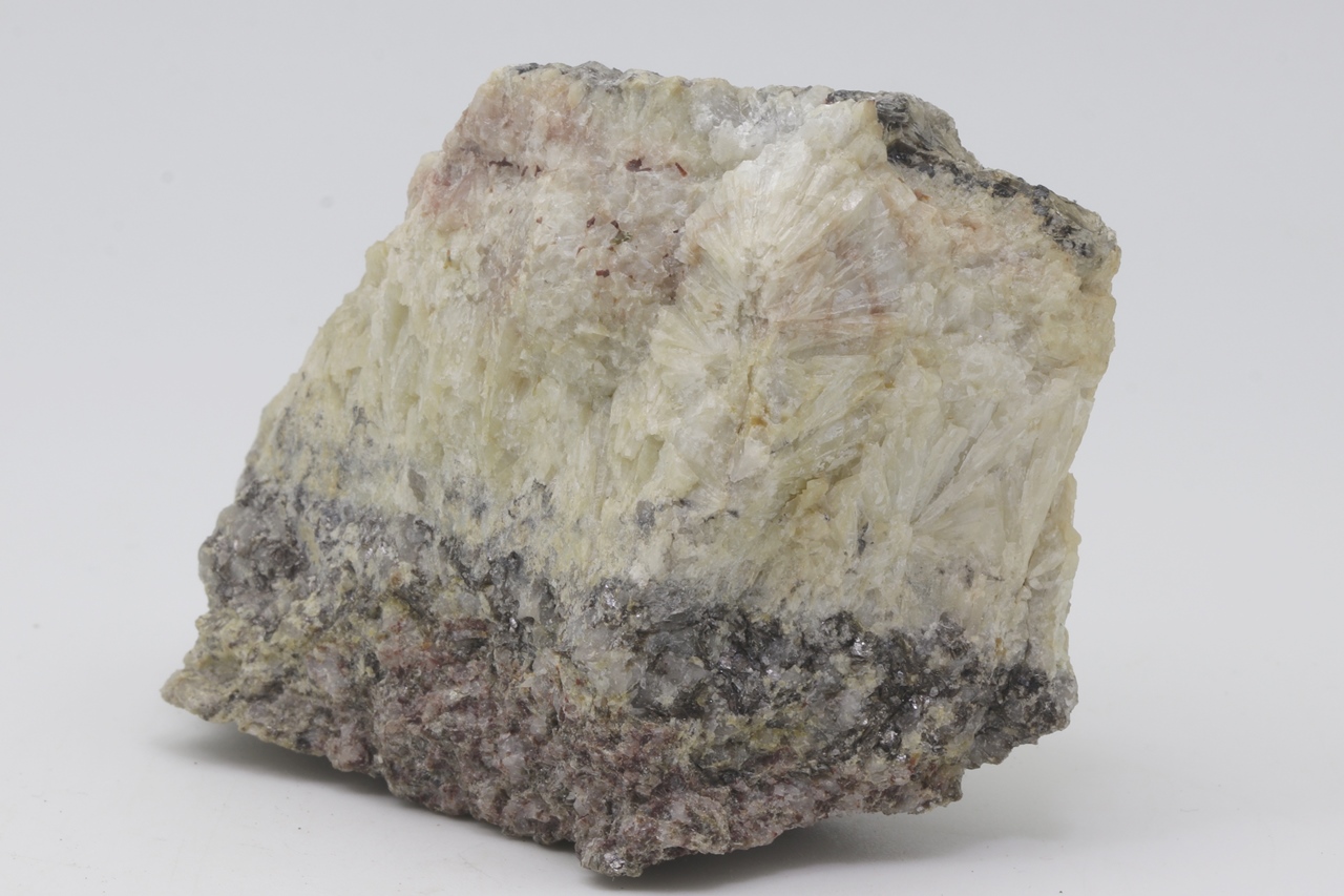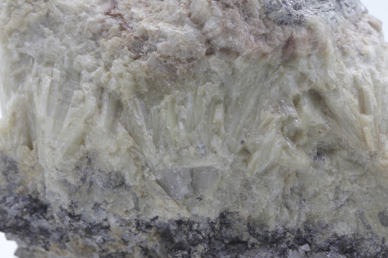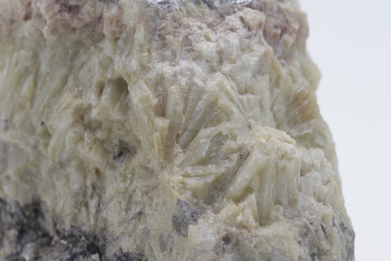 Radial aggregates of elongated columnar crystals of pale yellow topaz known as “pyknit”. The vein is up to 5 cm thick .