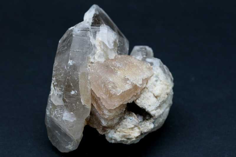 Specimen of topaz with a smoky quartz cluster. Interesting specimen of pinkish clear crystal of topaz.