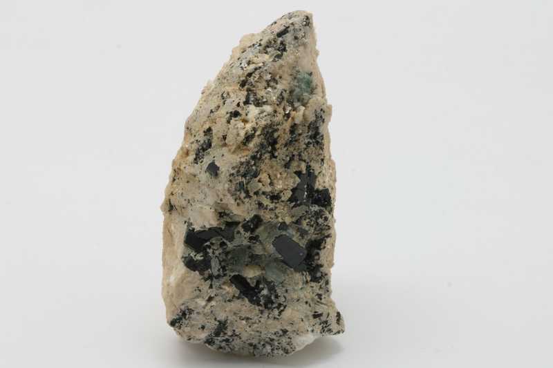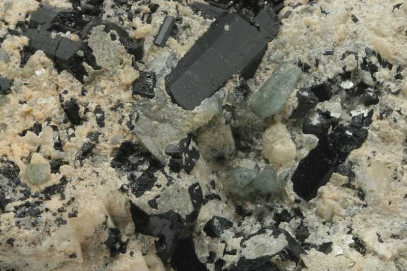 An aesthetic specimen of pegmatite with black Tourmaline and bluish Apatite. The largest Tourmaline crystal is 15 mm, Apatite 5 mm. The specimen comes from the Oldřich vein from the year 1968.