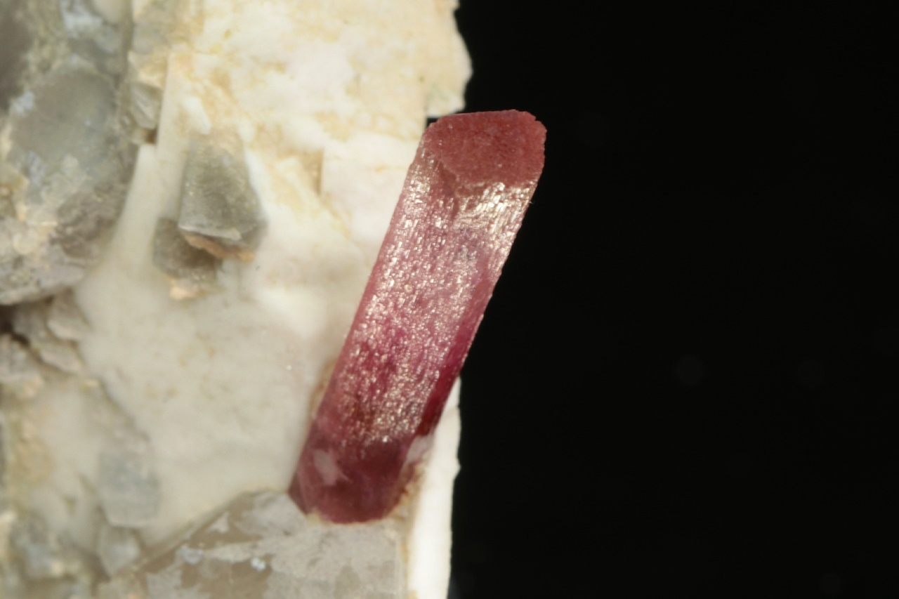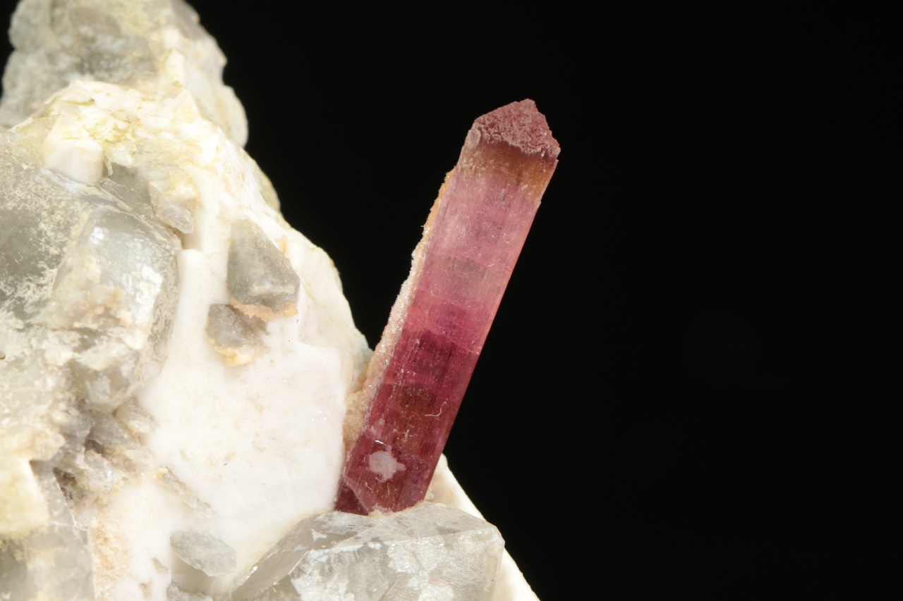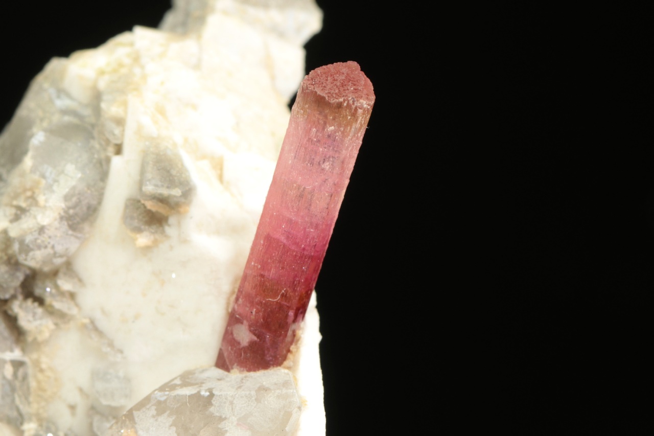 Crystal of well-limited pink tourmaline projecting into space from a quartz-feldspar base. The crystal is lighter in the upper half, the length of the crystal is 2 cm.