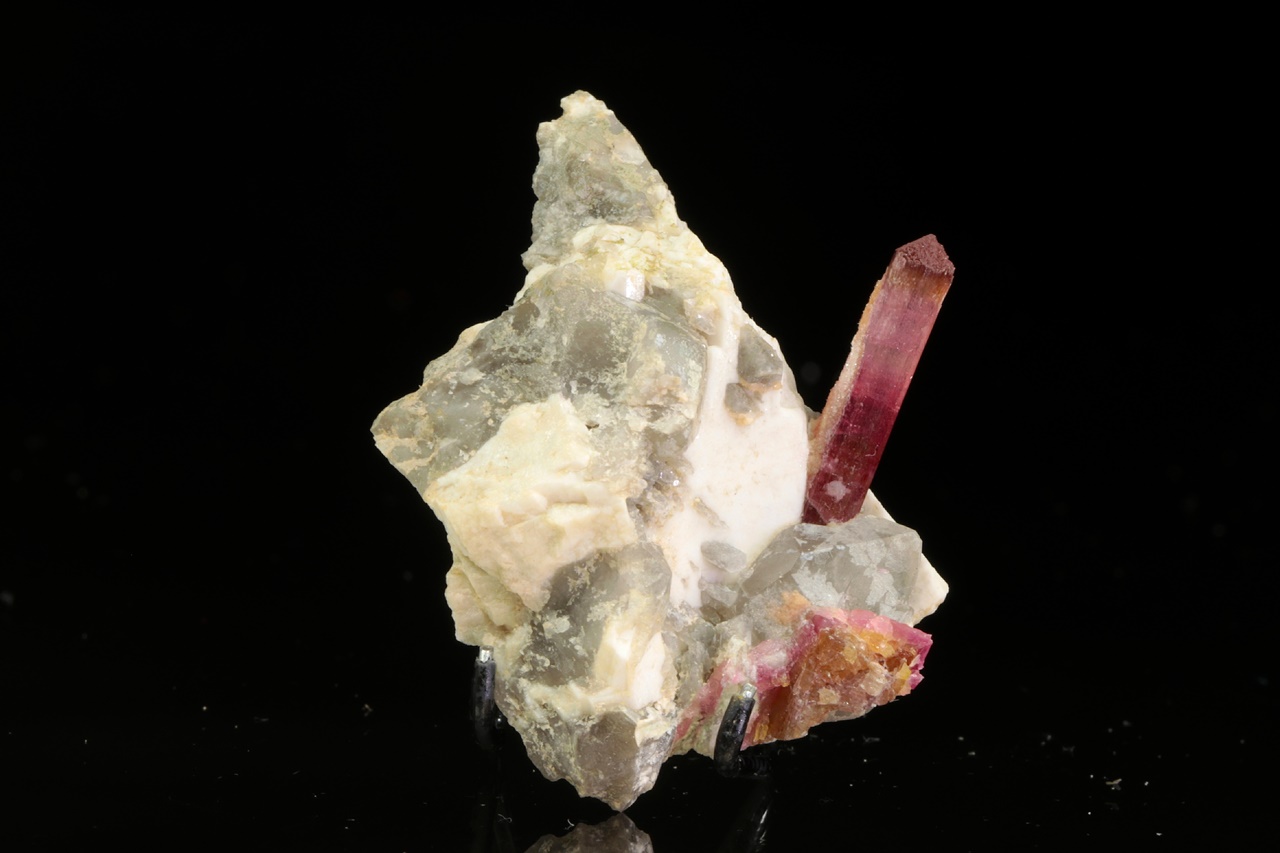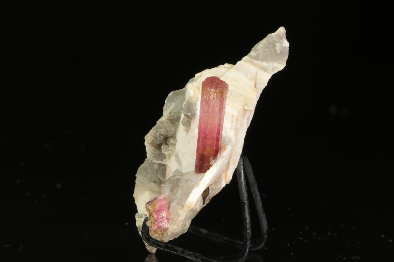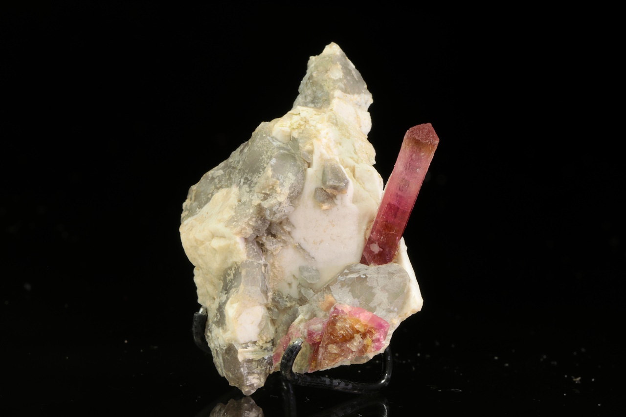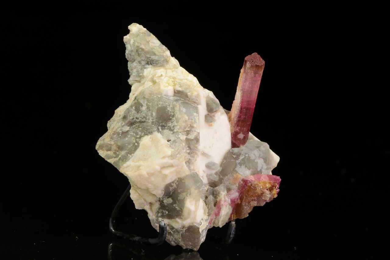Crystal of well-limited pink tourmaline projecting into space from a quartz-feldspar base. The crystal is lighter in the upper half, the length of the crystal is 2 cm.