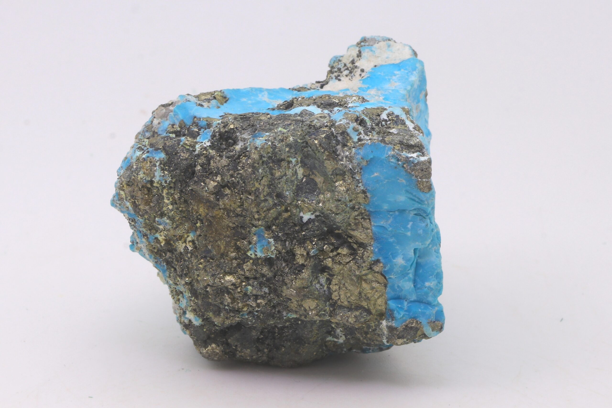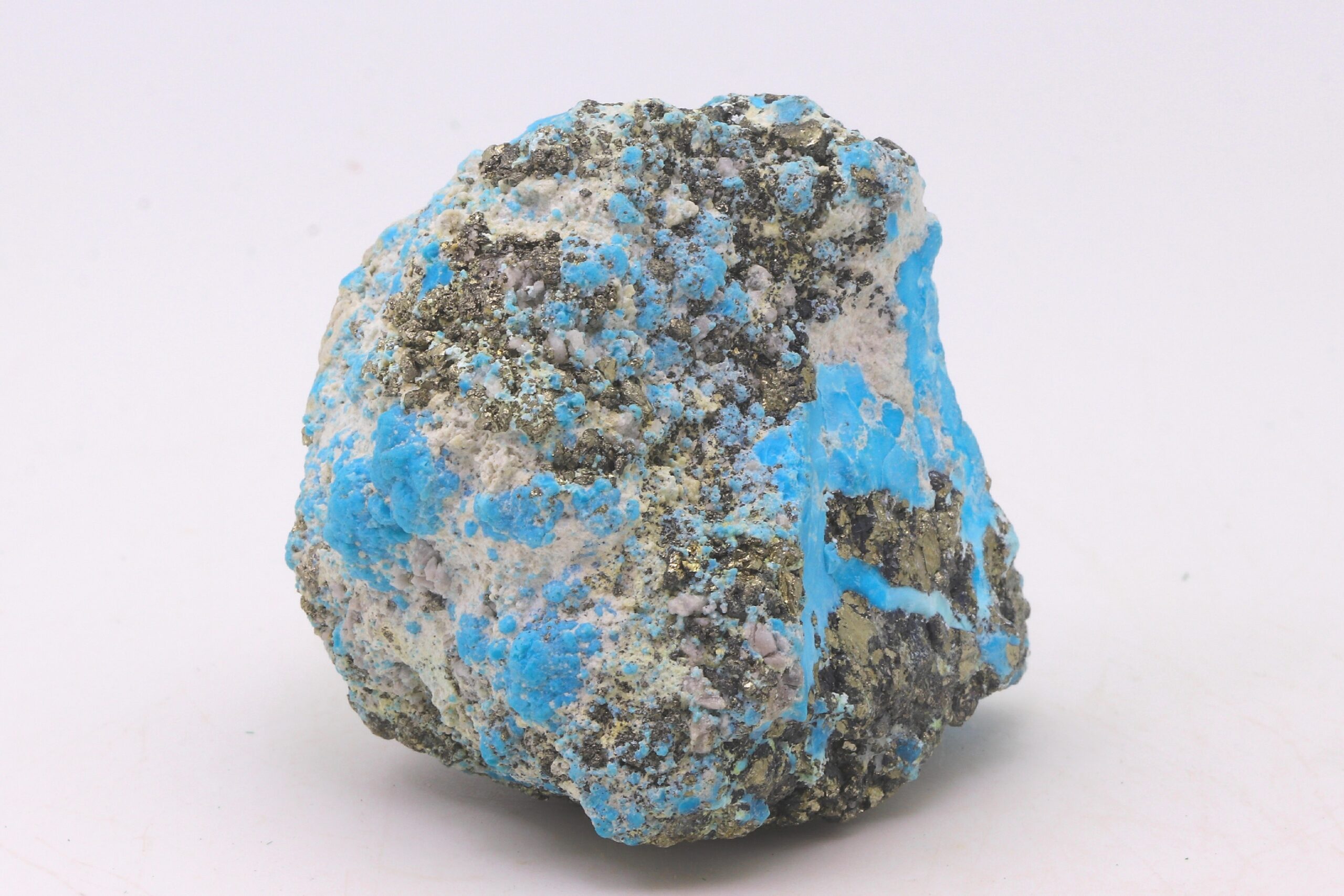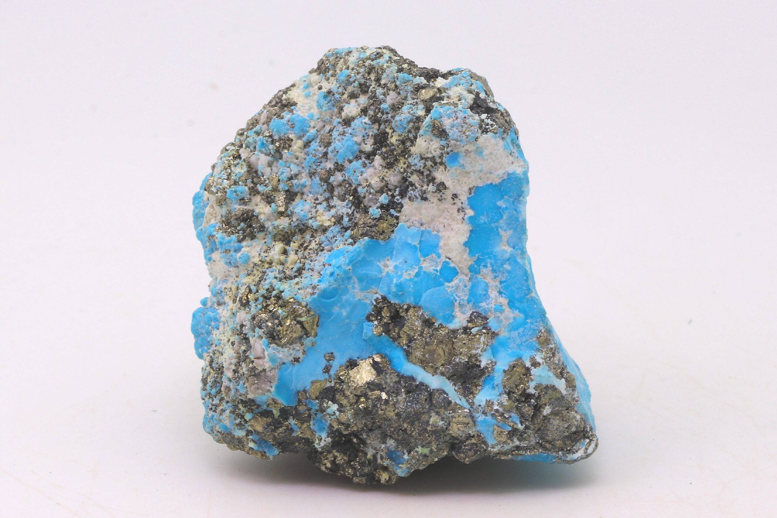 The beautifully blue Turquoise with golden, metallic shining aggregates of pyrite from the Iranian locality have been known for 4000 years.