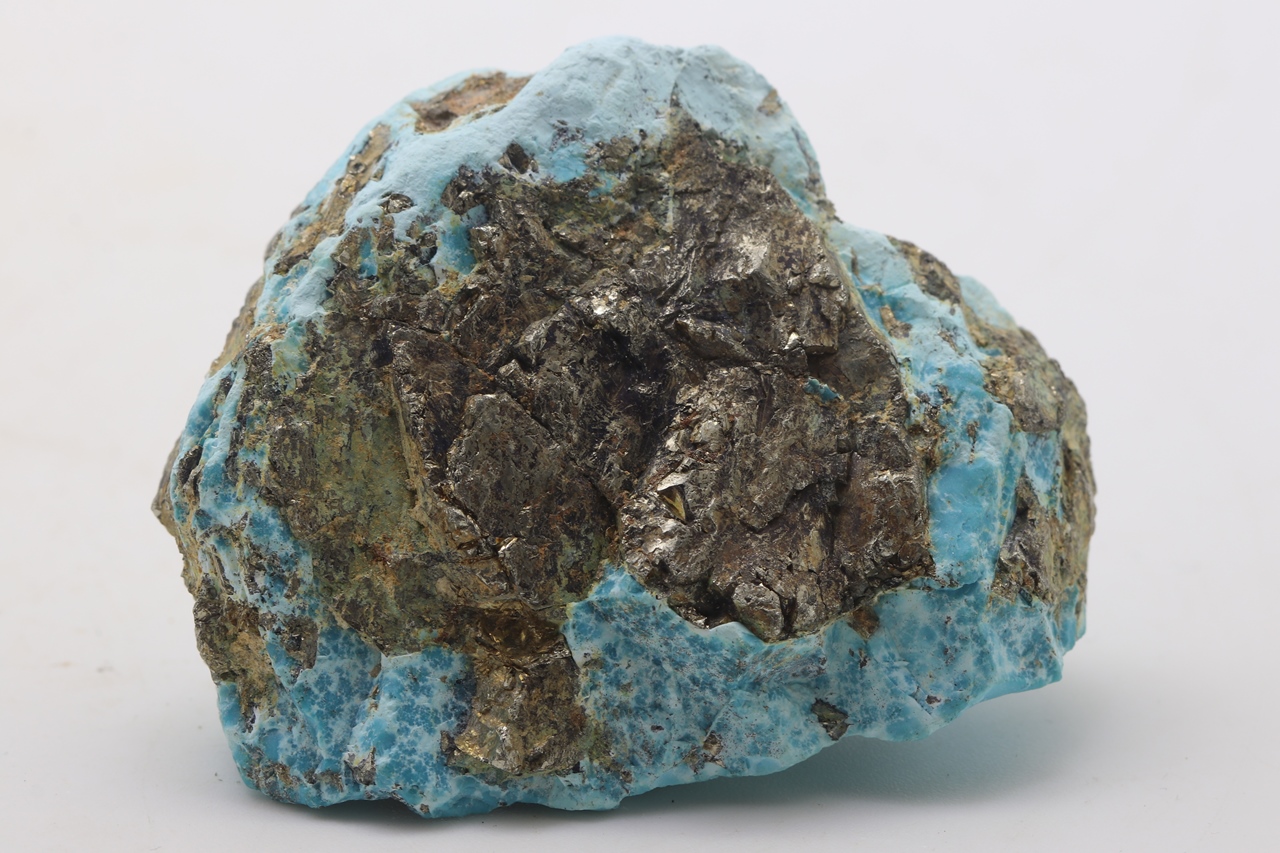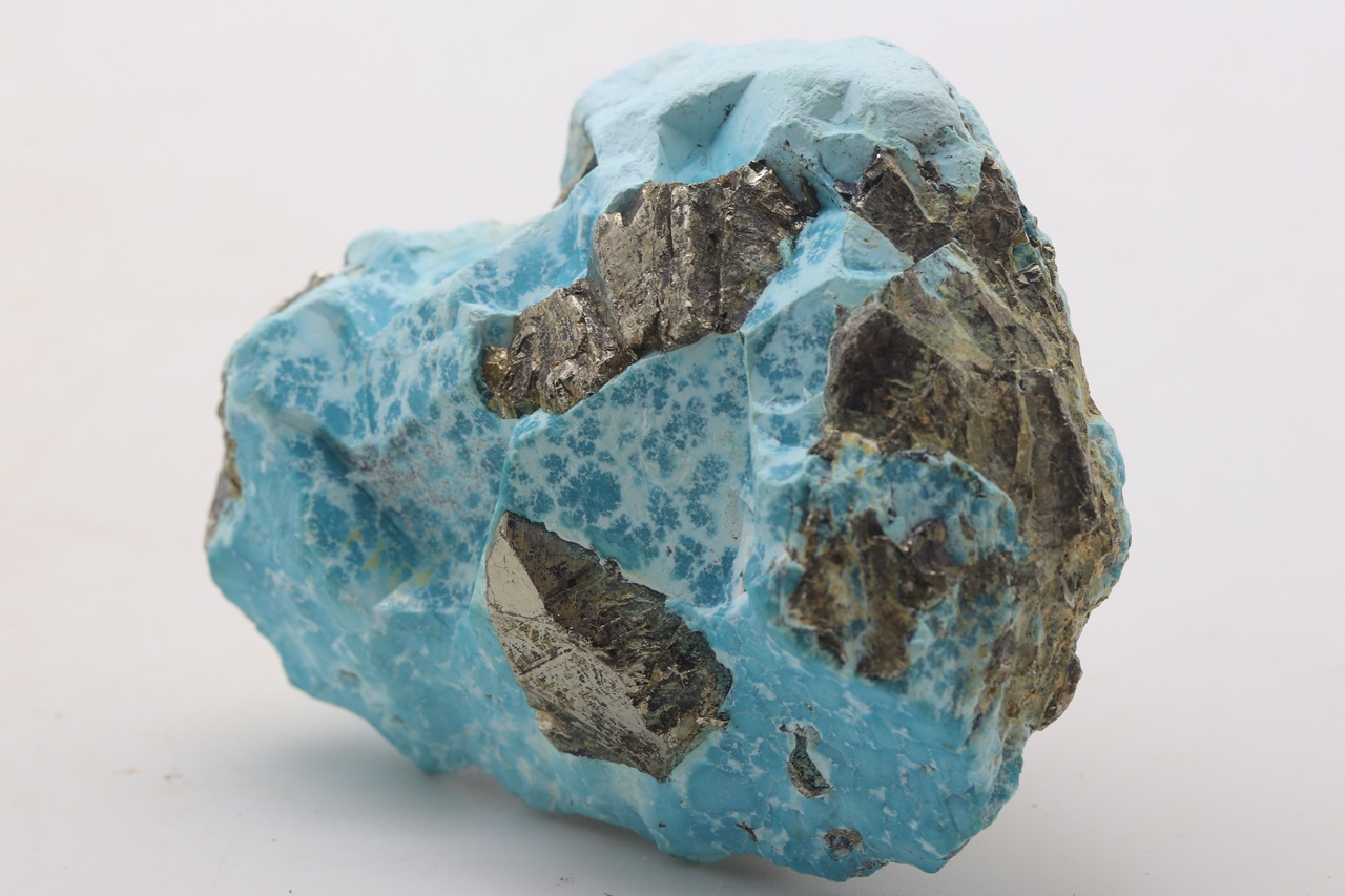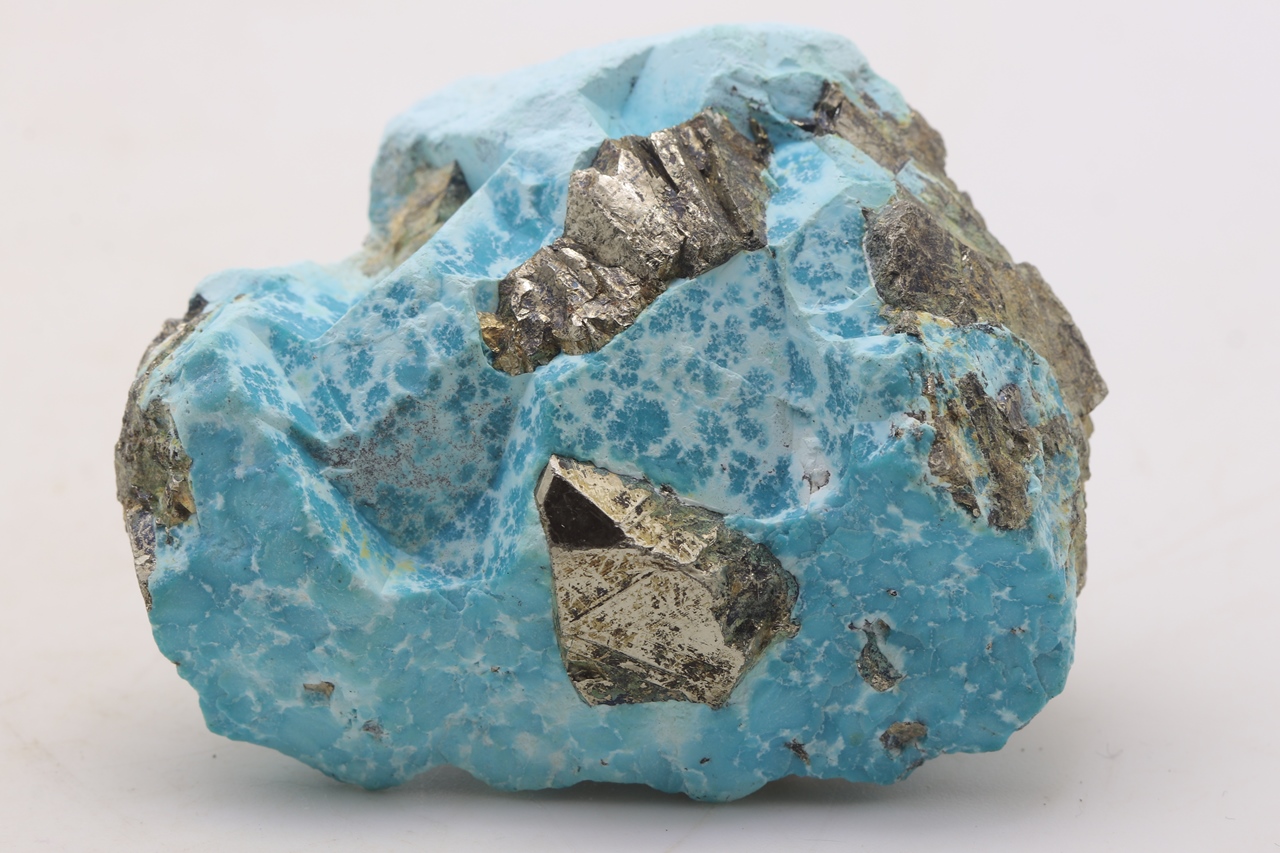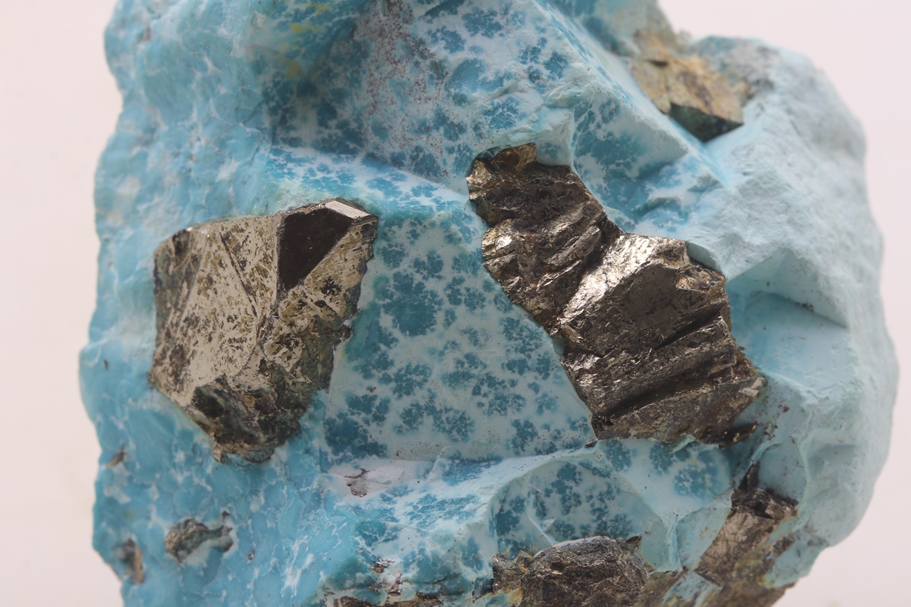 Unique specimen of turquoise in association with well-developed crystals of pyrite up to 2 x 1.5 cm in size .