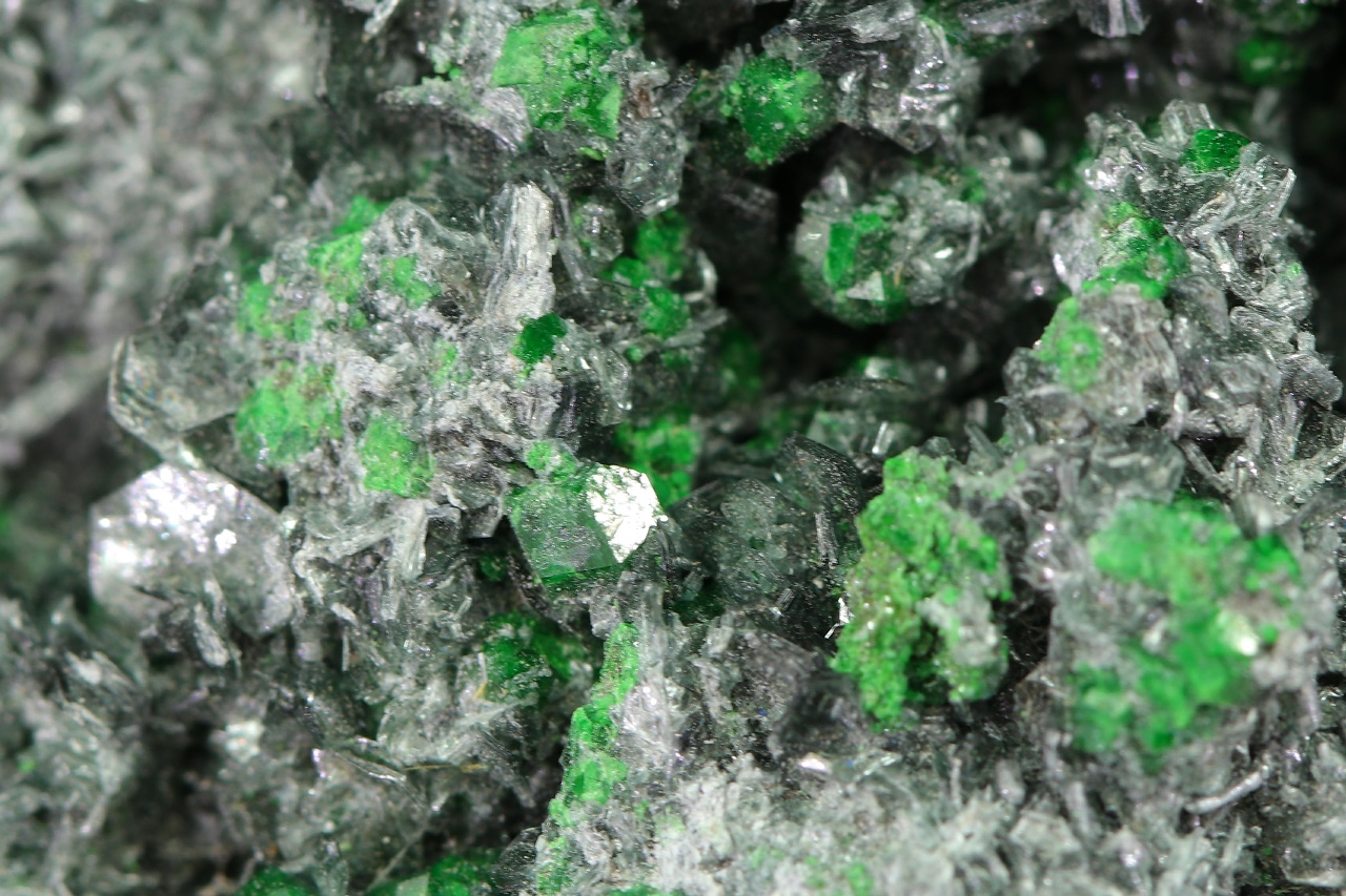 Deep green, shiny uvarovite crystals with gray, chromium-rich clinochlore. Clinochlore shows a change of color when illuminated with tungsten light. The largest uvarovite crystals are 2 mm in size.