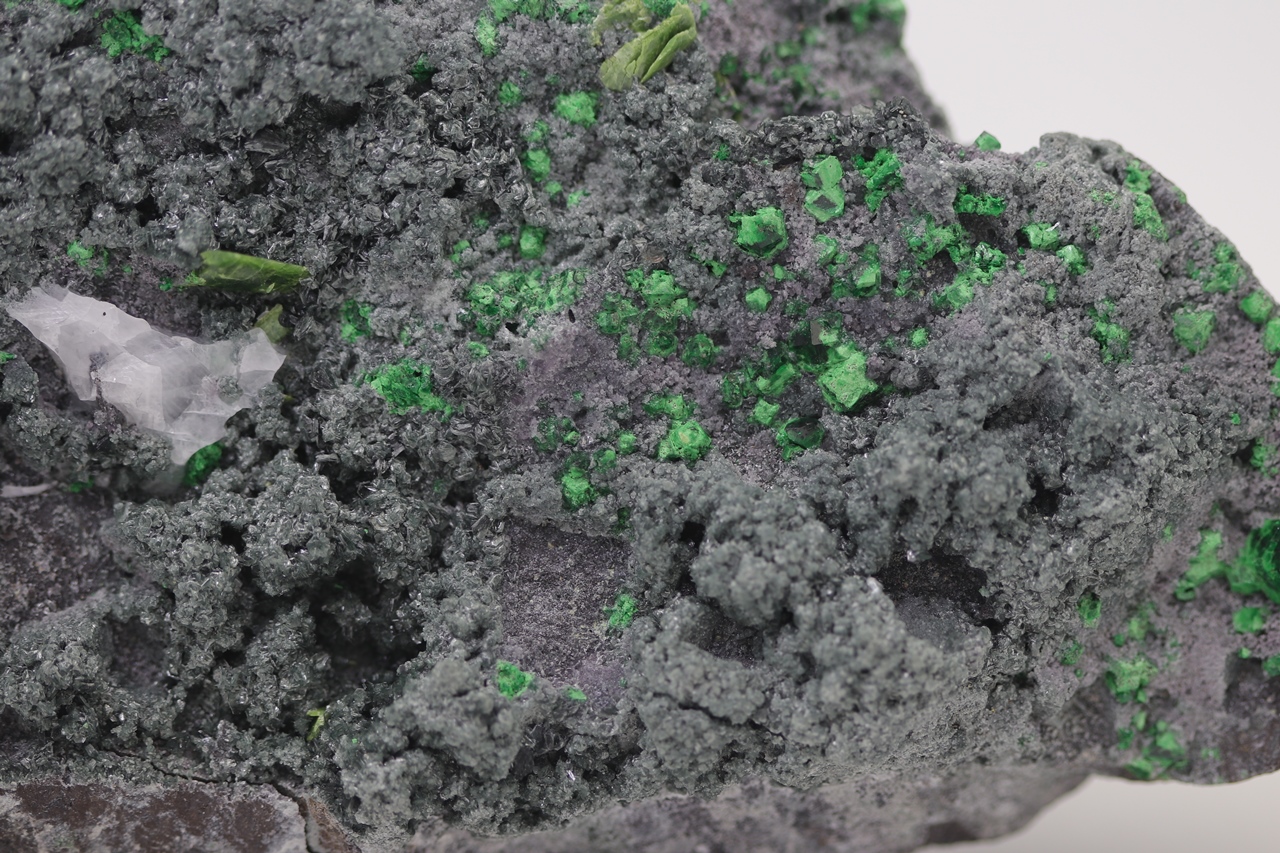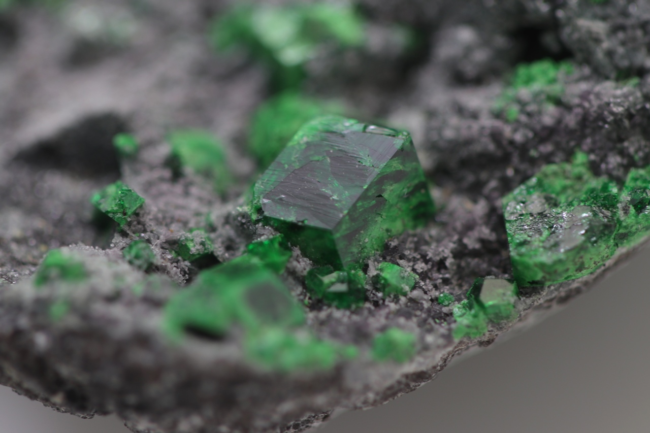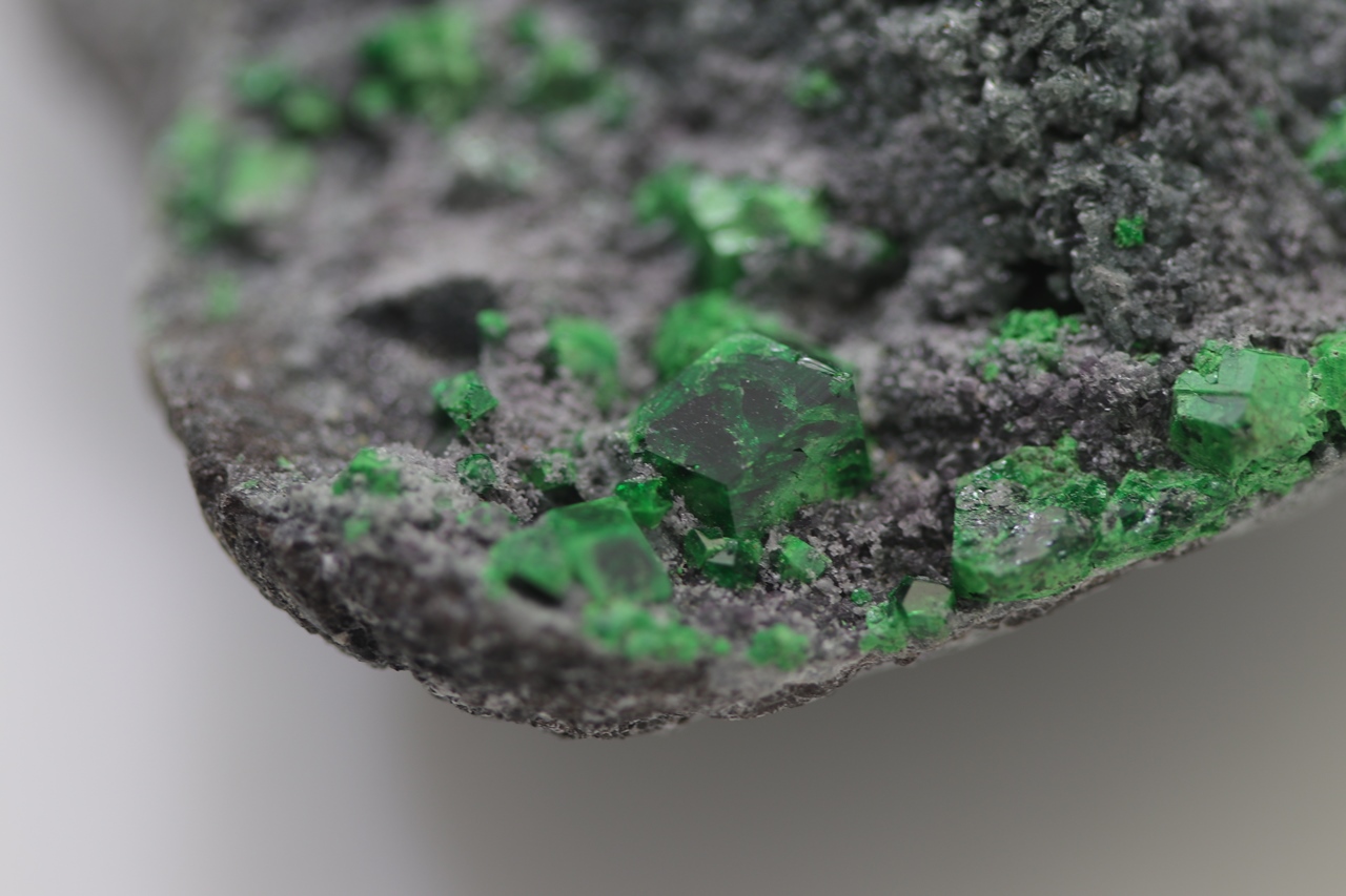 Uvarovite on this specimen forms cubic, dark green, locally partial characteristic crystals. On this specimen, there is one large uvarovite crystal reaching a size of 5 mm. Another mineral that is exhibited on this specimen are the platy crystals of light green Titanite. These titanite crystals reach a size of 7 mm. Given the nice, collection-worthy format and the combination of dark green uvarovites, light green titanites, and a dark gray matrix rock it represents an aesthetically very appealing collection specimen.
