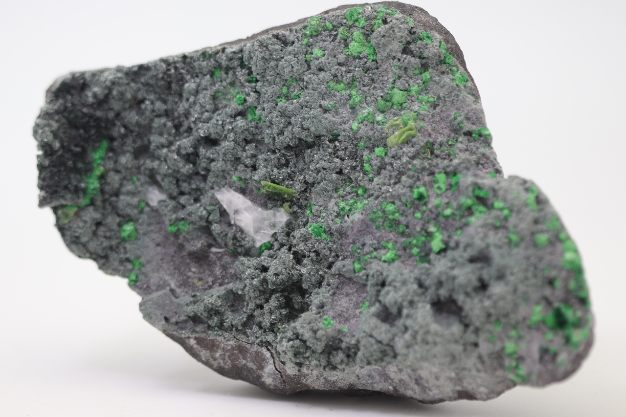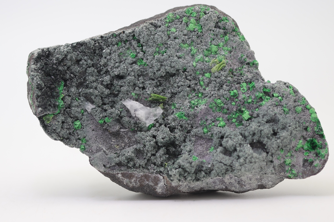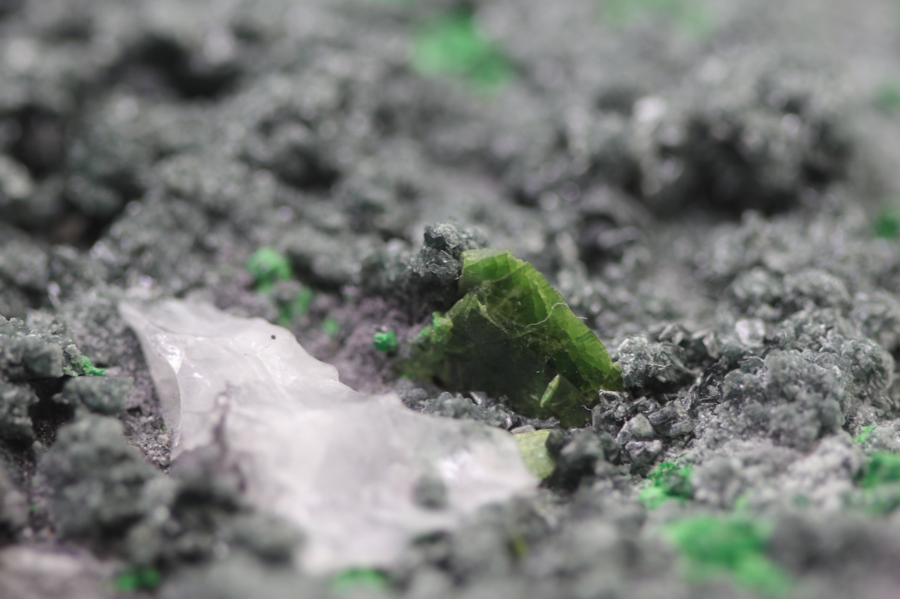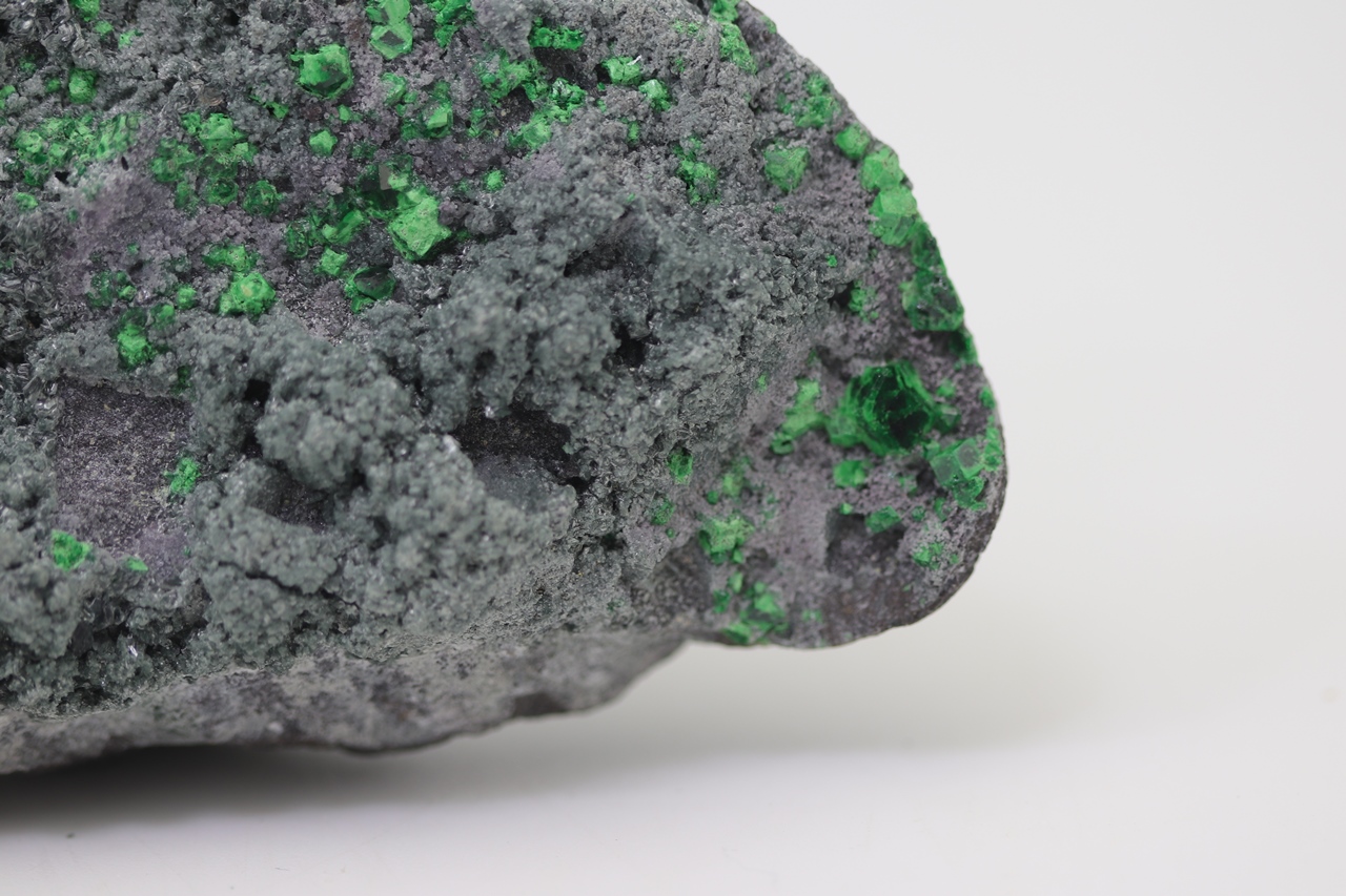 Uvarovite on this specimen forms cubic, dark green, locally partial characteristic crystals. On this specimen, there is one large uvarovite crystal reaching a size of 5 mm. Another mineral that is exhibited on this specimen are the platy crystals of light green Titanite. These titanite crystals reach a size of 7 mm. Given the nice, collection-worthy format and the combination of dark green uvarovites, light green titanites, and a dark gray matrix rock it represents an aesthetically very appealing collection specimen.