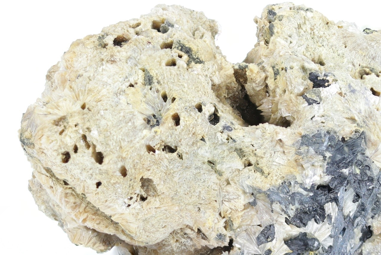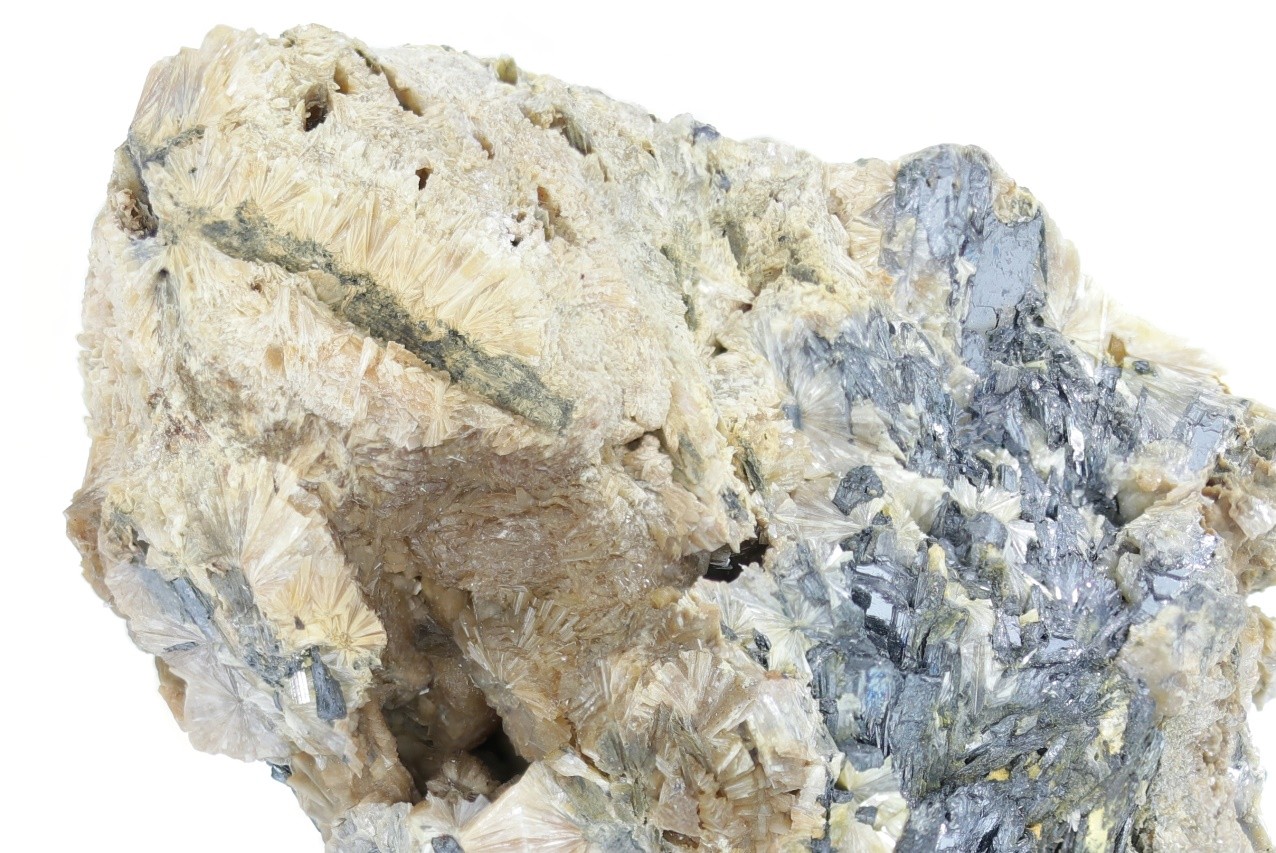 Radial cluster of metallic lustrous crystals of Antimonit overlaid by a radial aggregate of beige Valentinite. The longest crystal of Antimonit is 4 cm large.