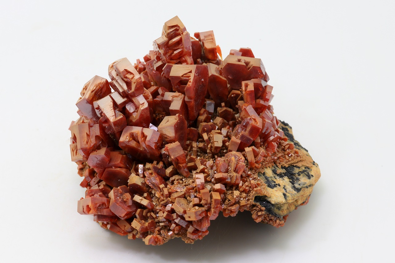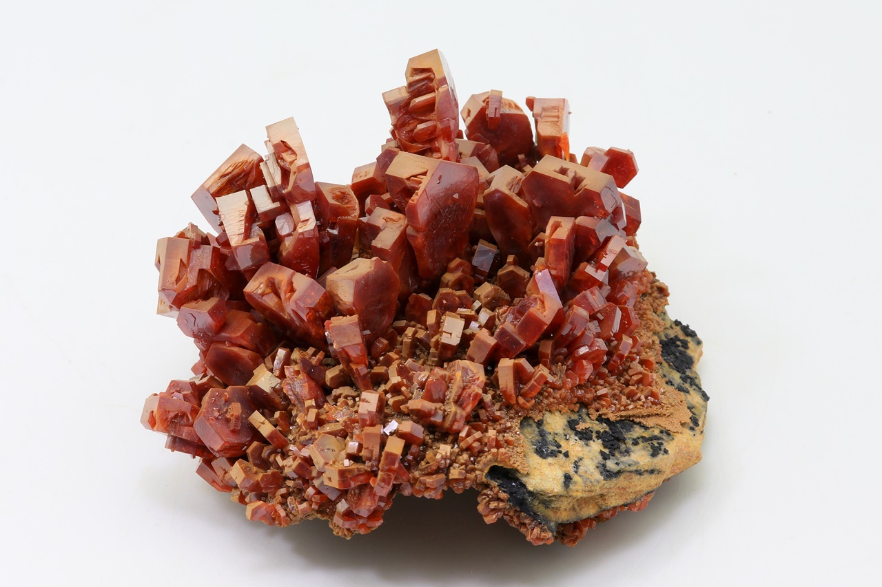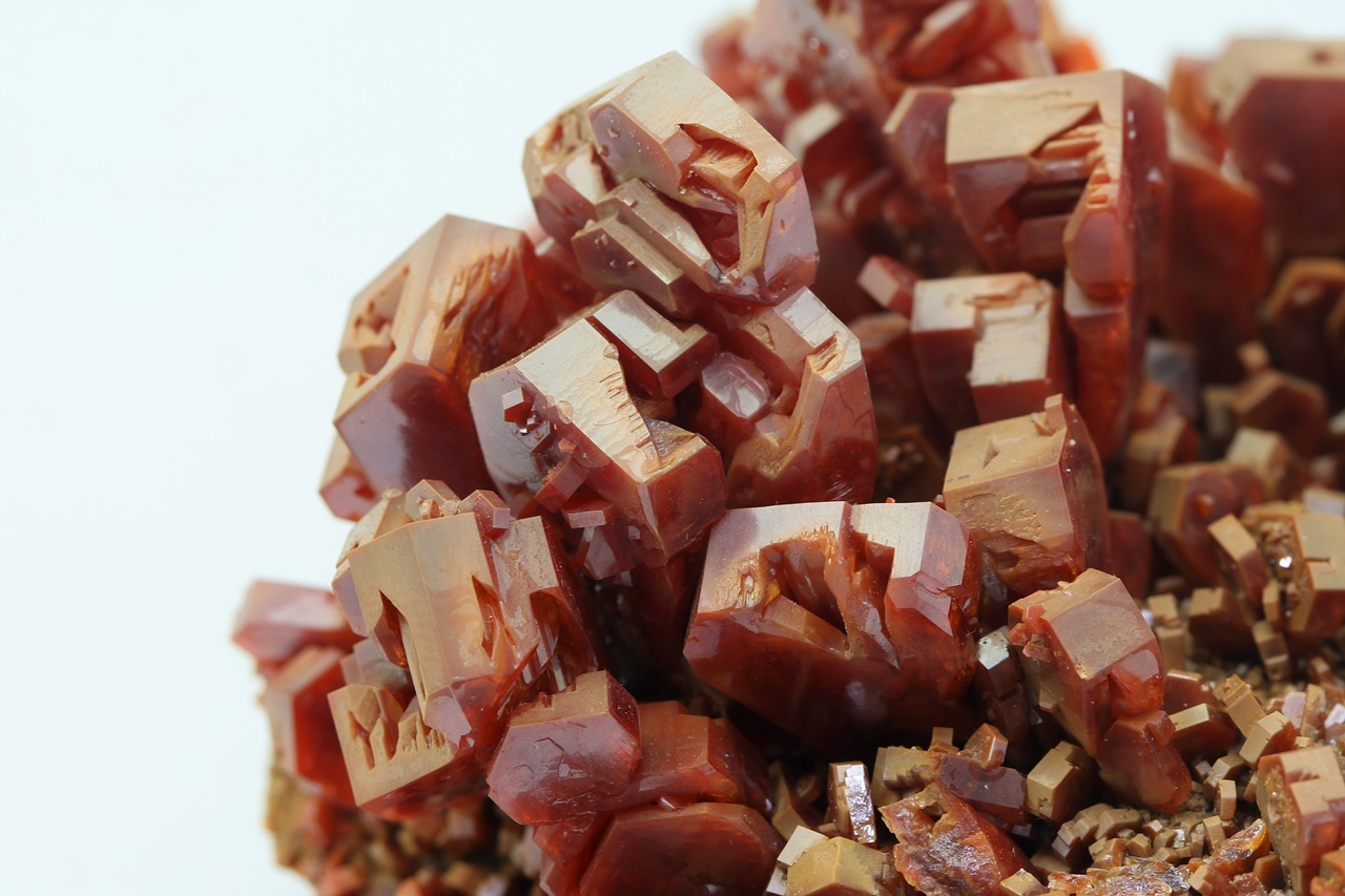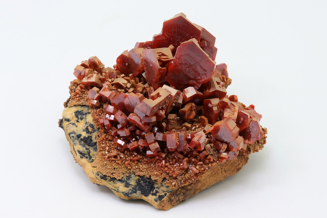 An exceptionally high-quality druse of red vanadinite crystals with pronounced skeletal development. The largest crystal is 3 cm in size .