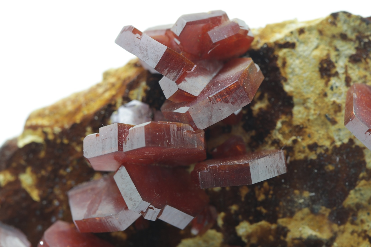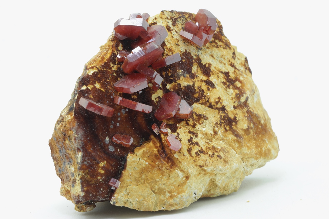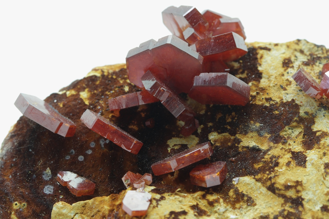 Beautiful, large, lustrous crystals of intensely red vanadinite. The largest crystal is 12 mm in size.