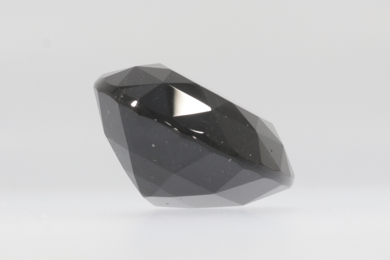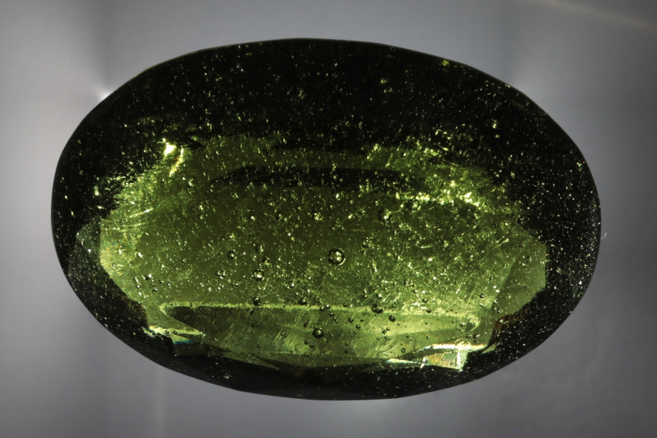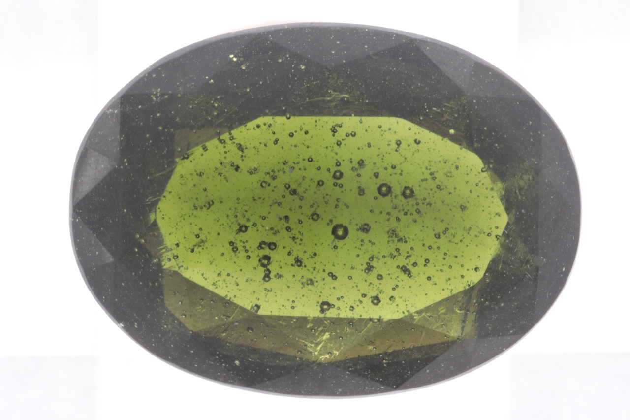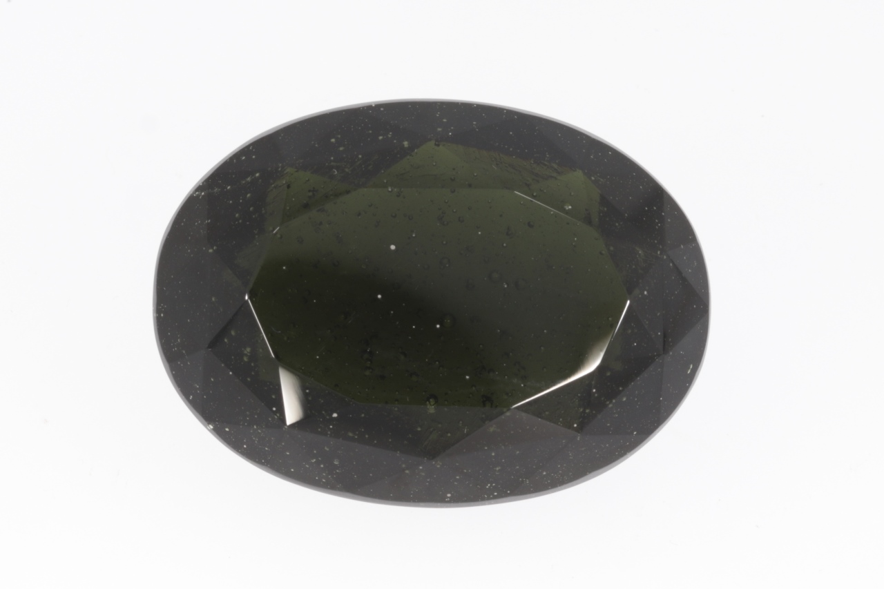 Velmi velký fasetovaný vltavín s pravidelným oválným brusem o hmotnosti 94 karátů.