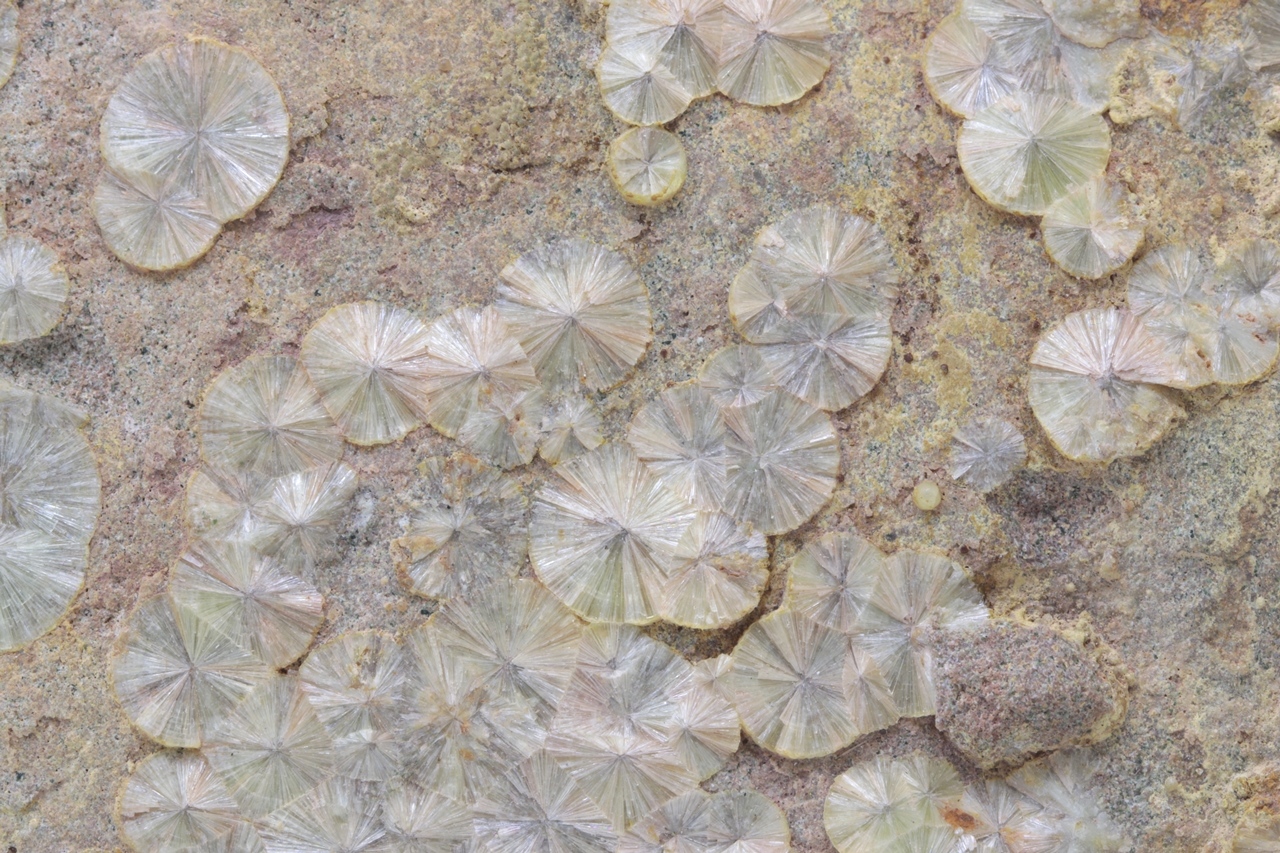 Sample richly dotted with radial aggregates (suns) of beige, in places slightly greenish wavellite. The largest sun is 1 cm large.