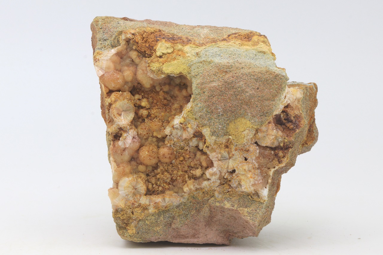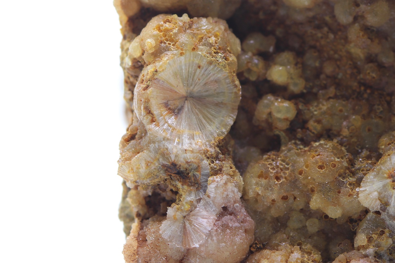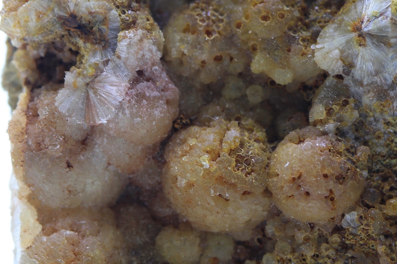 Radial aggregates of light beige Wavellite. The largest aggregate is 1 cm in size.