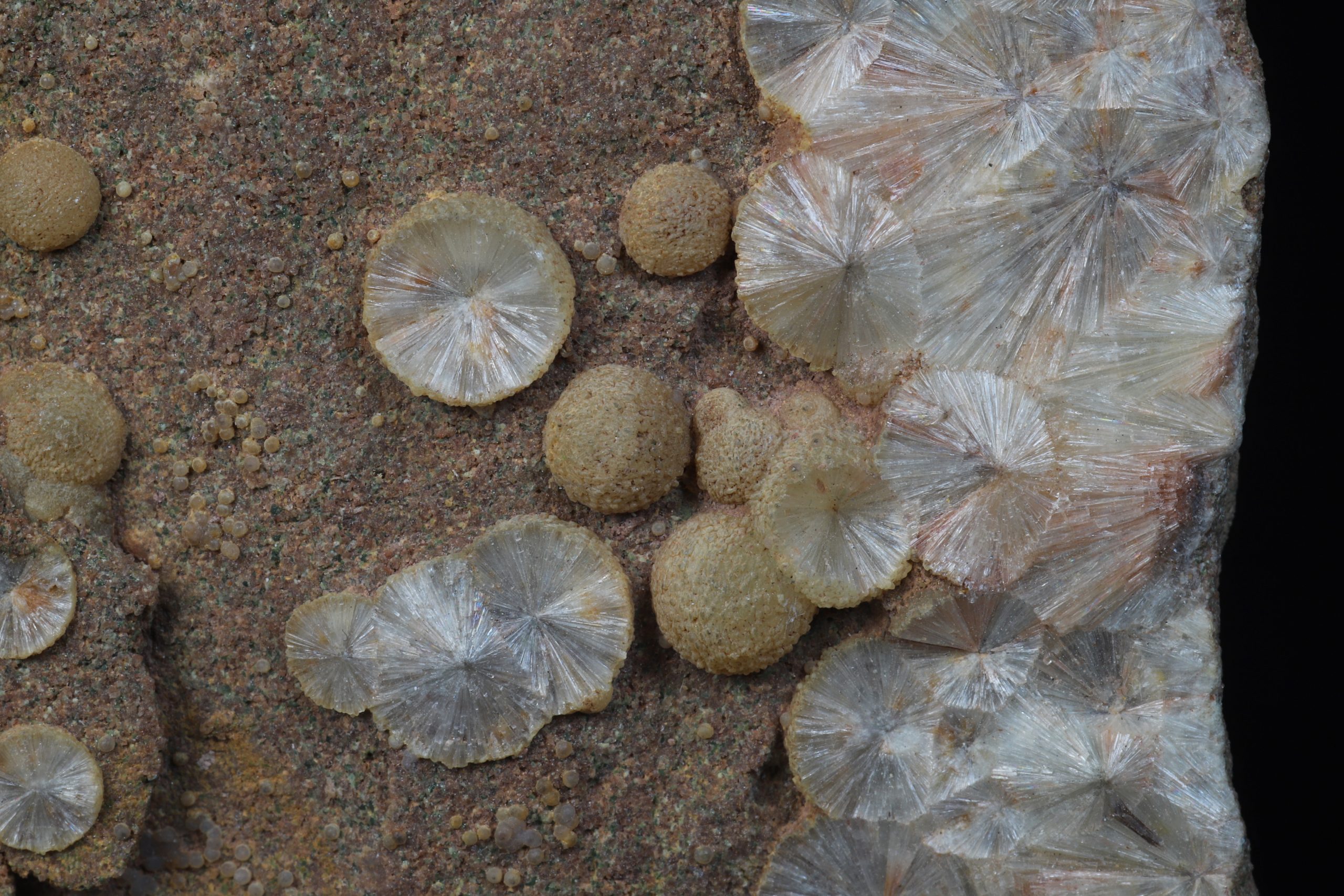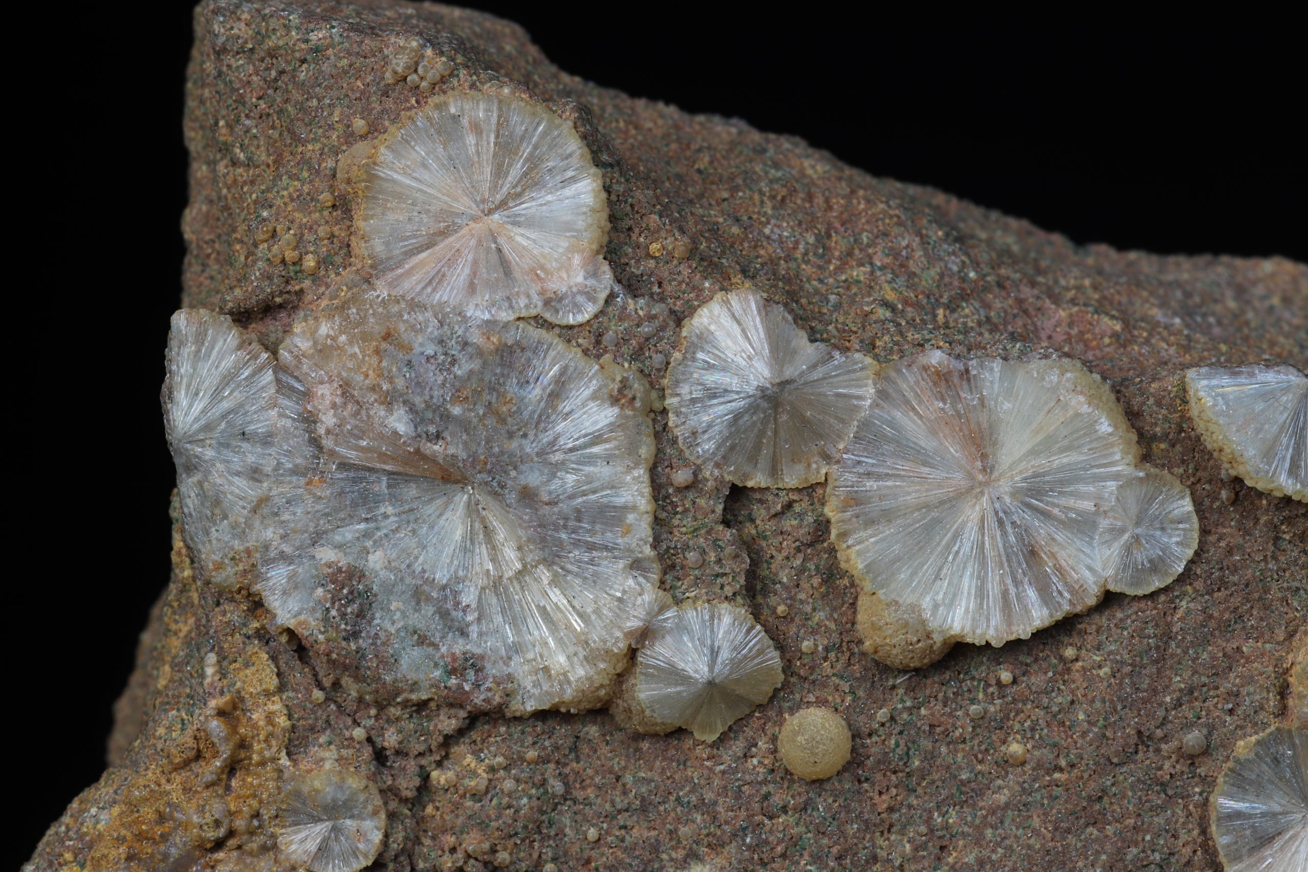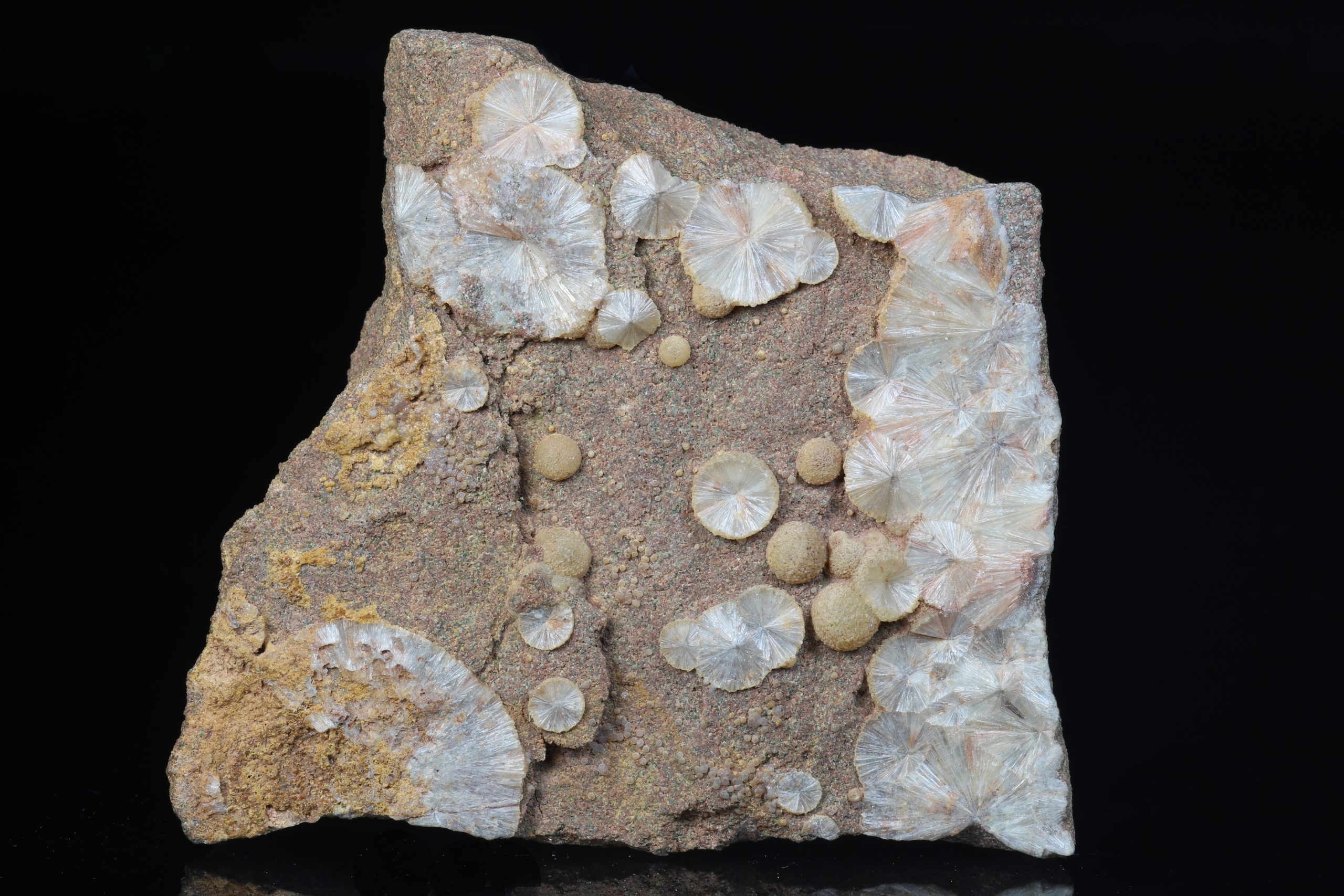 Very nice specimen of white, radially acicular and hemispherical aggregates of wavellite with a radius up to 26 mm together with small, purplish, globular strengite. Rich specimen of phosphates from the classic locality of Třenice.