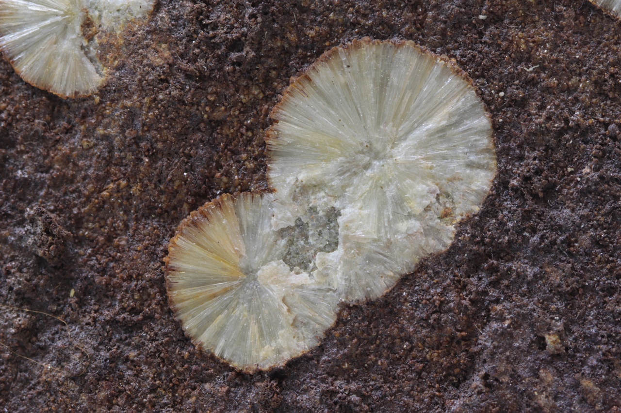 White radial aggregates of wavellite (up to 1 cm in size) grown on a contrasting brown substrate. In the top left sample, there is a complete, only slightly bruised, 6 mm large sphere.