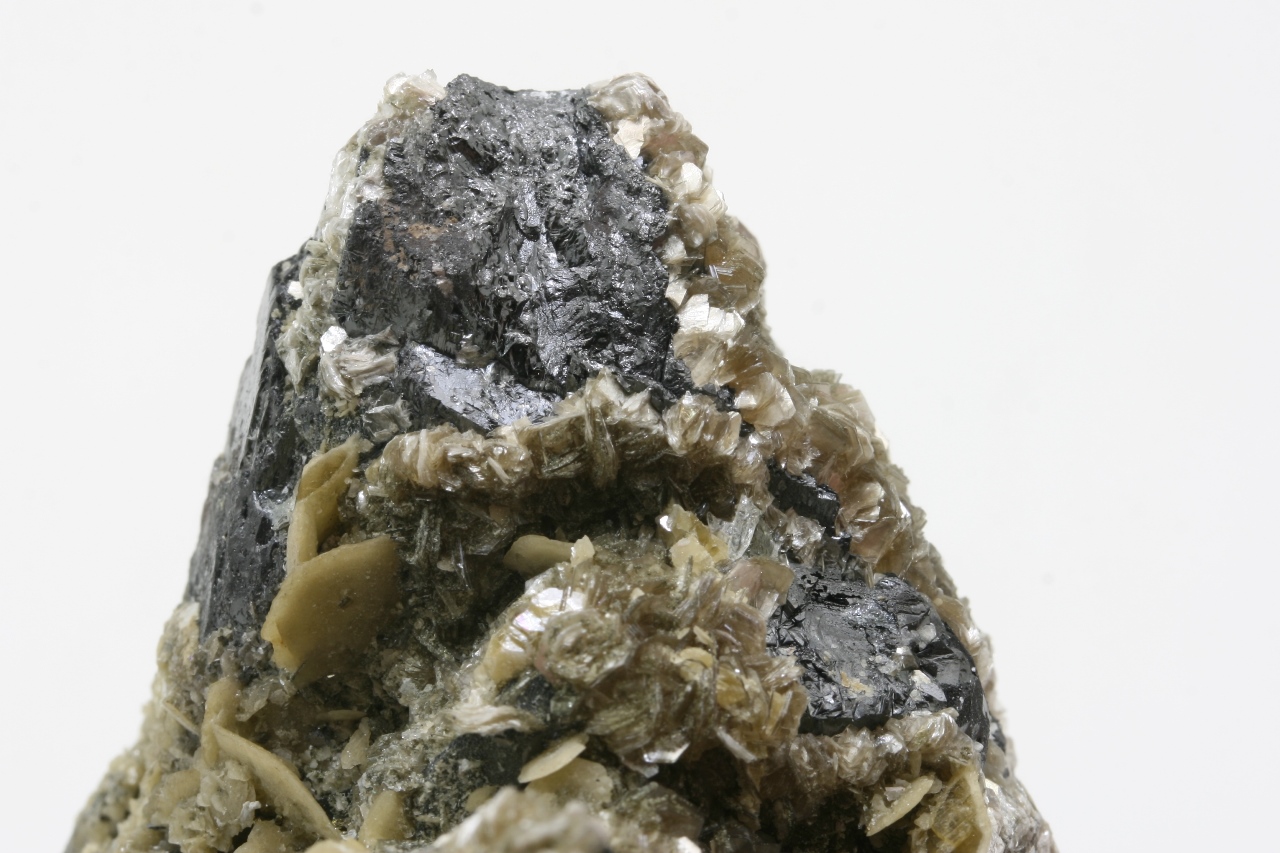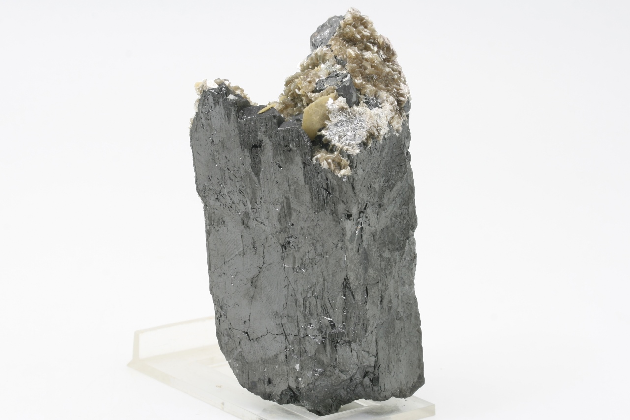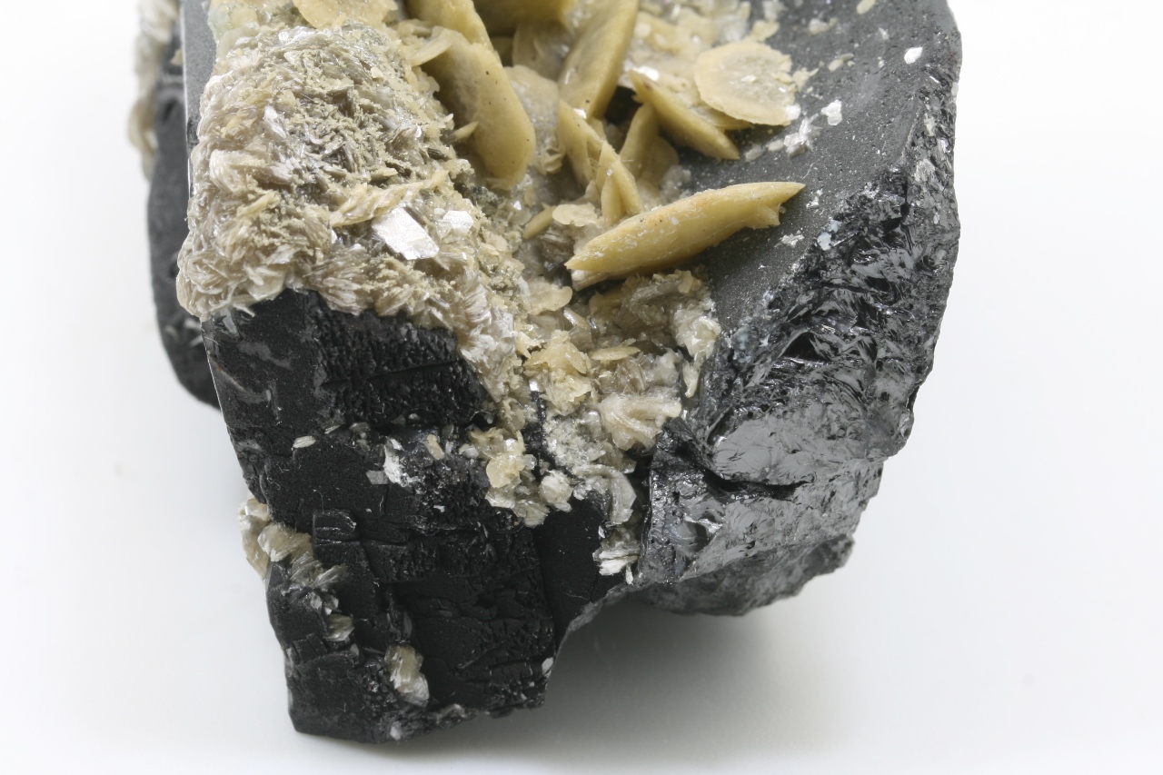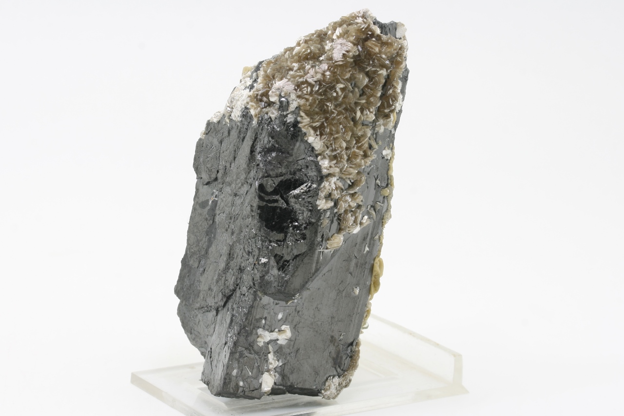 A twin of two beautiful crystals of black, very shiny wolframite. The crystals are limited even from the bottom. Wolframite covered with tabular siderite on the front and white mica on the side.
