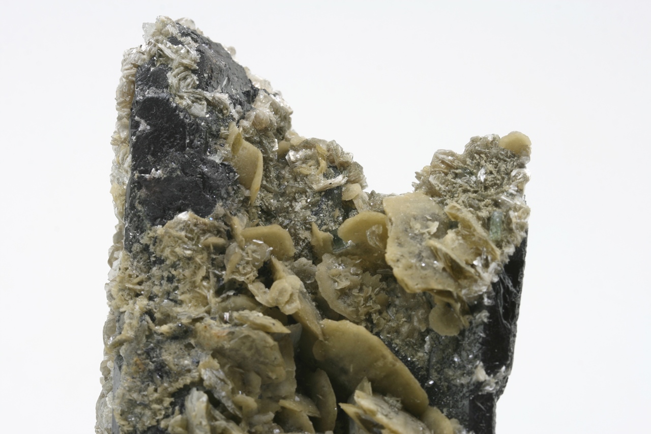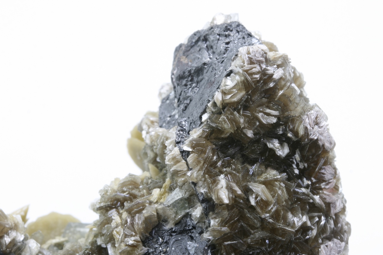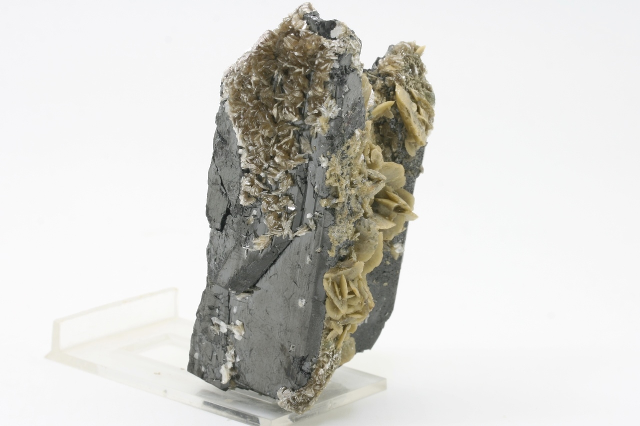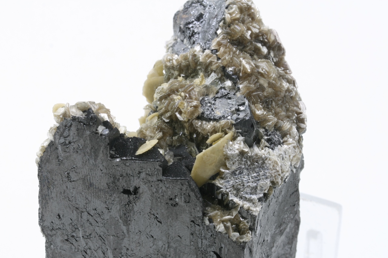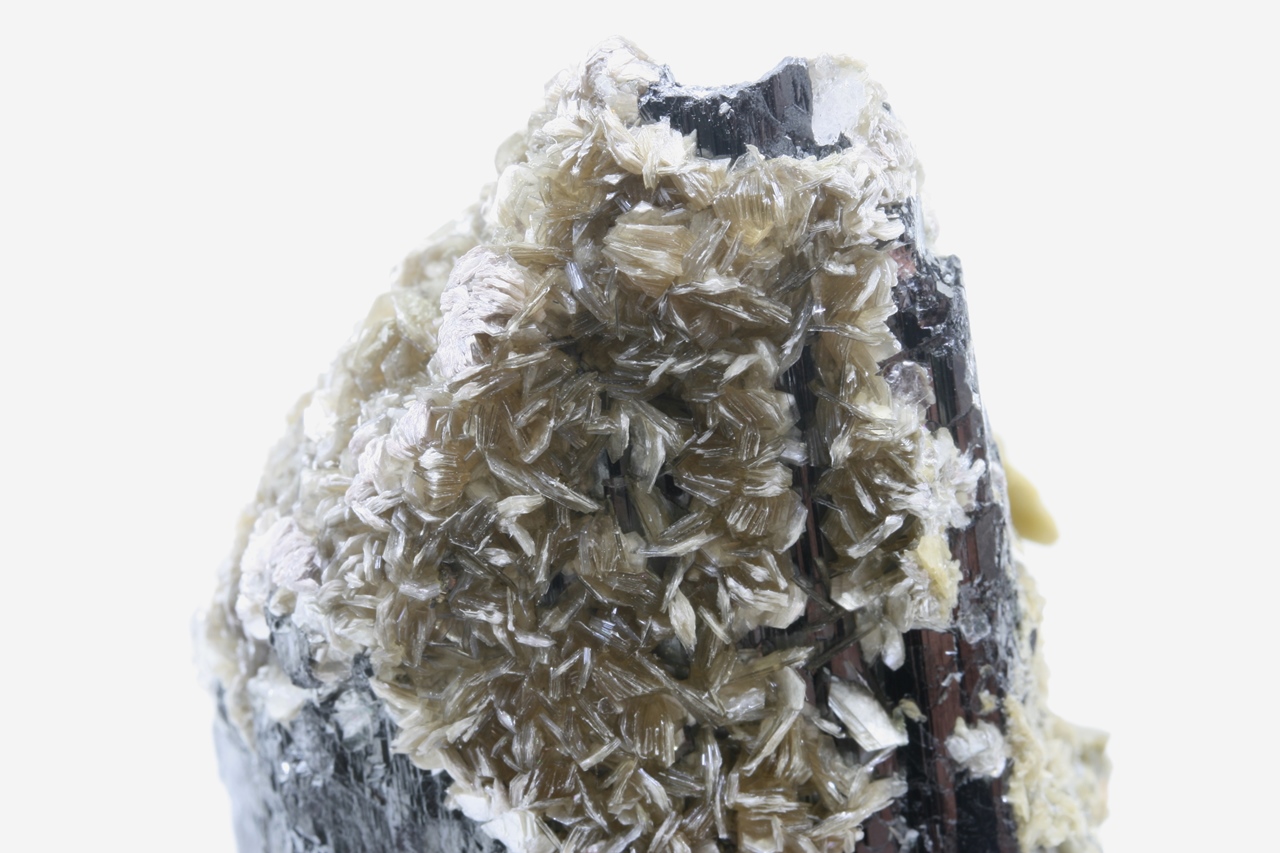 A twin of two beautiful crystals of black, very shiny wolframite. The crystals are limited even from the bottom. Wolframite covered with tabular siderite on the front and white mica on the side.