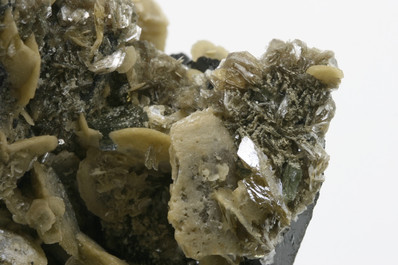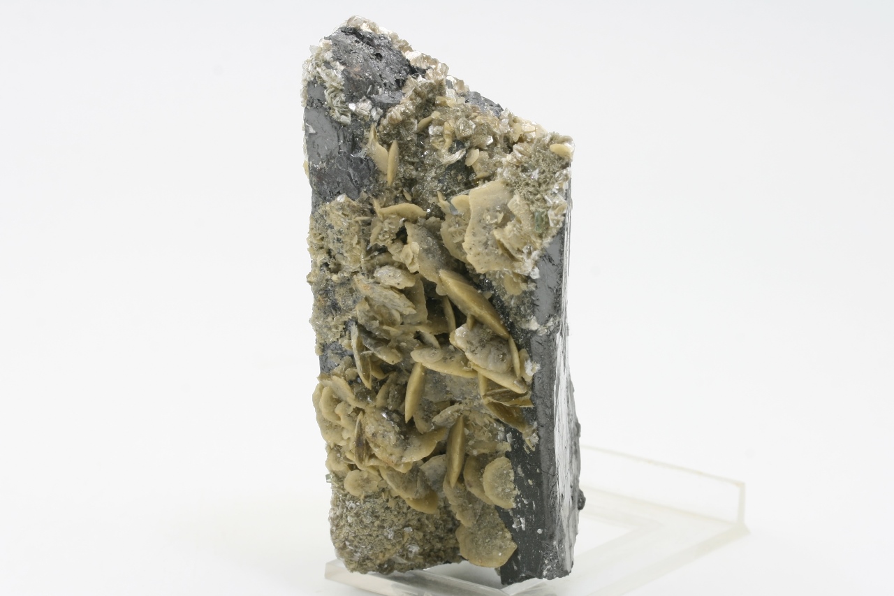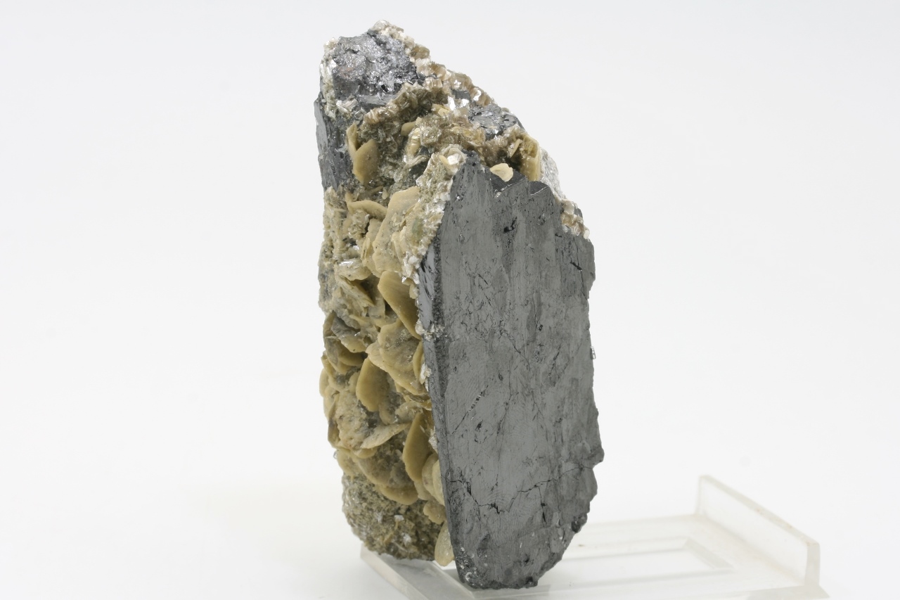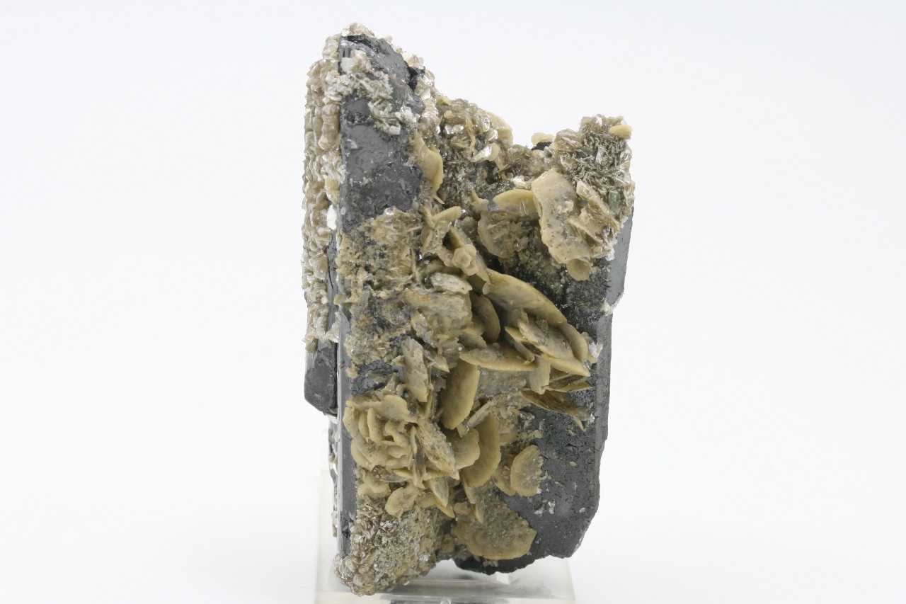 A twin of two beautiful crystals of black, very shiny wolframite. The crystals are limited even from the bottom. Wolframite covered with tabular siderite on the front and white mica on the side.