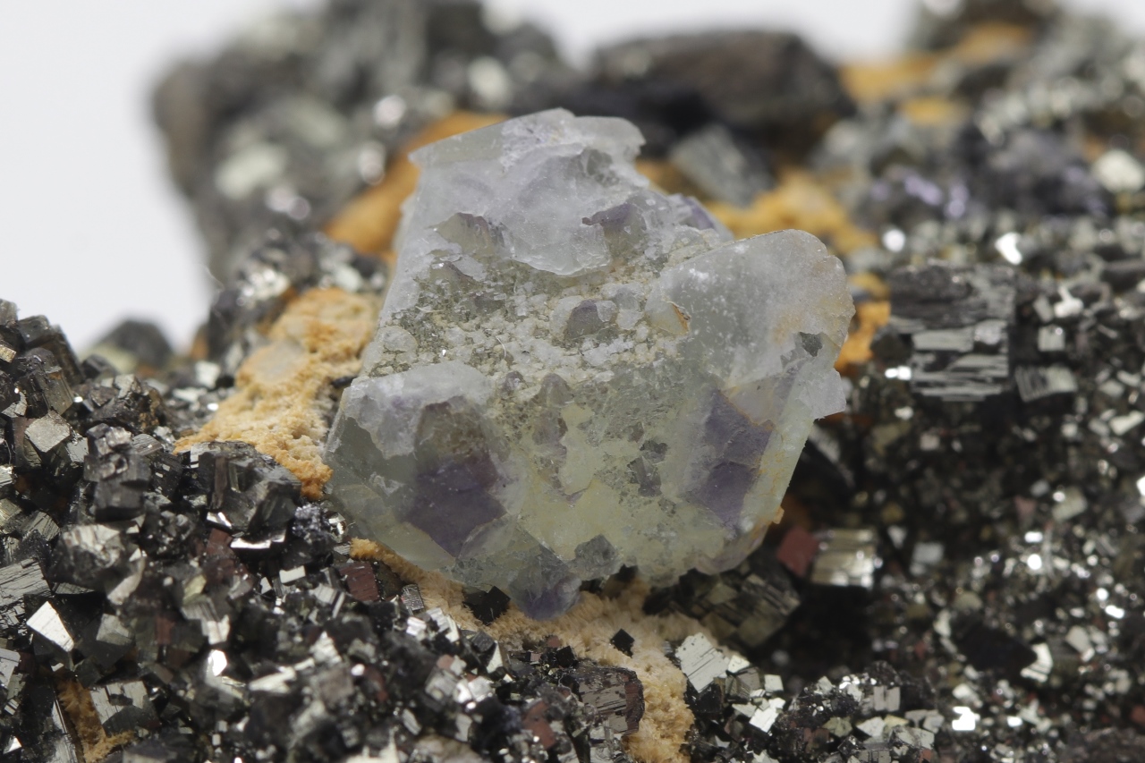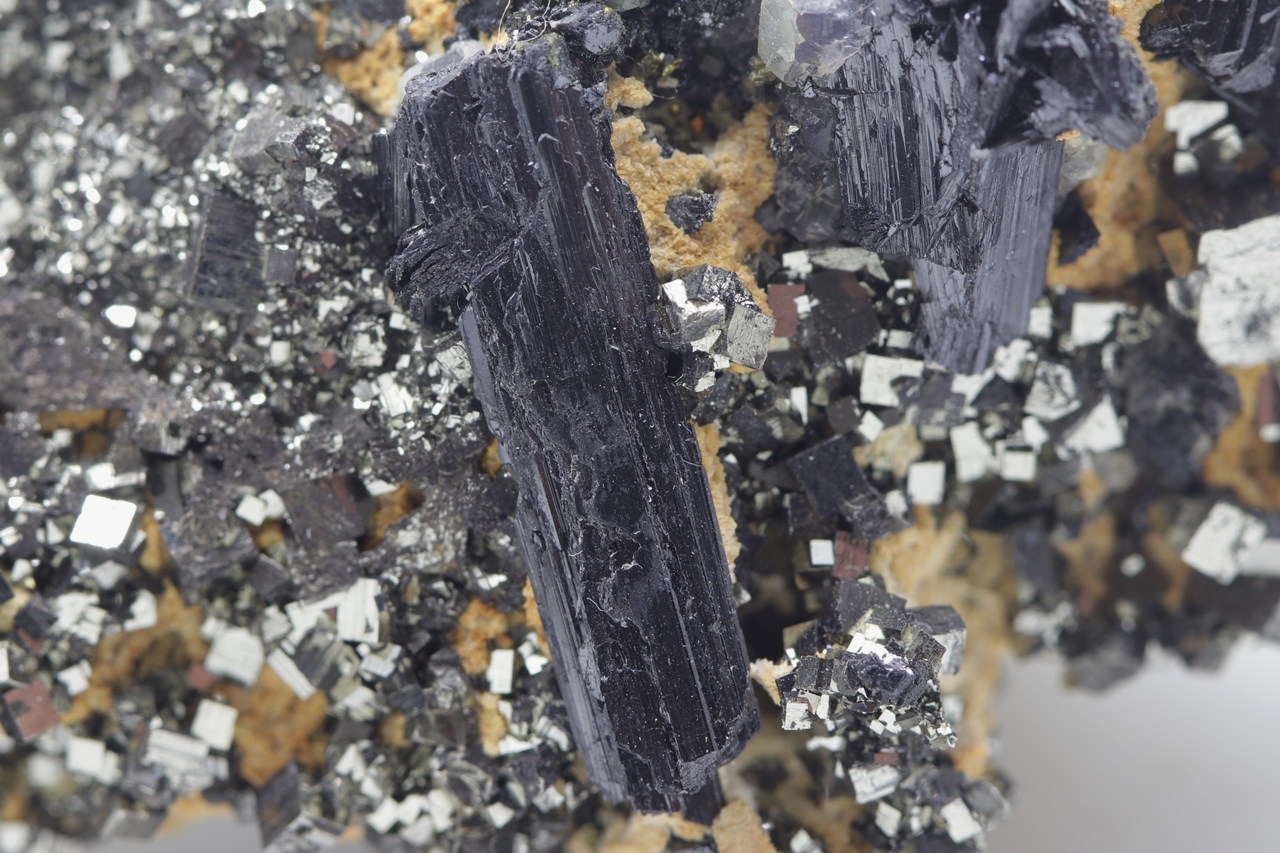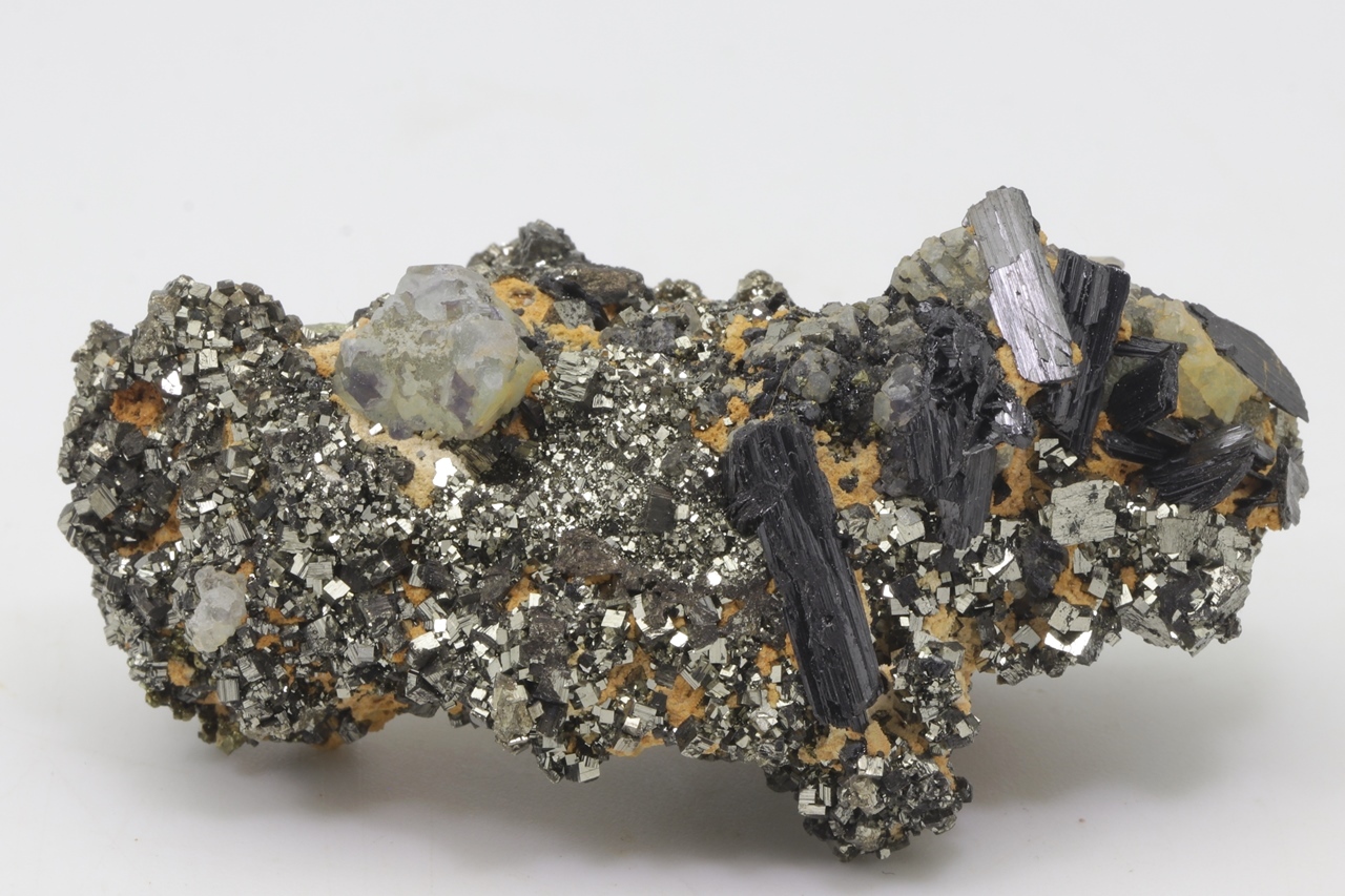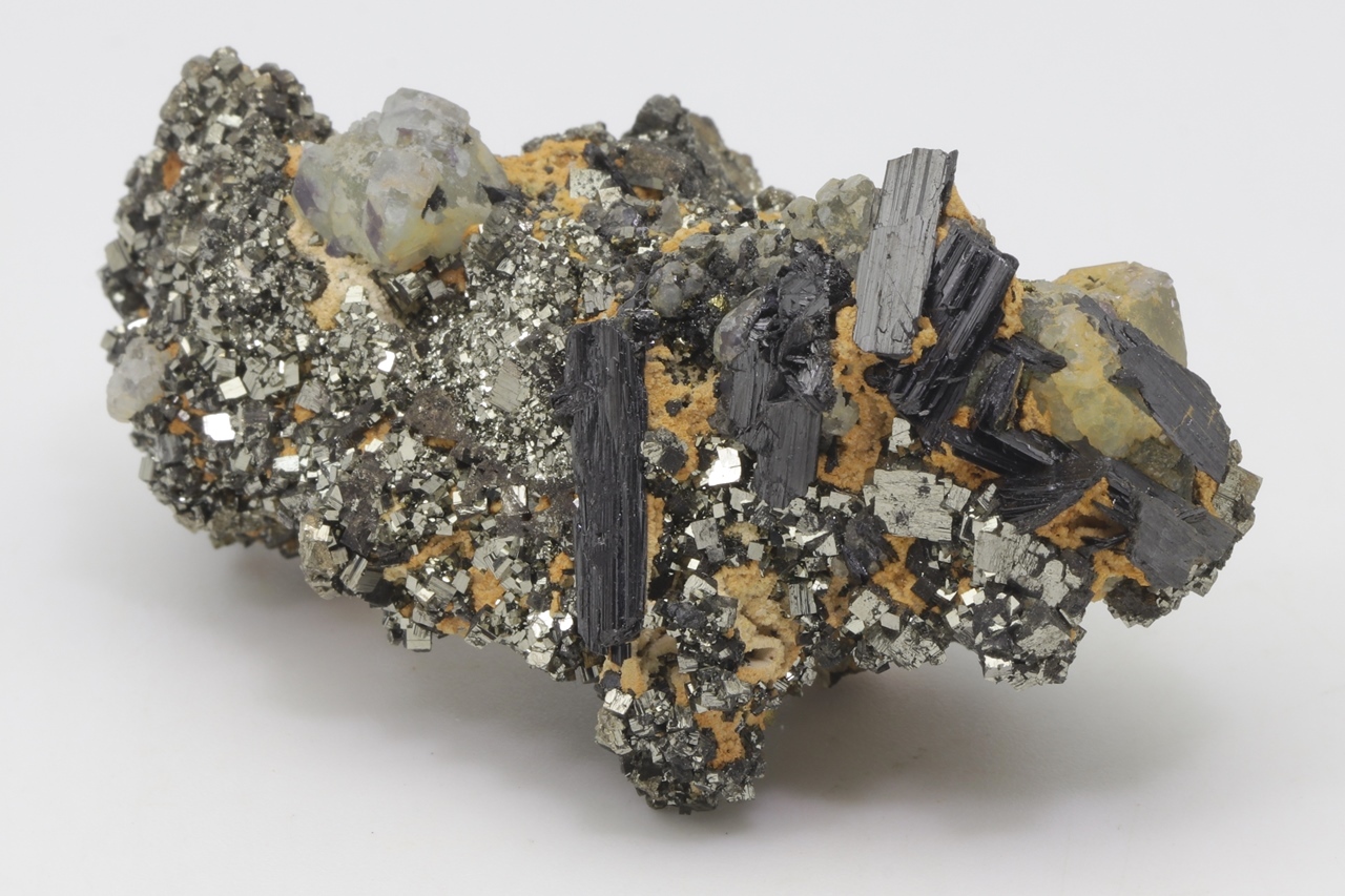 Black, elongated, tabular Wolframite crystals with characteristic striation together with an Octahedron of Fluorite grown on shiny Pyrite. The largest Wolframite crystal is 19 mm big.